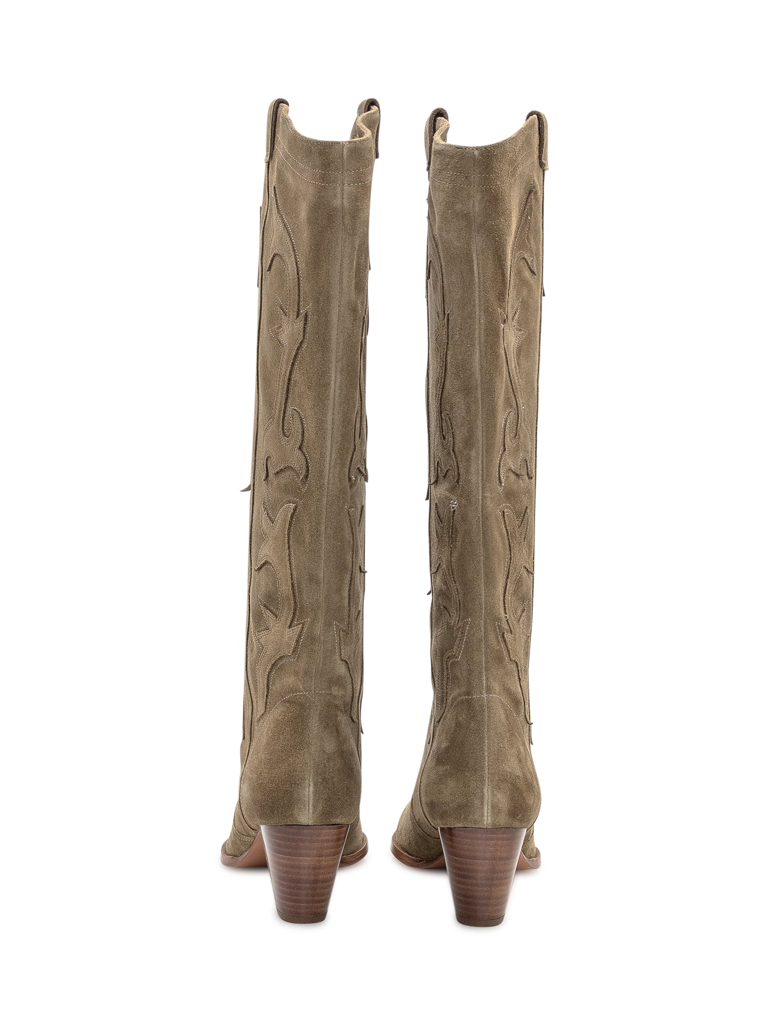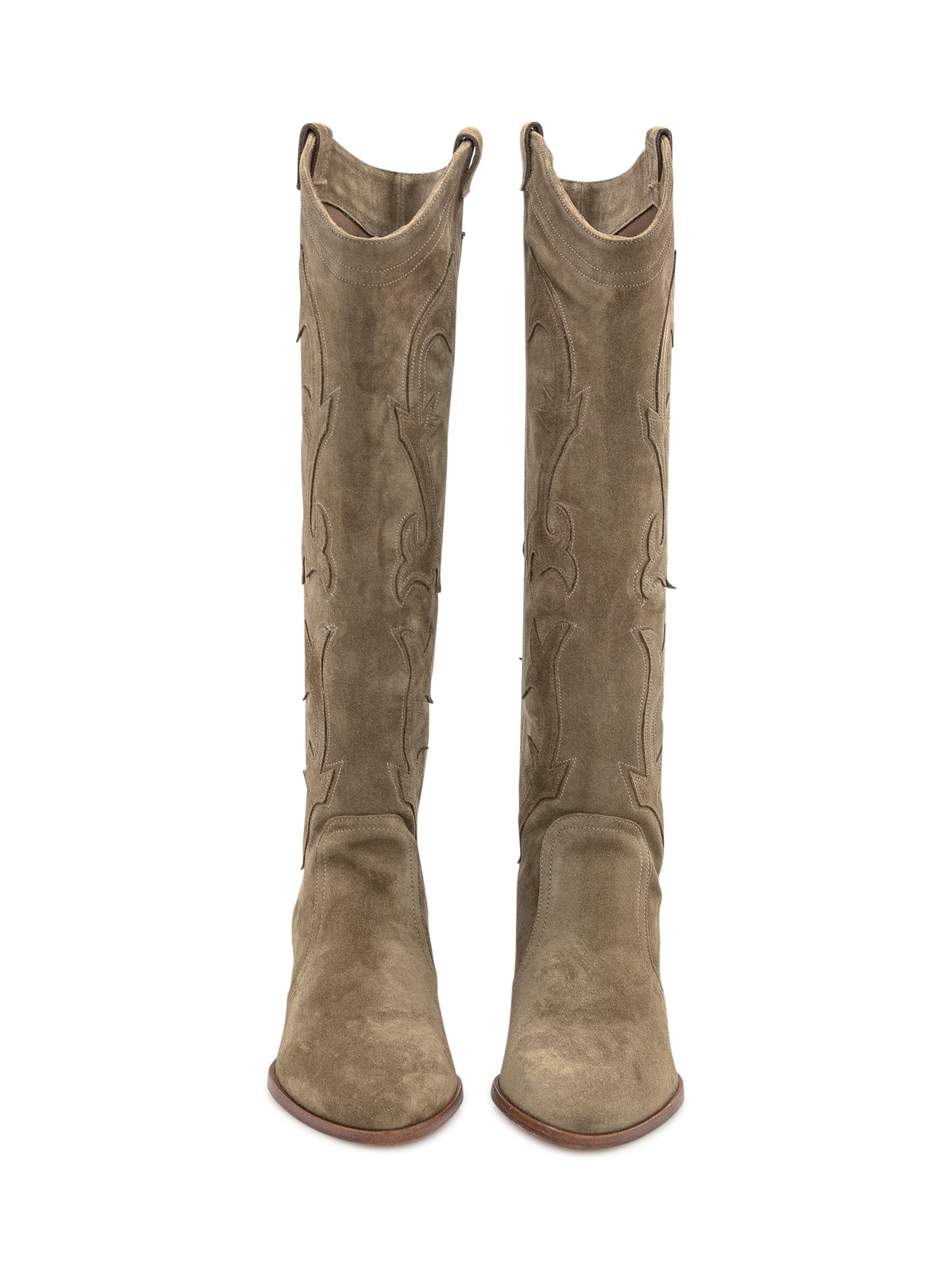 Stivali Ba&sh in camoscio marrone con dettagli ricamati e punta affusolata. Tacco medio e design ispirato allo stile western.