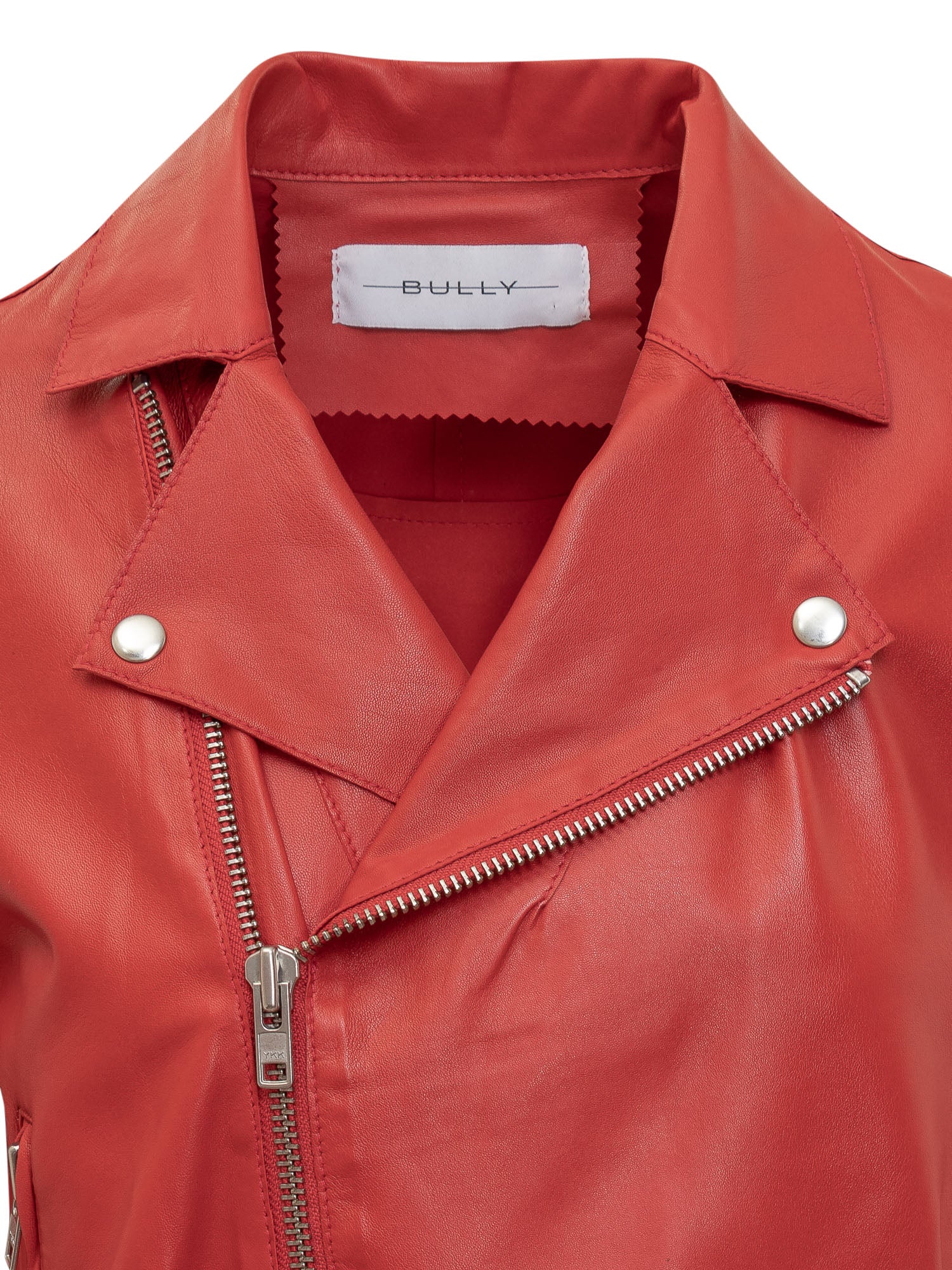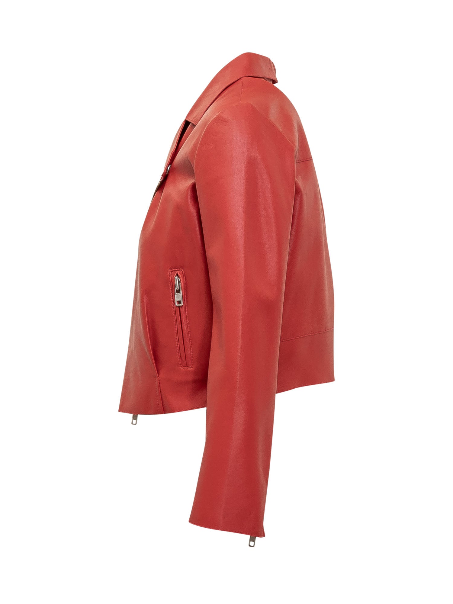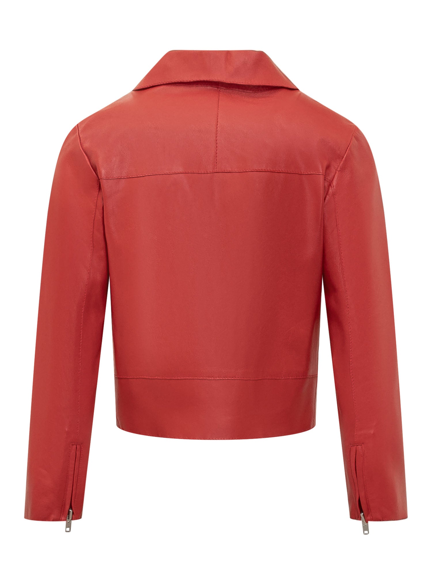 Giacca a maniche lunghe in pelle. Collo con revers e scollo a V. Chiusura con zip asimmetrica. Due tasche.
