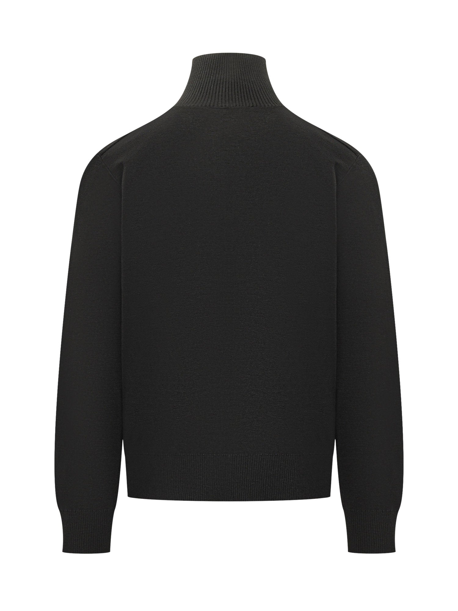 Maglione a maniche lunghe con collo alto e zip frontale. Realizzato in maglia morbida con finiture a costine, presenta un dettaglio decorativo sulla chiusura.