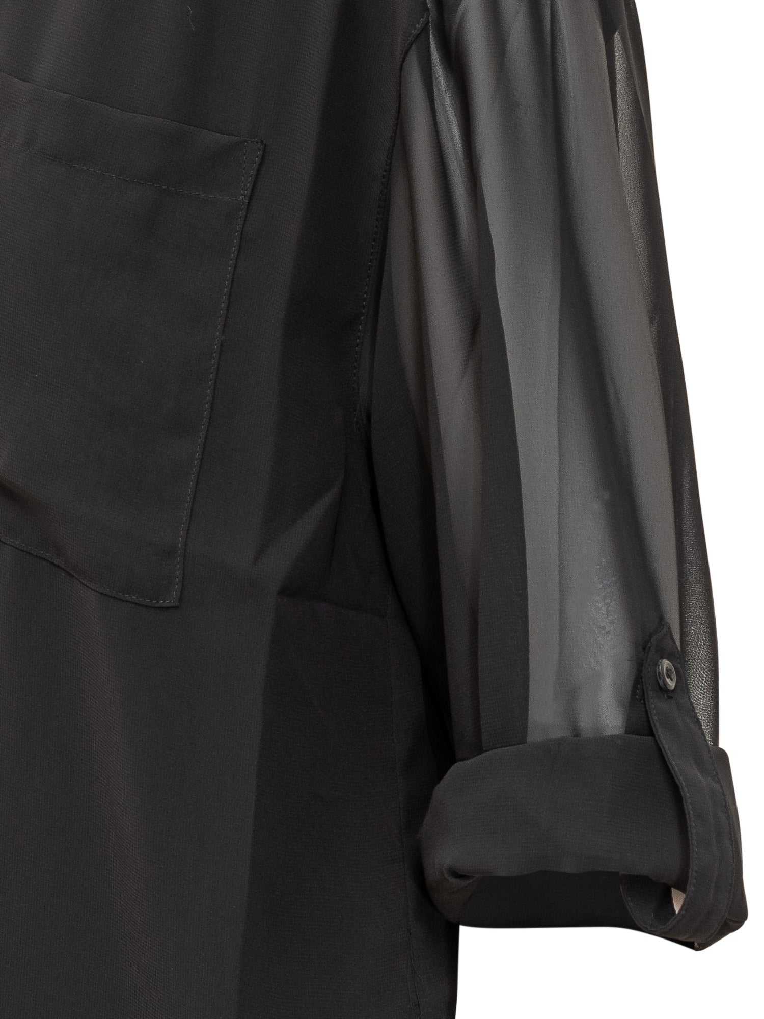 Camicia Calvin Klein in organza nera con maniche trasparenti e taschino frontale. Linea oversize e moderna.