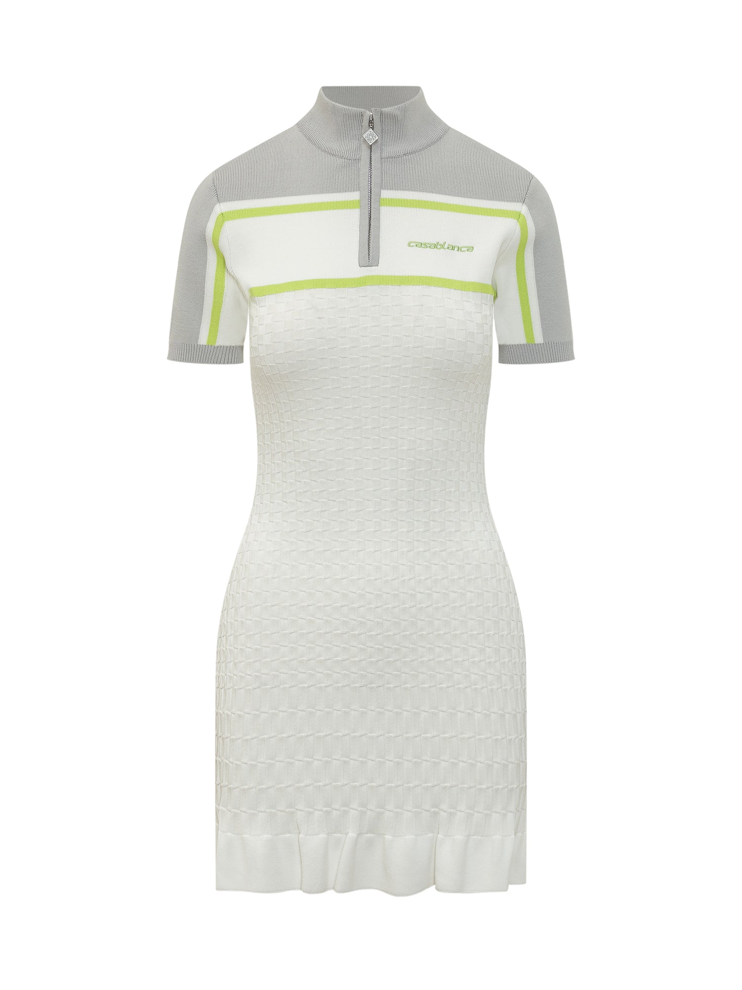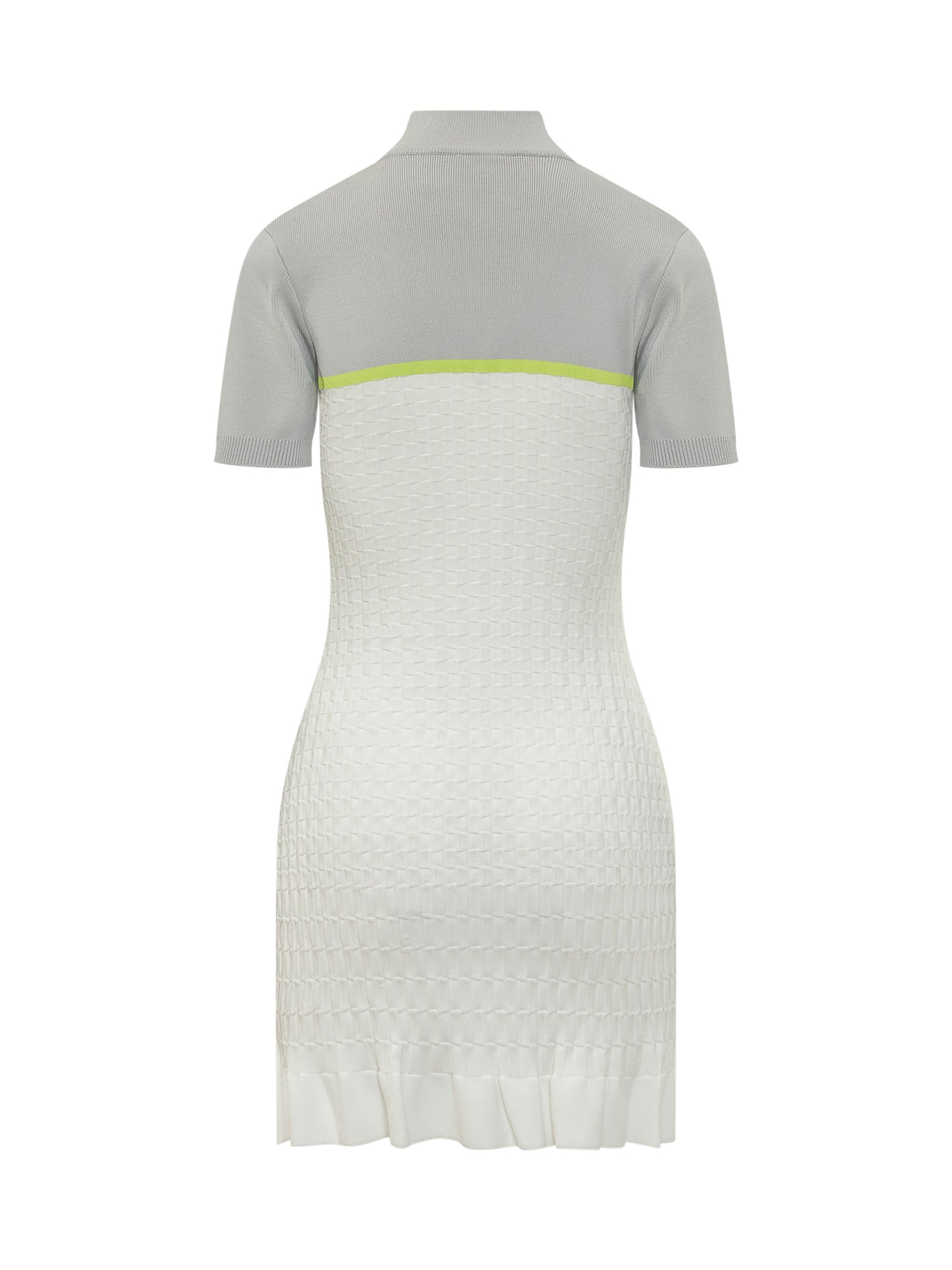 Abito polo aderente con colletto alto, chiusura con zip frontale, maniche corte, lavorazione a maglia con texture, bordo a costina sul fondo.