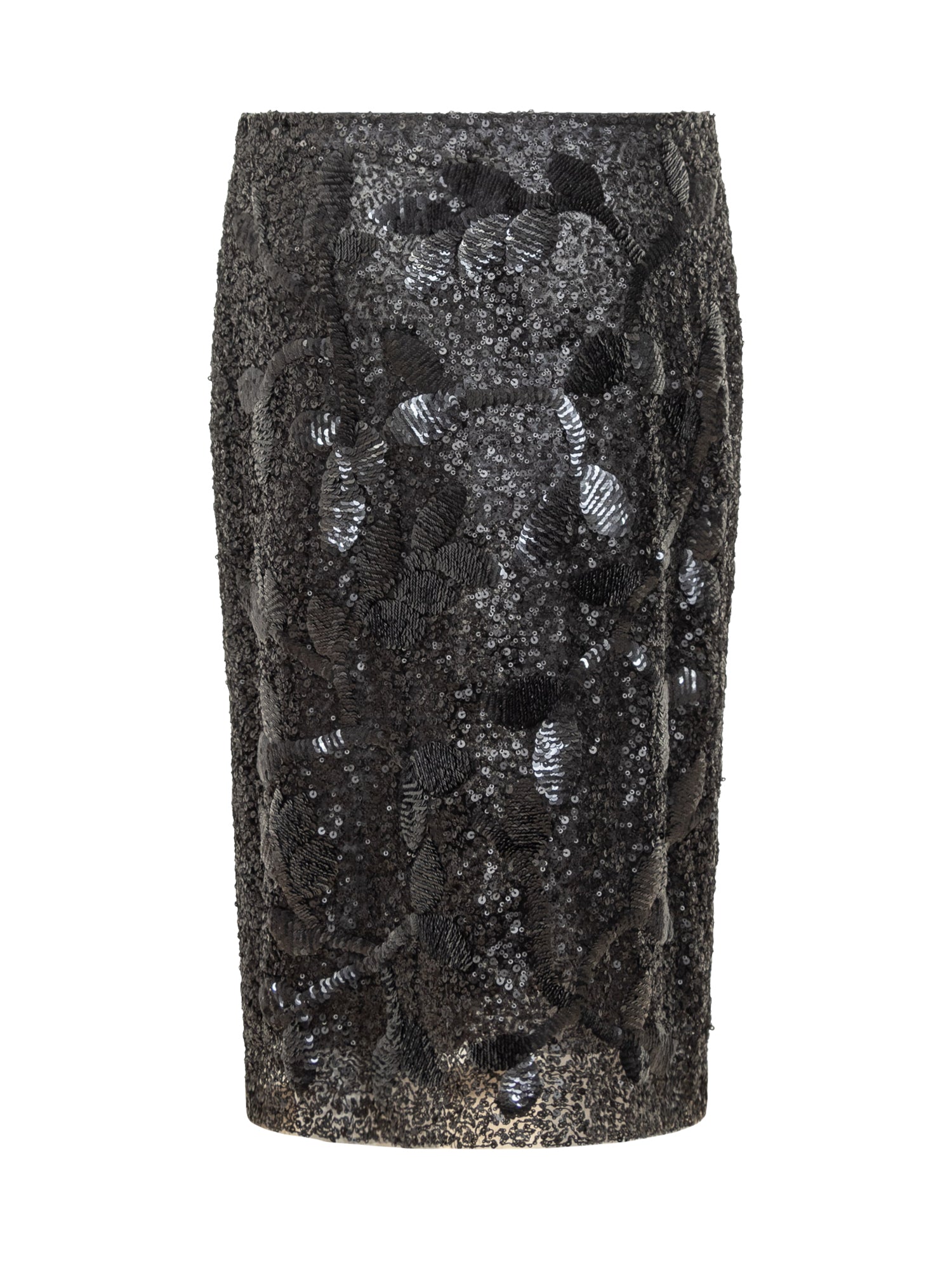 Gonna longuette. Chiusura con zip laterale. Decorazione floreale con paillettes. Foderata.