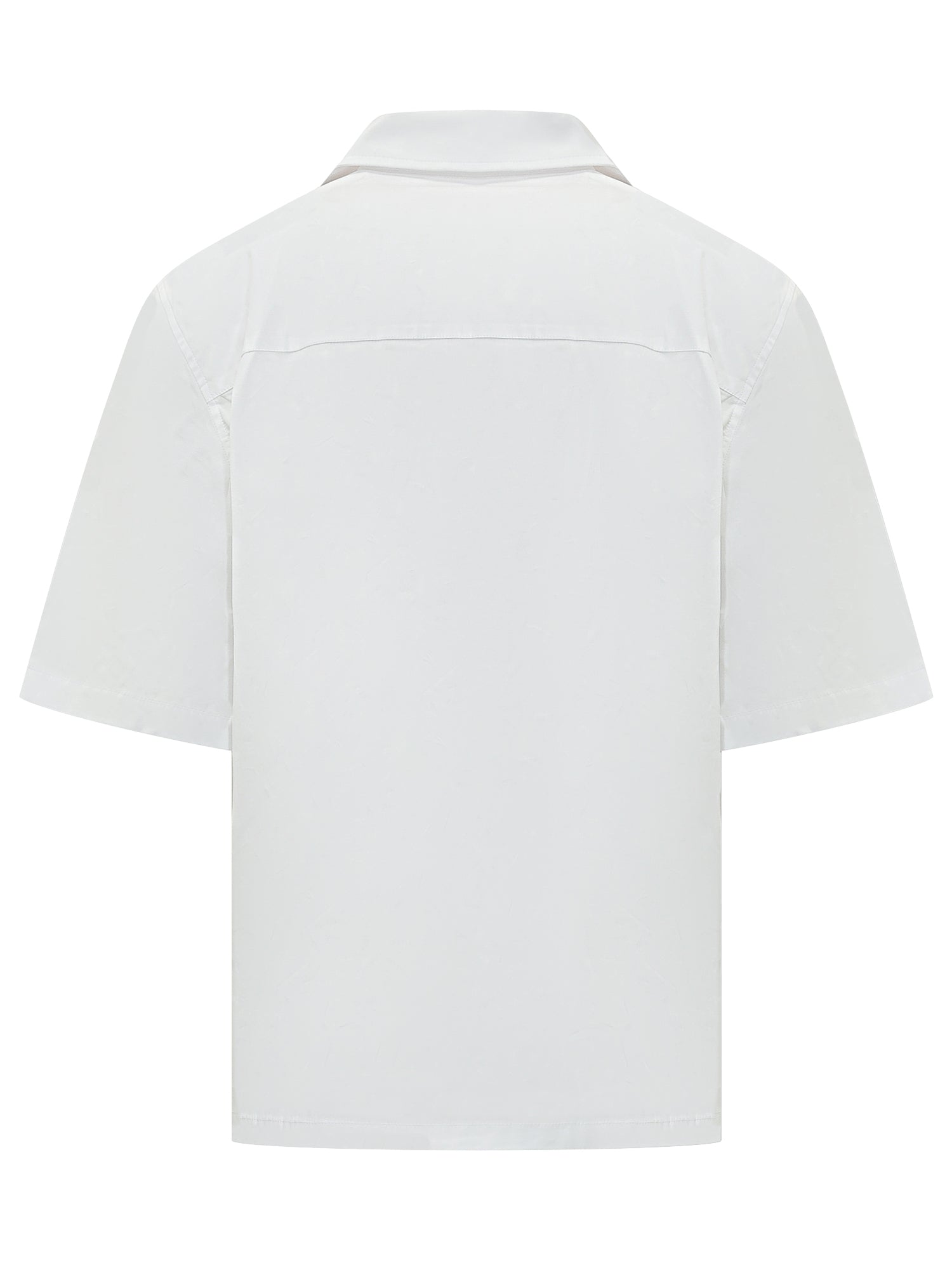Camicia a maniche corte con vestibilità regular, realizzata in tessuto liscio e leggero. Colletto aperto in stile bowling, chiusura frontale con bottoni e dettaglio applicato sul petto.