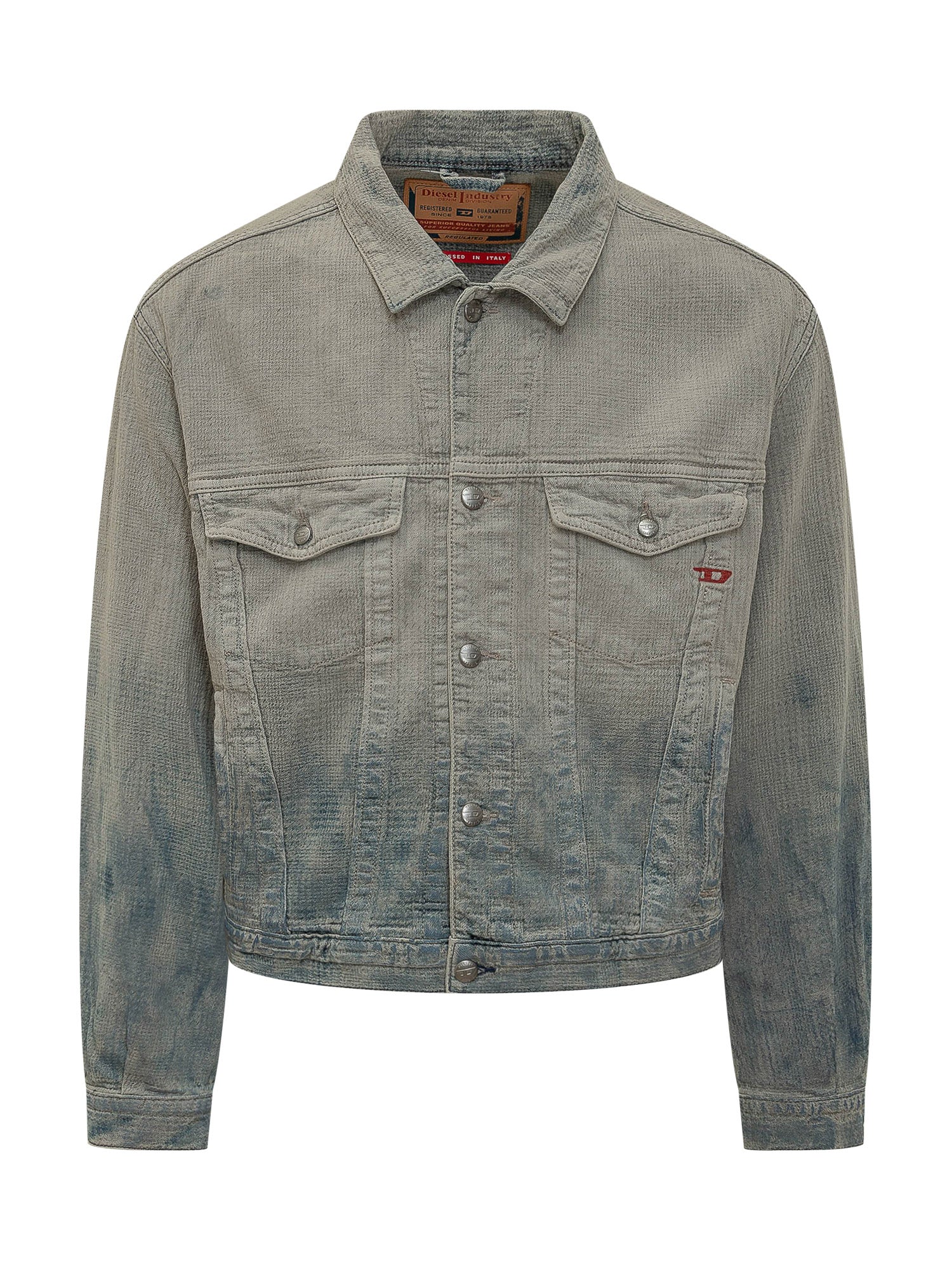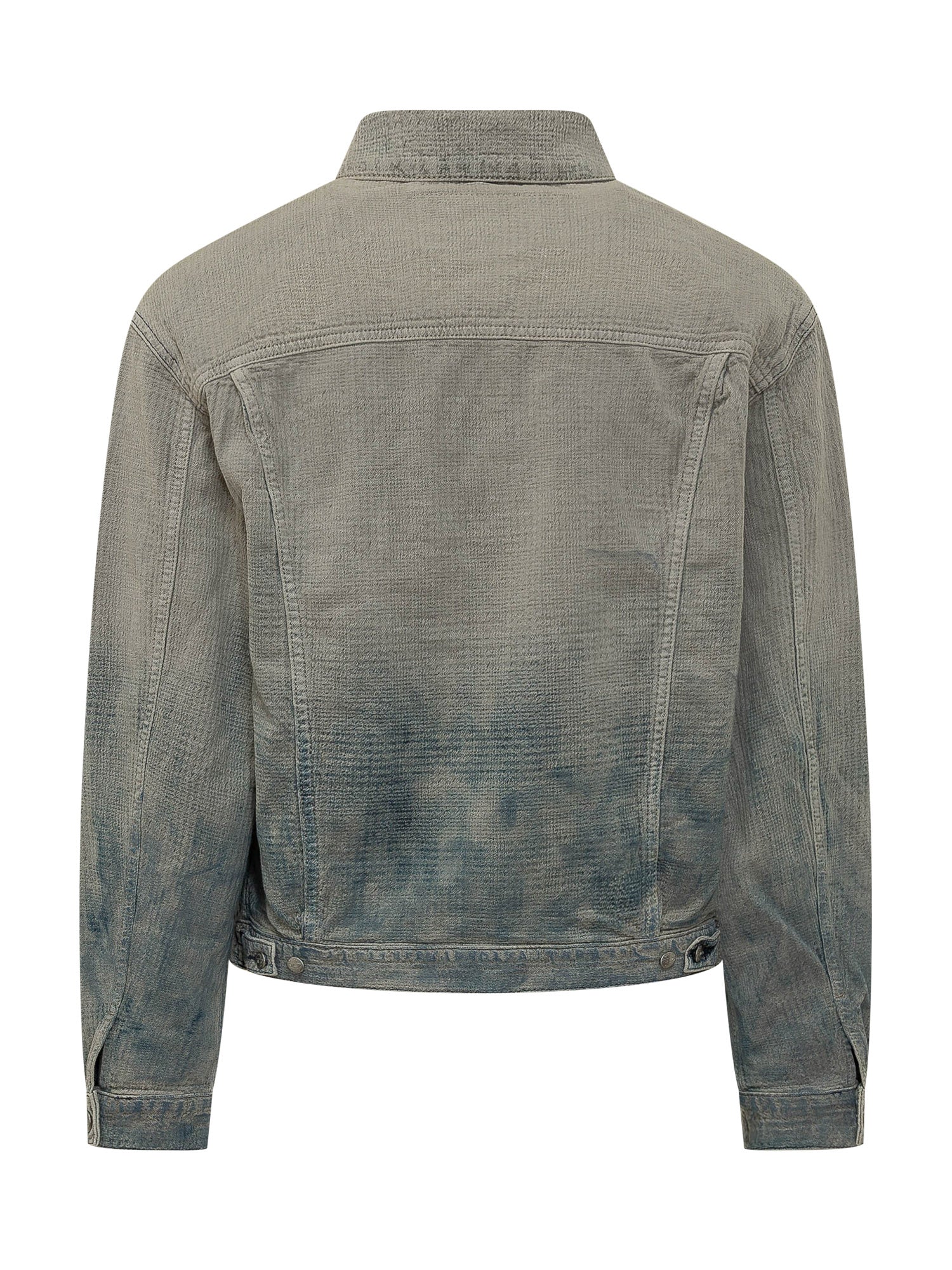 Giacca in denim con chiusura frontale e tasche applicate. Trattamento scolorito.