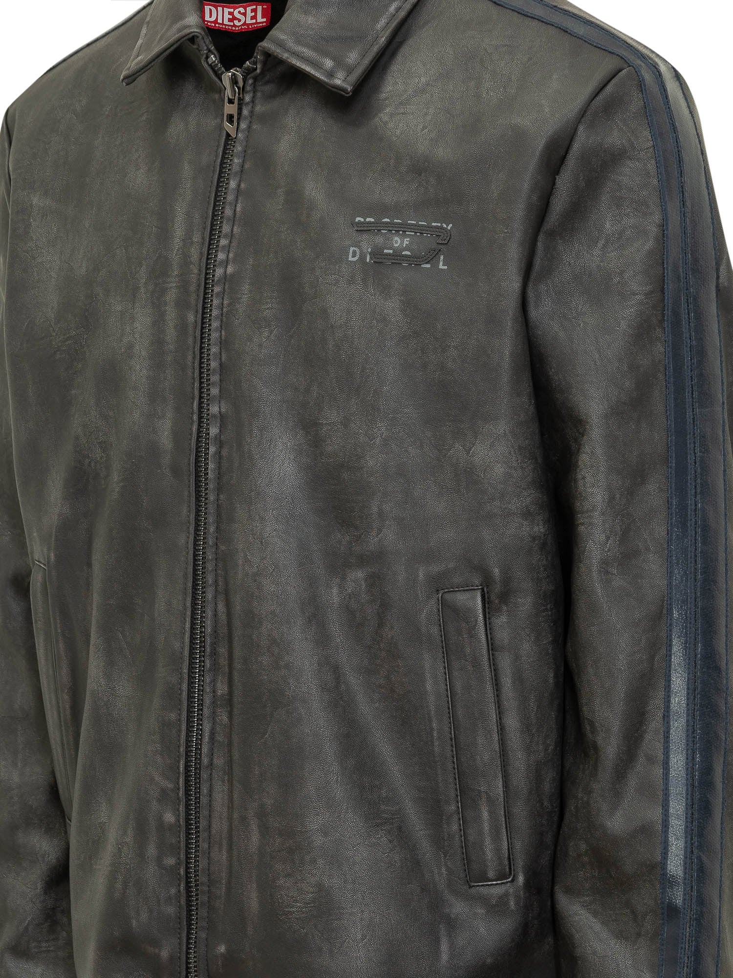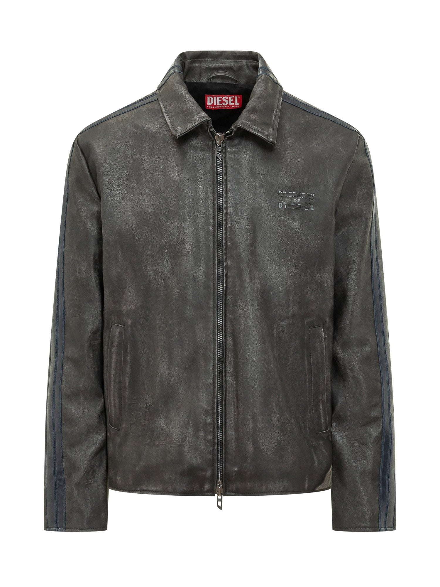 Giacca in pelle con colletto classico e chiusura frontale a zip. Modello con tasche laterali a filetto e dettagli a contrasto lungo le maniche. Effetto leggermente vintage per uno stile deciso e contemporaneo.