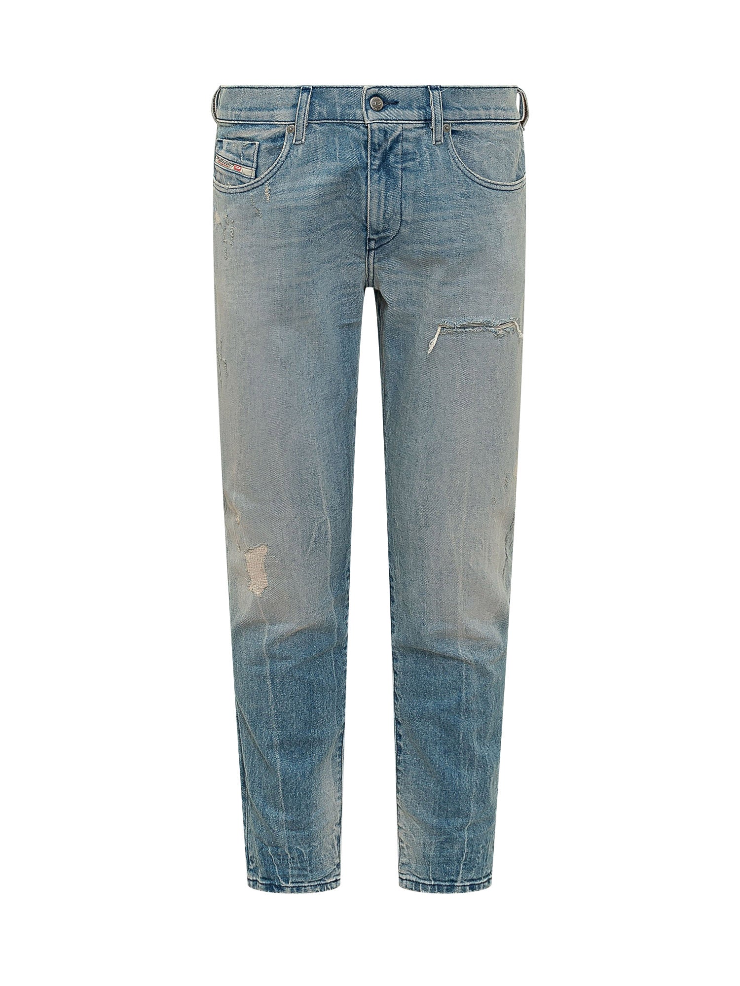 Jeans 2019 D-Strukt in denim con lavaggio effetto vissuto e dettagli distressed, caratterizzati da vestibilità slim contemporanea, cinque tasche e passanti per cintura, completati da chiusura frontale con zip e bottone.