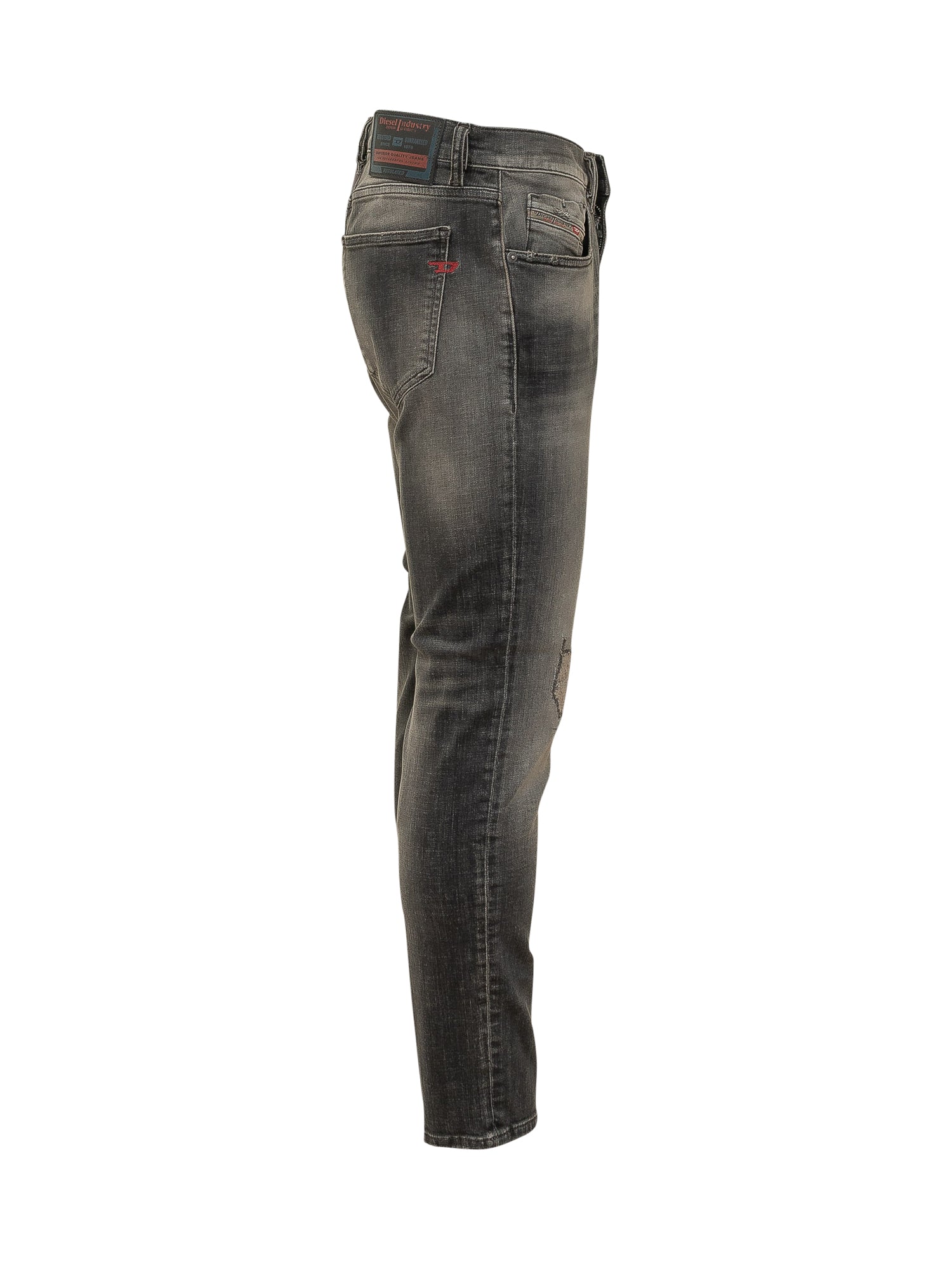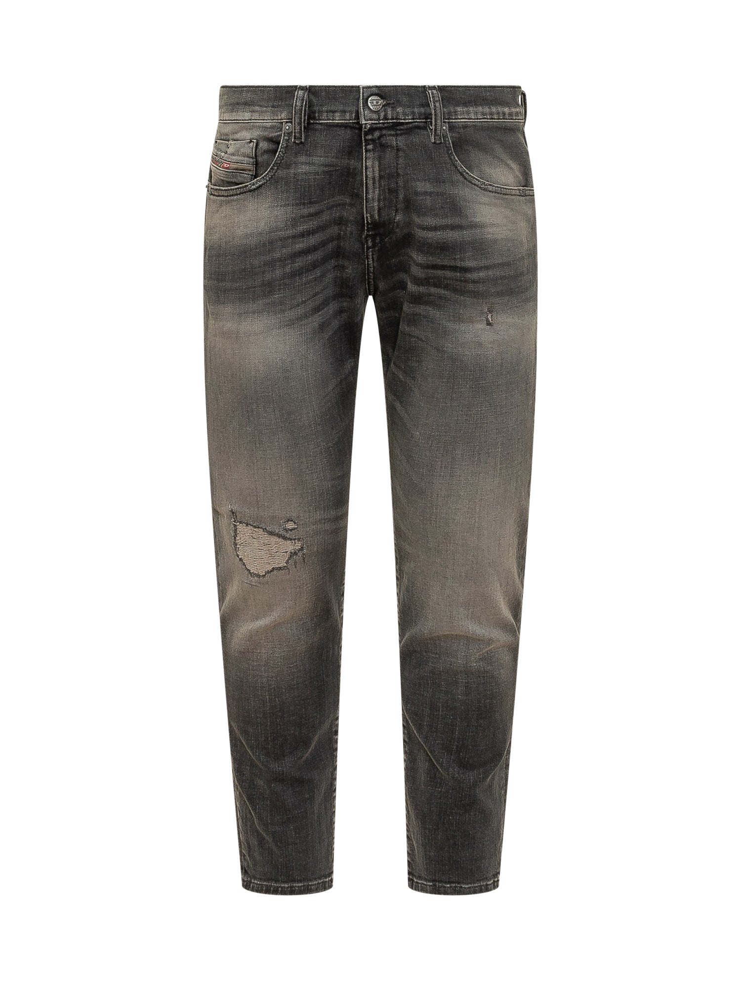 Jeans 2019 D-Strukt in denim con lavaggio effetto used e sfumature irregolari, caratterizzati da vestibilità slim, cinque tasche e dettagli distressed localizzati, completati da passanti per cintura e chiusura frontale con zip e bottone.