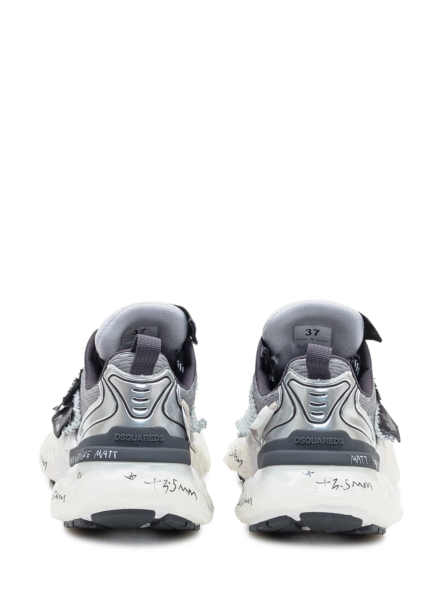 Sneakers Dsquared2 grigie con dettagli in mesh e pelle, suola chunky con scritte a contrasto e inserti in tessuto tecnico.
