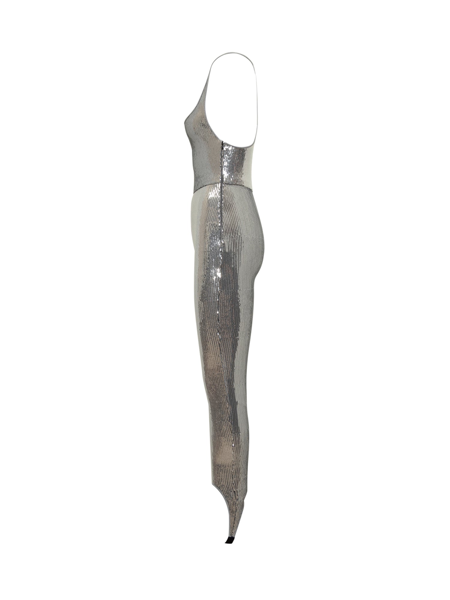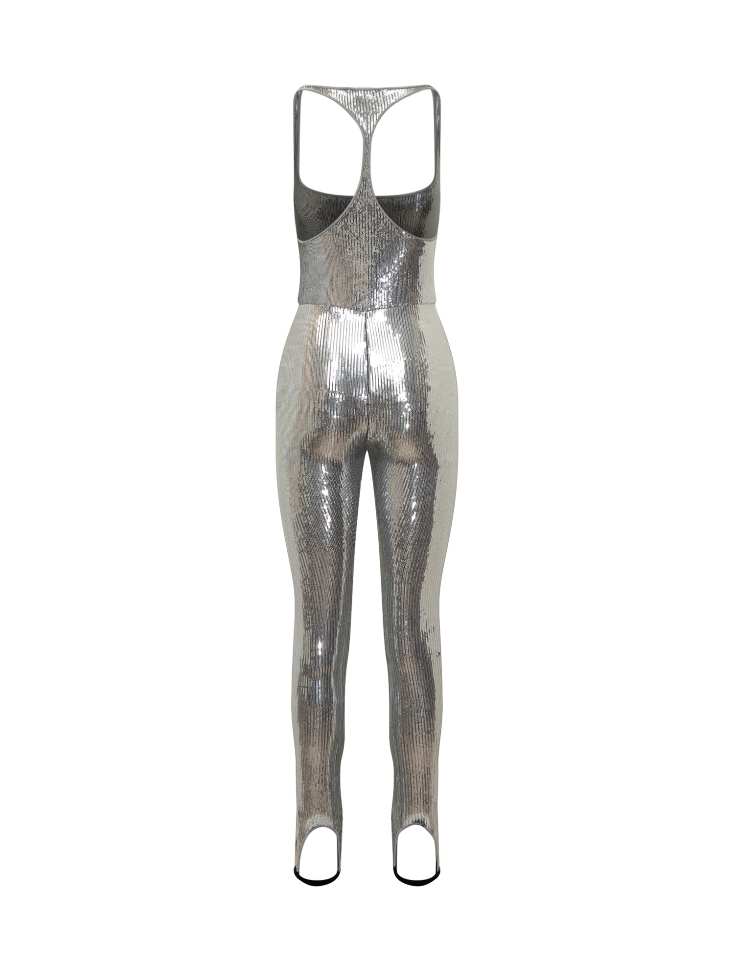 Tuta intera DSquared2 in tessuto stretch ricoperto di paillettes argento. Modello aderente con spalline sottili e passanti sotto il piede.