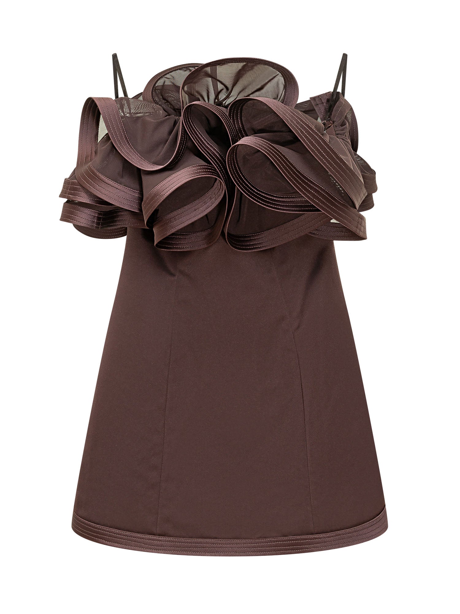 Abito mini con spalline sottili e maxi balza strutturata sul busto. Linea svasata e chiusura posteriore nascosta.
