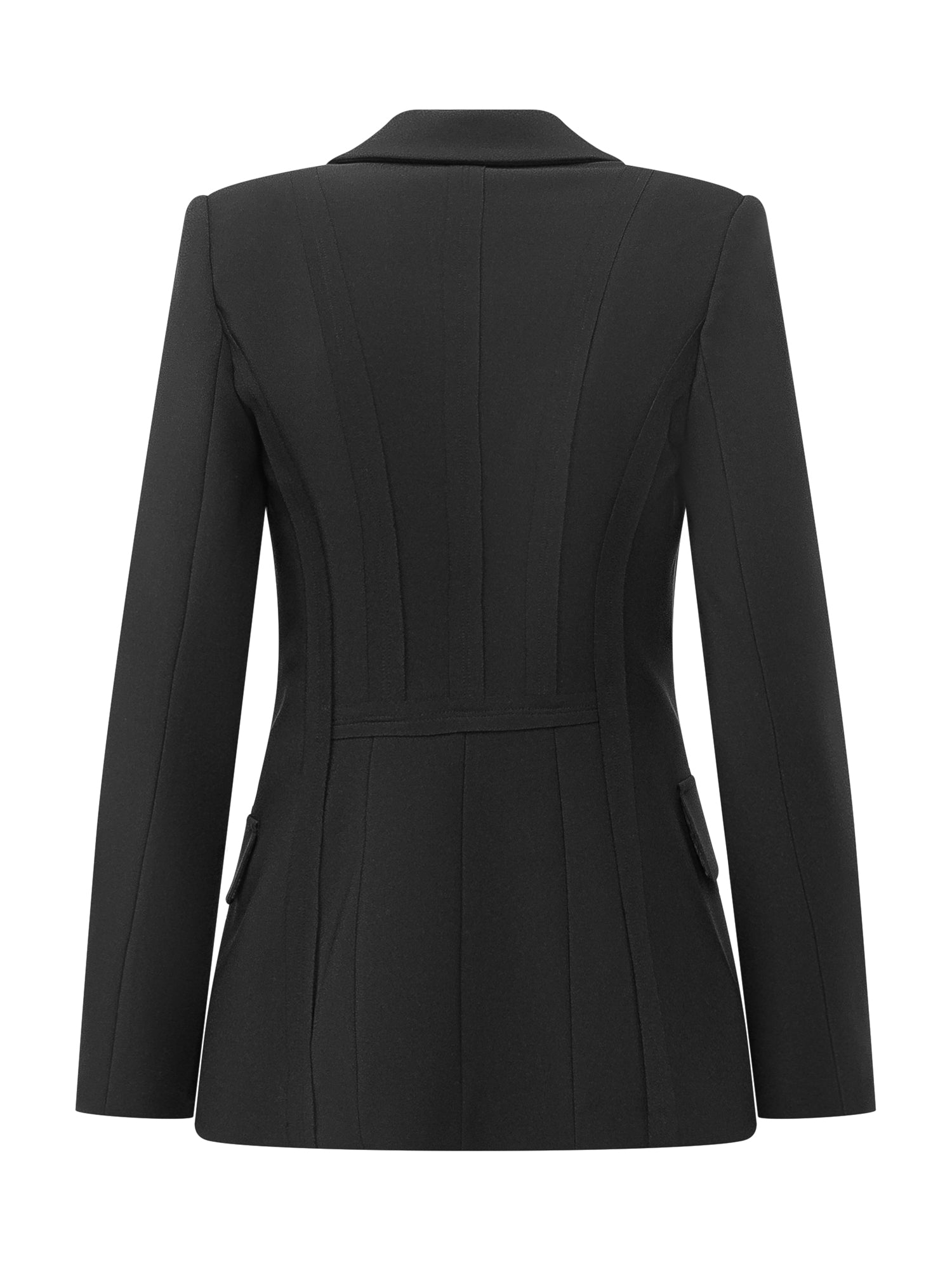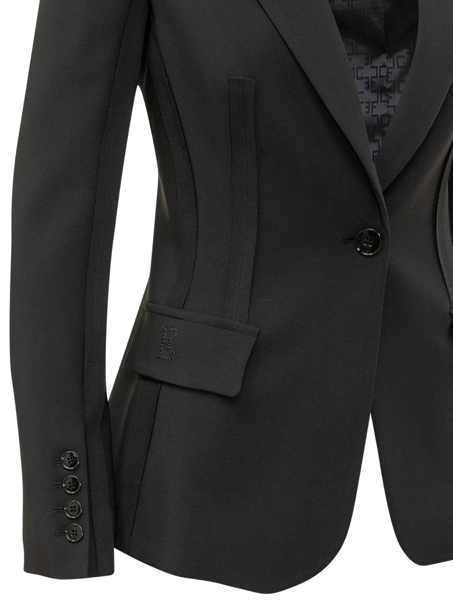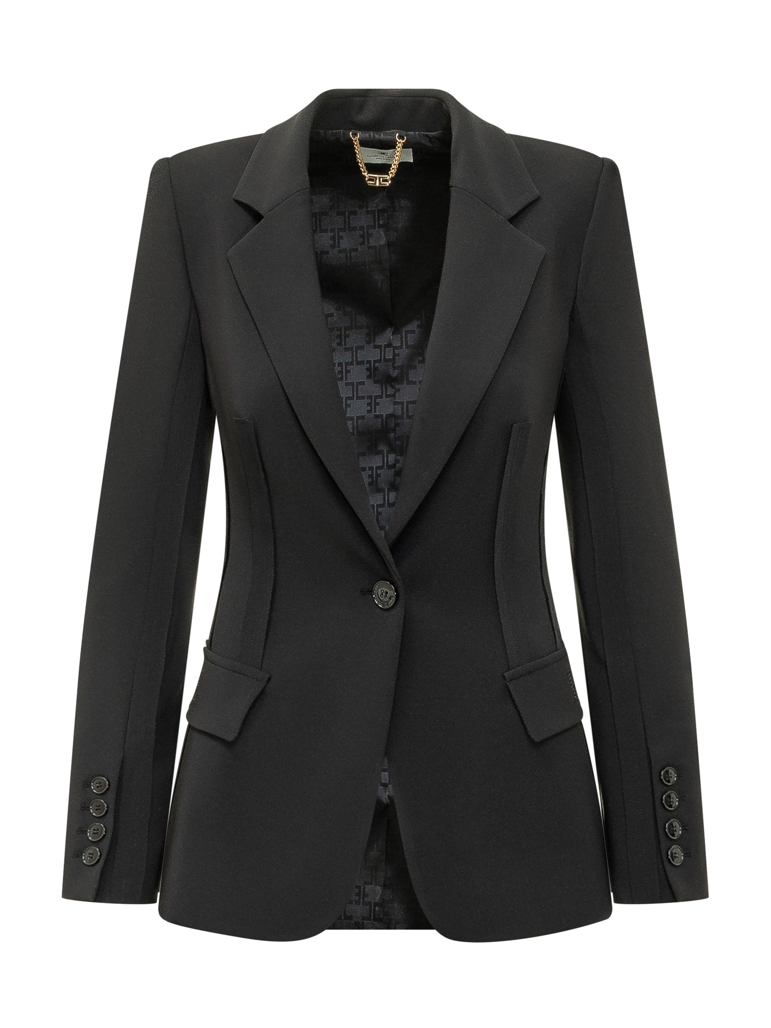 Giacca monopetto nera dal taglio sartoriale, con revers classici, chiusura a un bottone e tasche con patta. Linea strutturata che valorizza la silhouette, perfetta per look eleganti e formali dal carattere deciso.