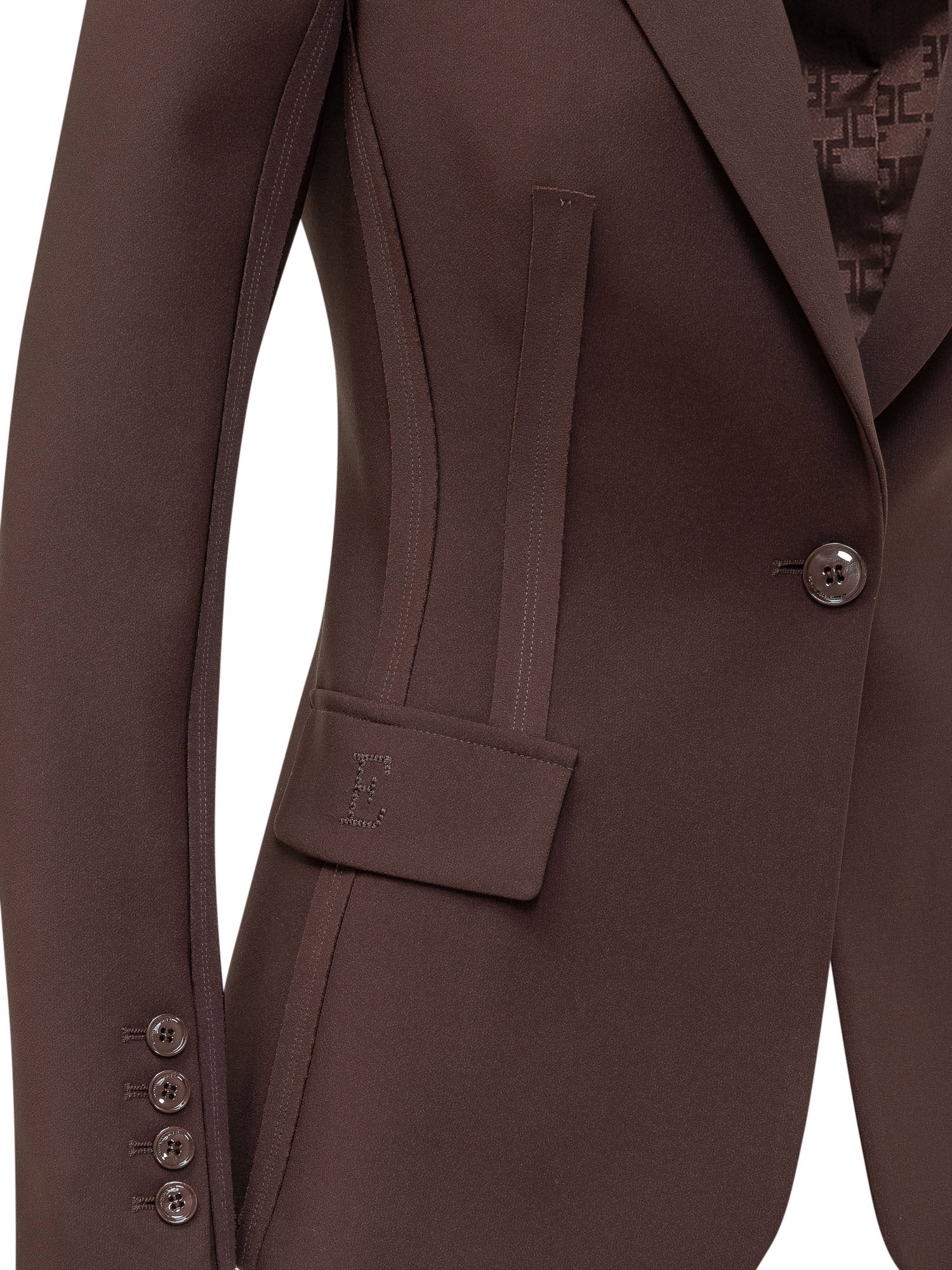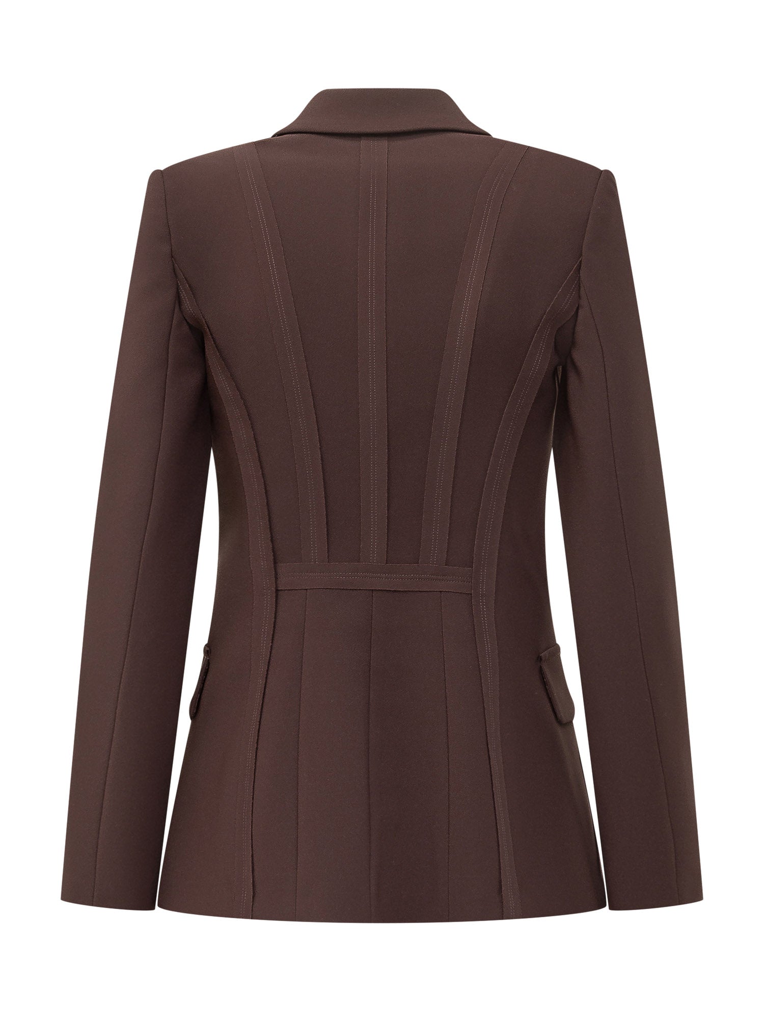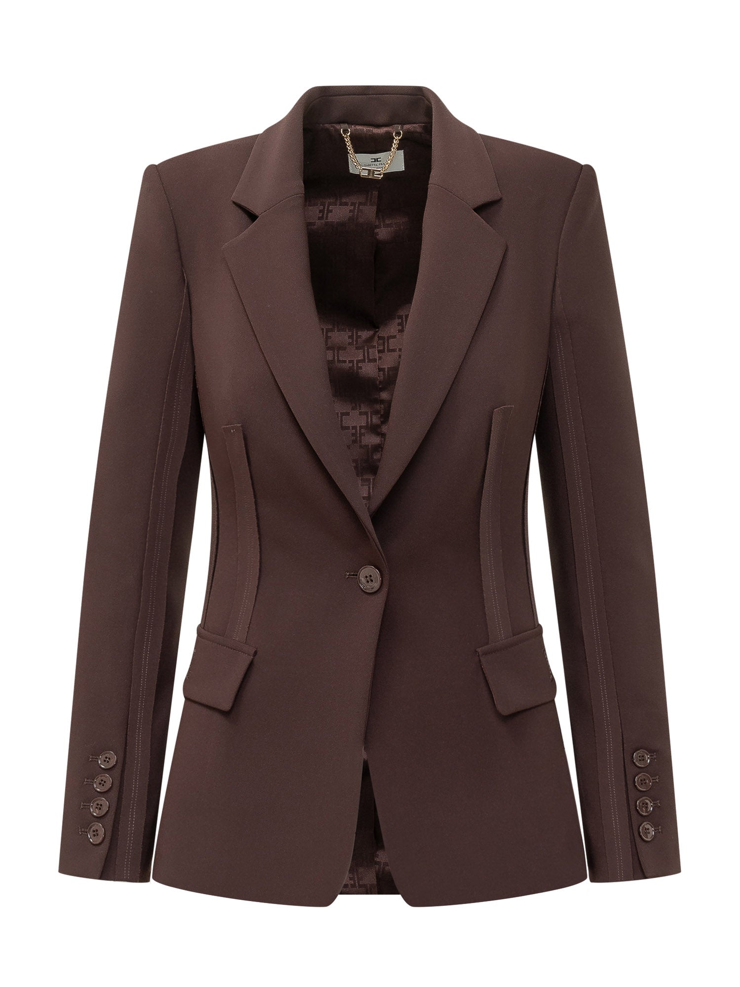 Giacca monopetto marrone dal taglio sartoriale, con revers classici, chiusura a un bottone e tasche con patta. Linea strutturata che definisce la silhouette, ideale per look eleganti e contemporanei dal fascino sofisticato.