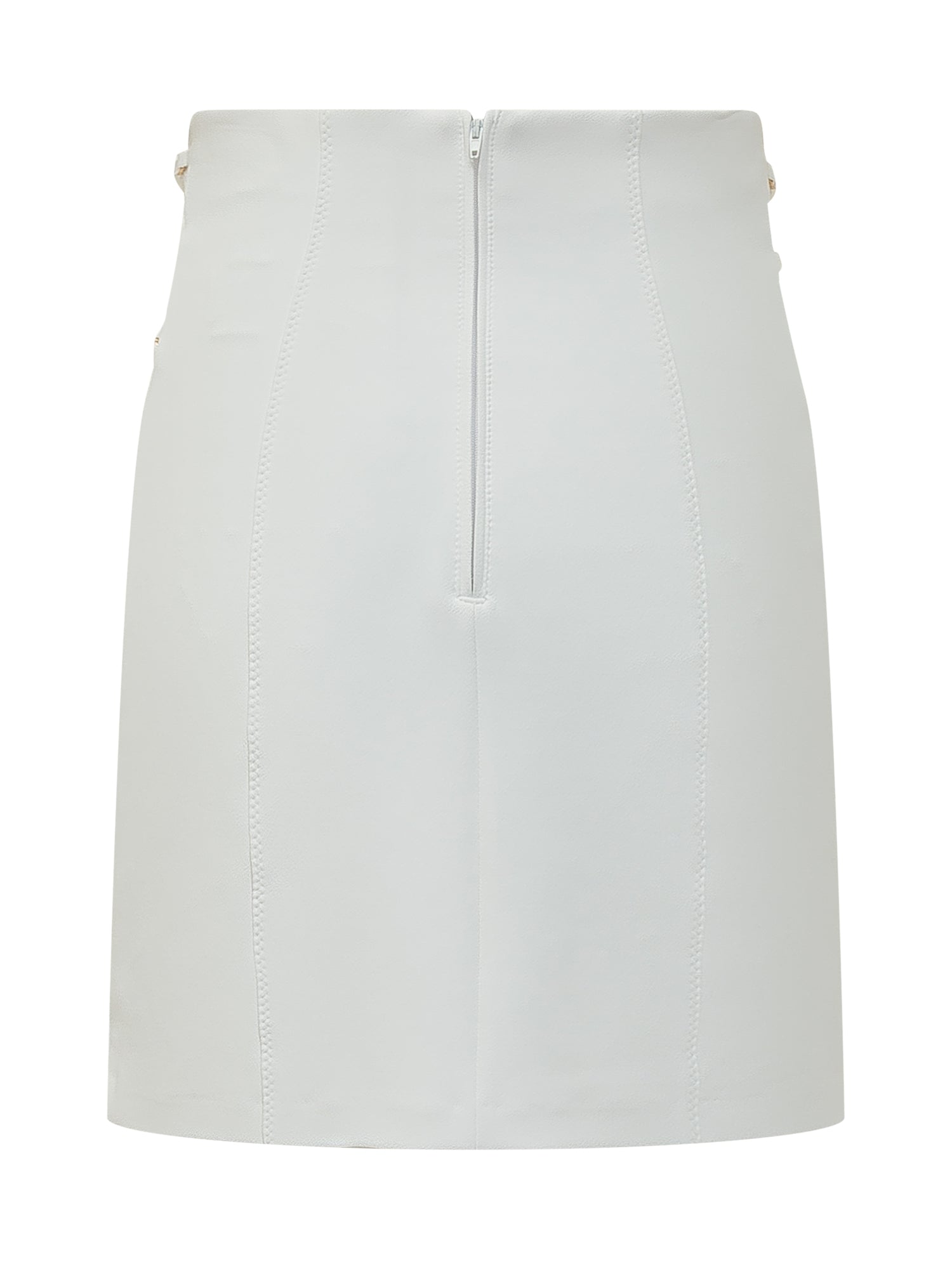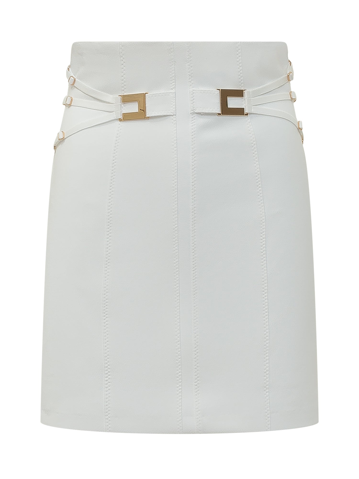 Gonna bianca dal design elegante e strutturato, caratterizzata da linee verticali e dettagli con cinturini decorativi e fibbie dorate in vita. Silhouette raffinata e femminile, perfetta per look sofisticati da giorno e da sera.