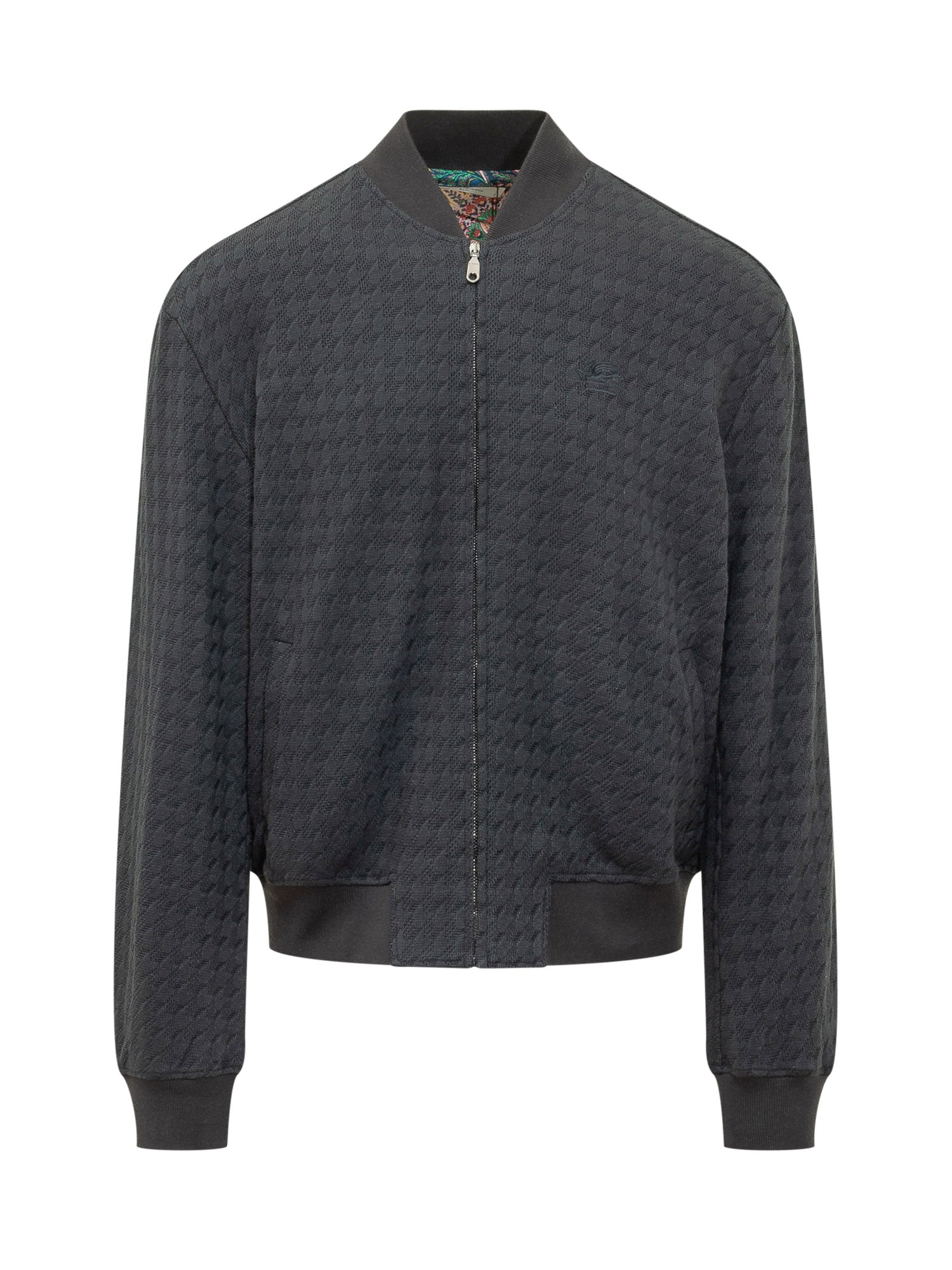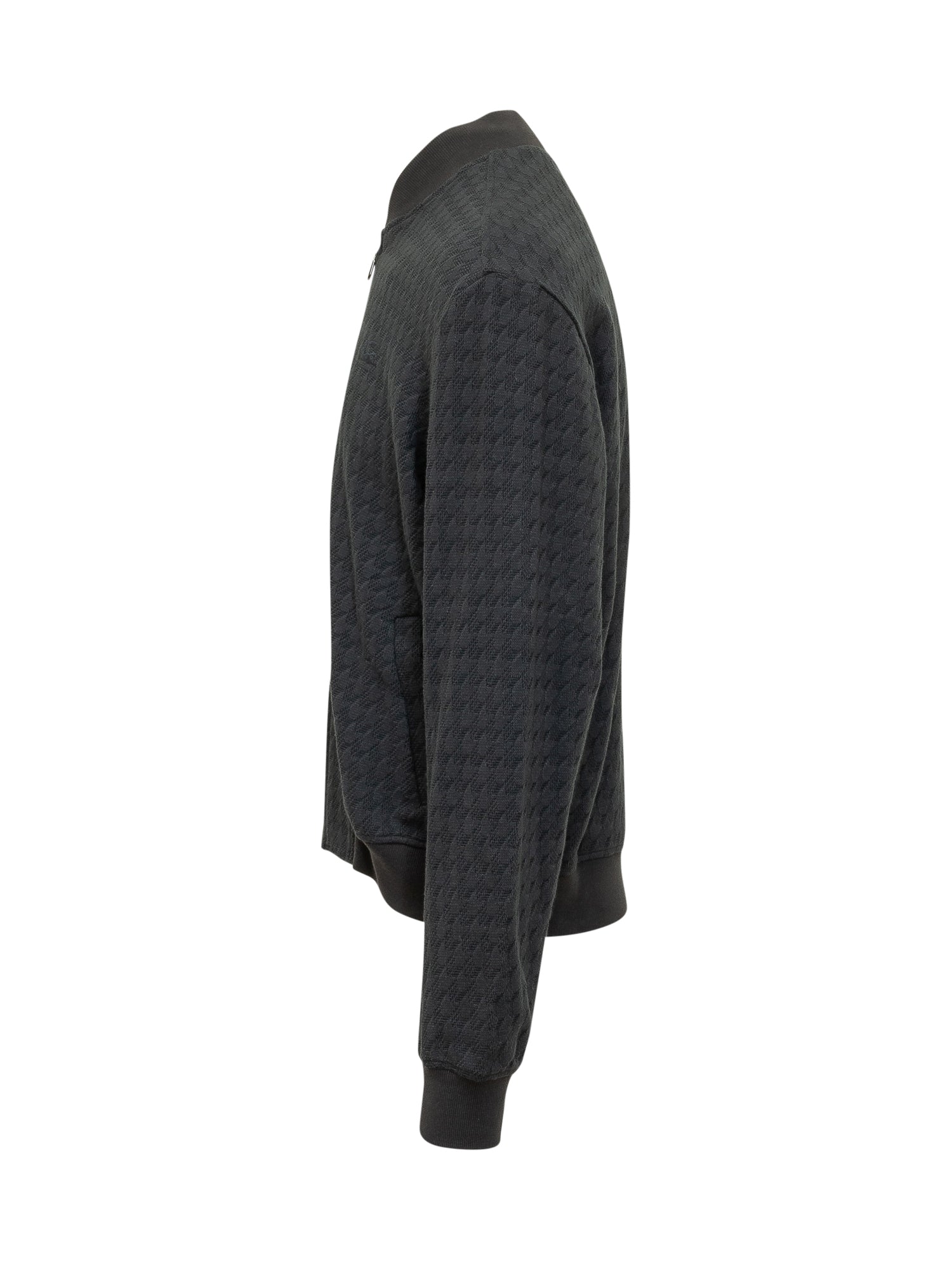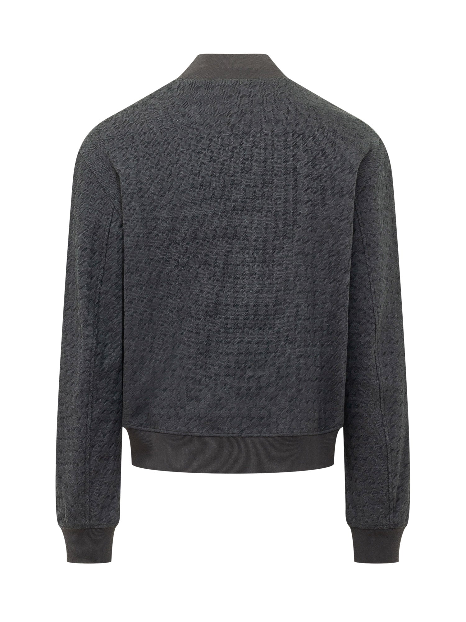 Bomber con chiusura frontale con zip e collo alto, maniche lunghe con polsini e fondo elasticizzati, texture lavorata su tutta la superficie e logo tono su tono sul petto, design corto con tasche laterali.