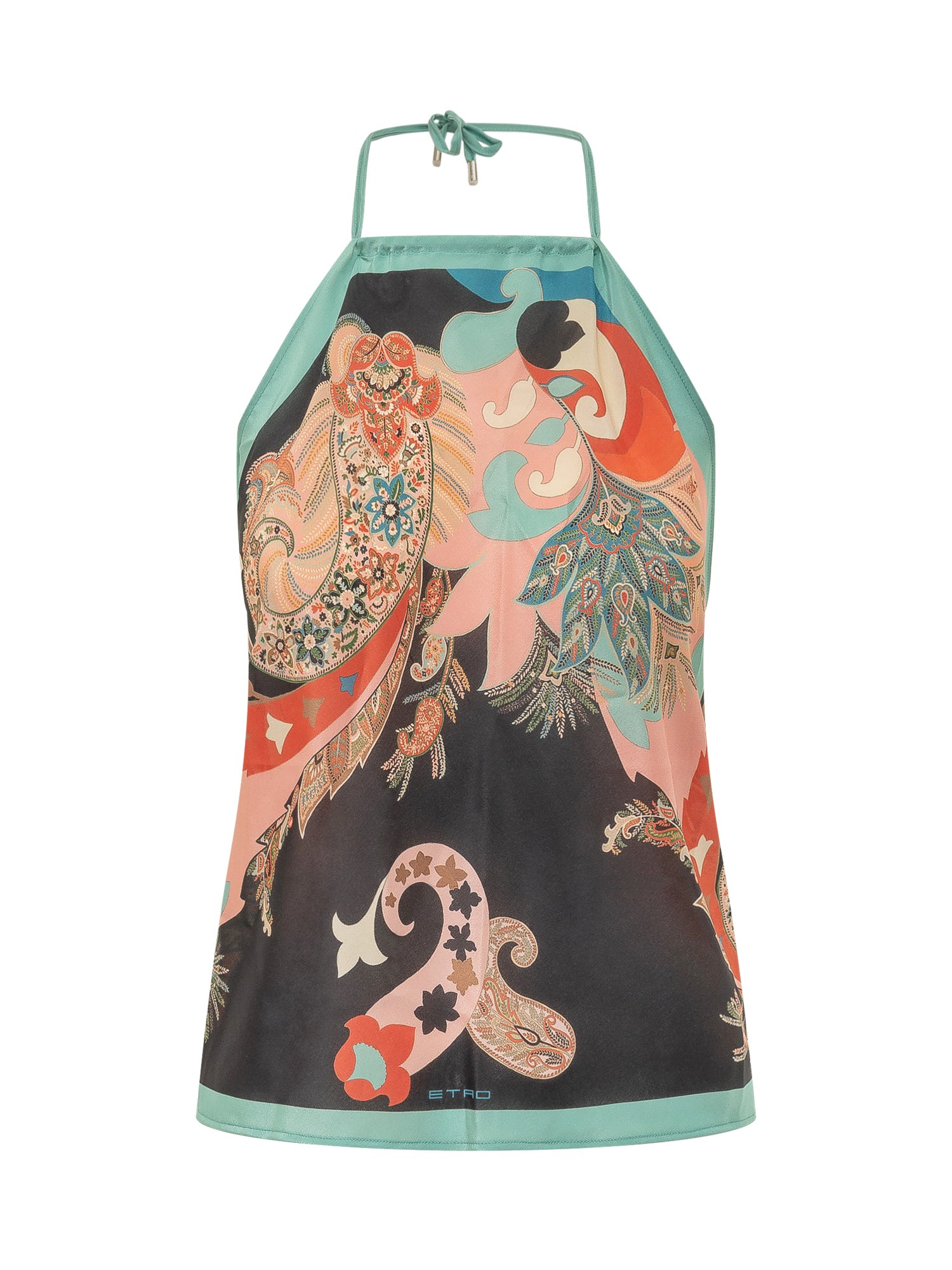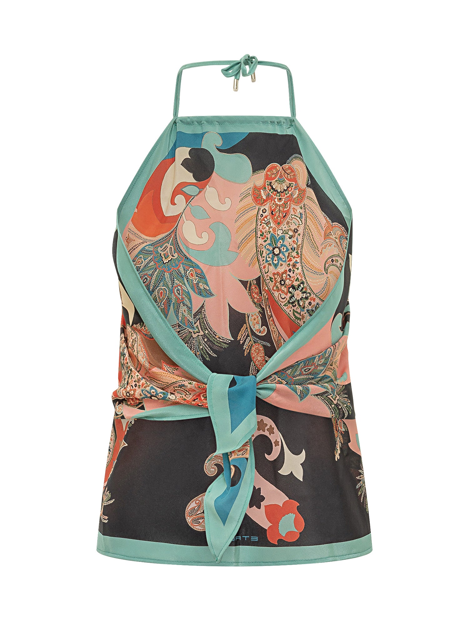 Top a triangolo con laccetti sottili e scollo all americana. Motivo decorativo e linea aderente.