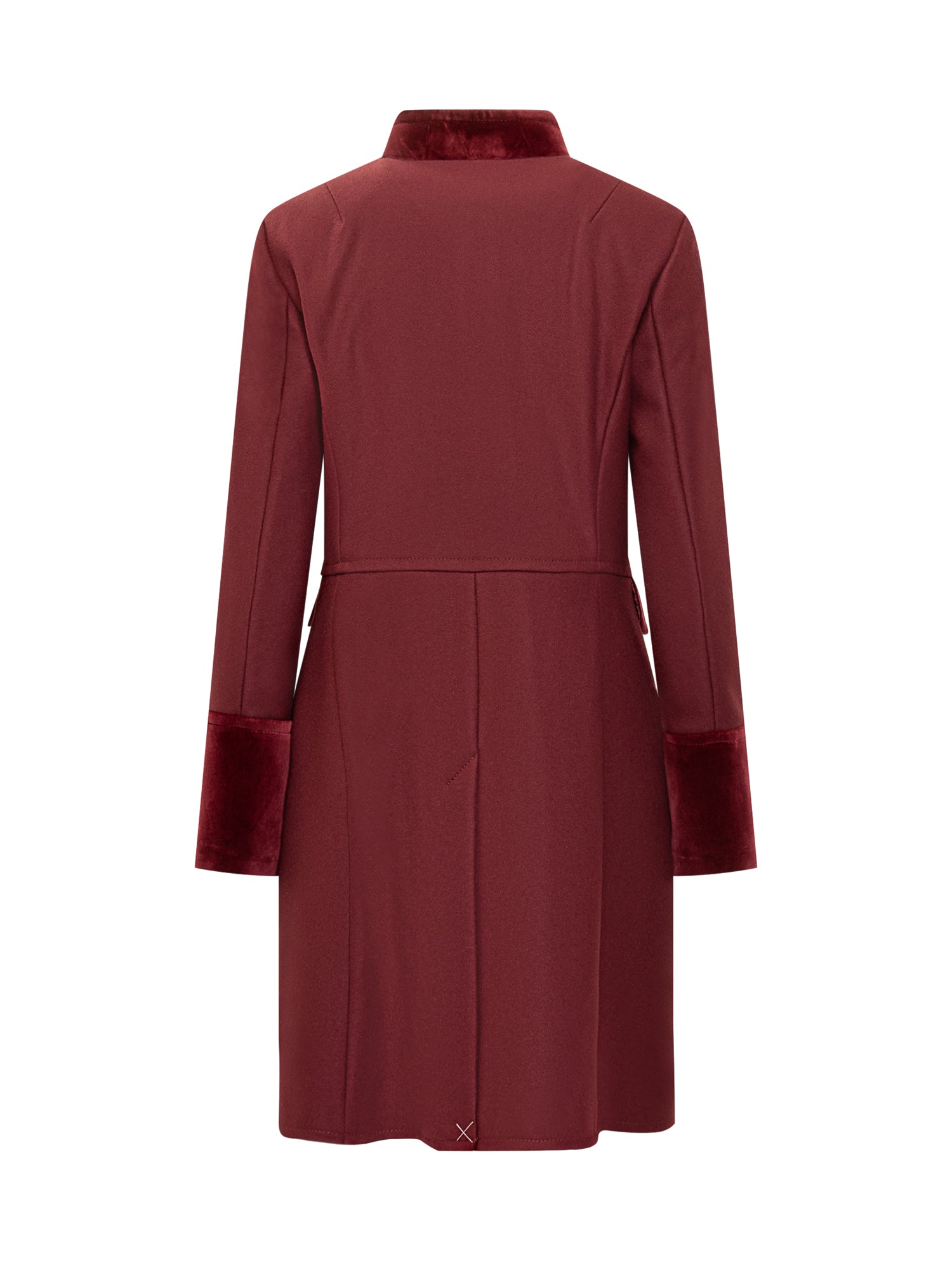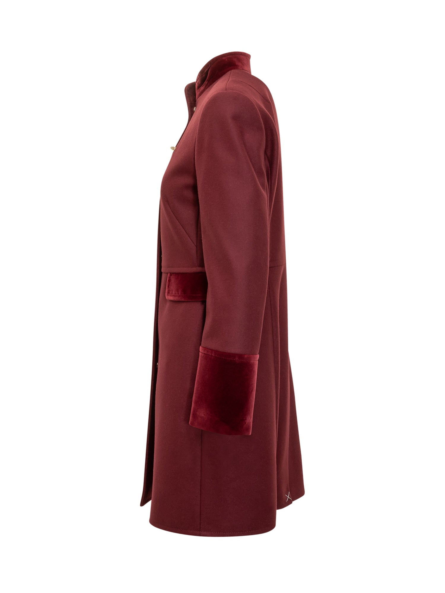 Cappotto monopetto Fay in lana bordeaux con dettagli in velluto a contrasto su colletto, polsi e tasche.