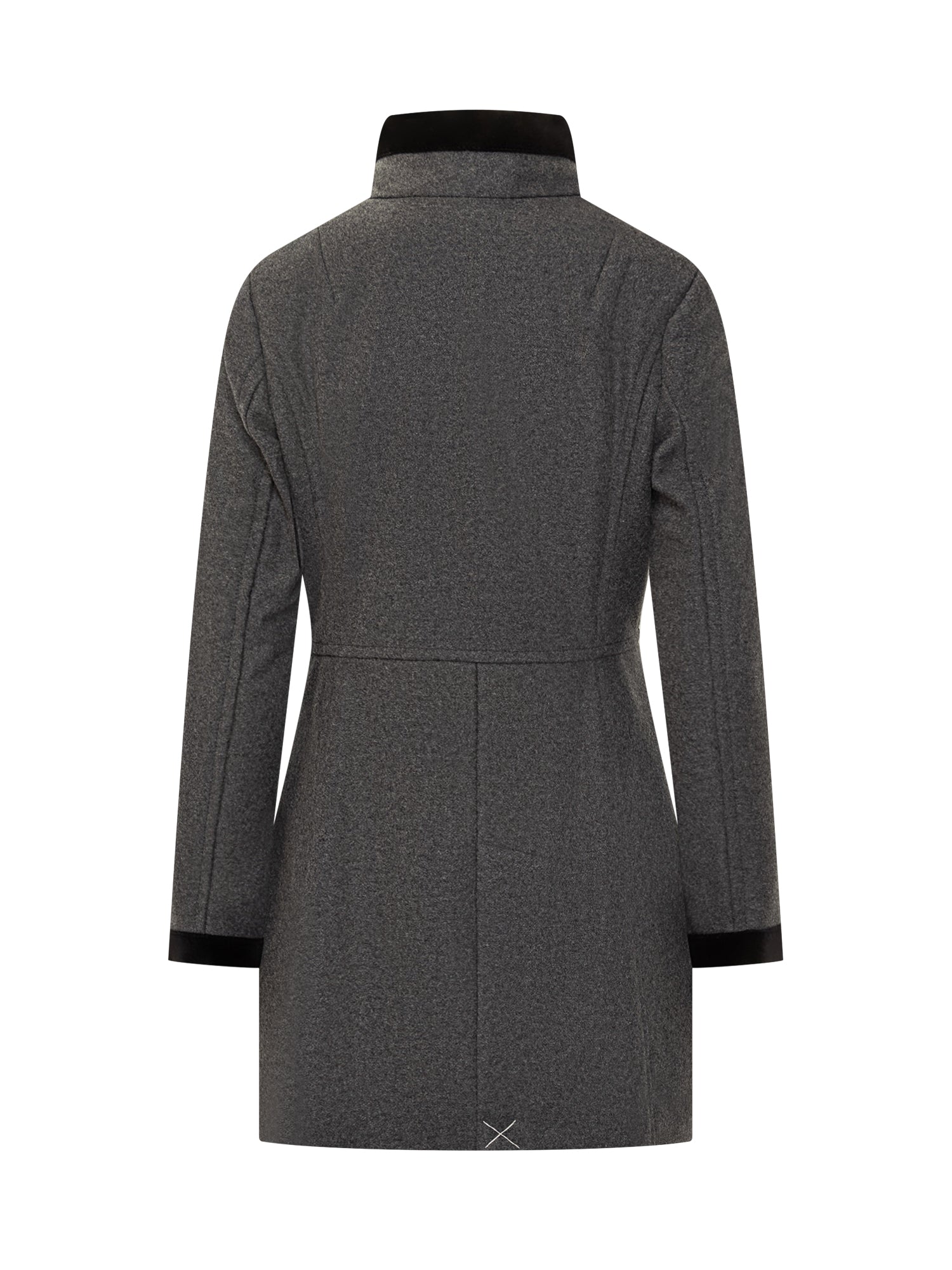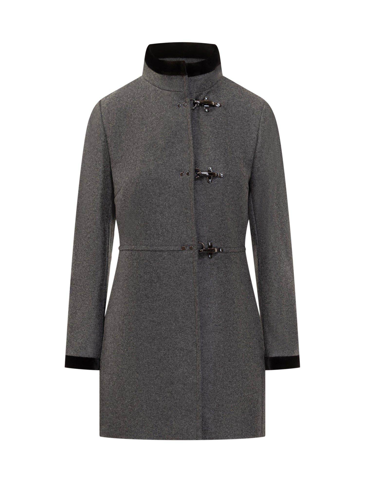 Cappotto Fay da donna in lana grigia con chiusura a ganci iconici e dettagli in velluto su colletto e polsi.