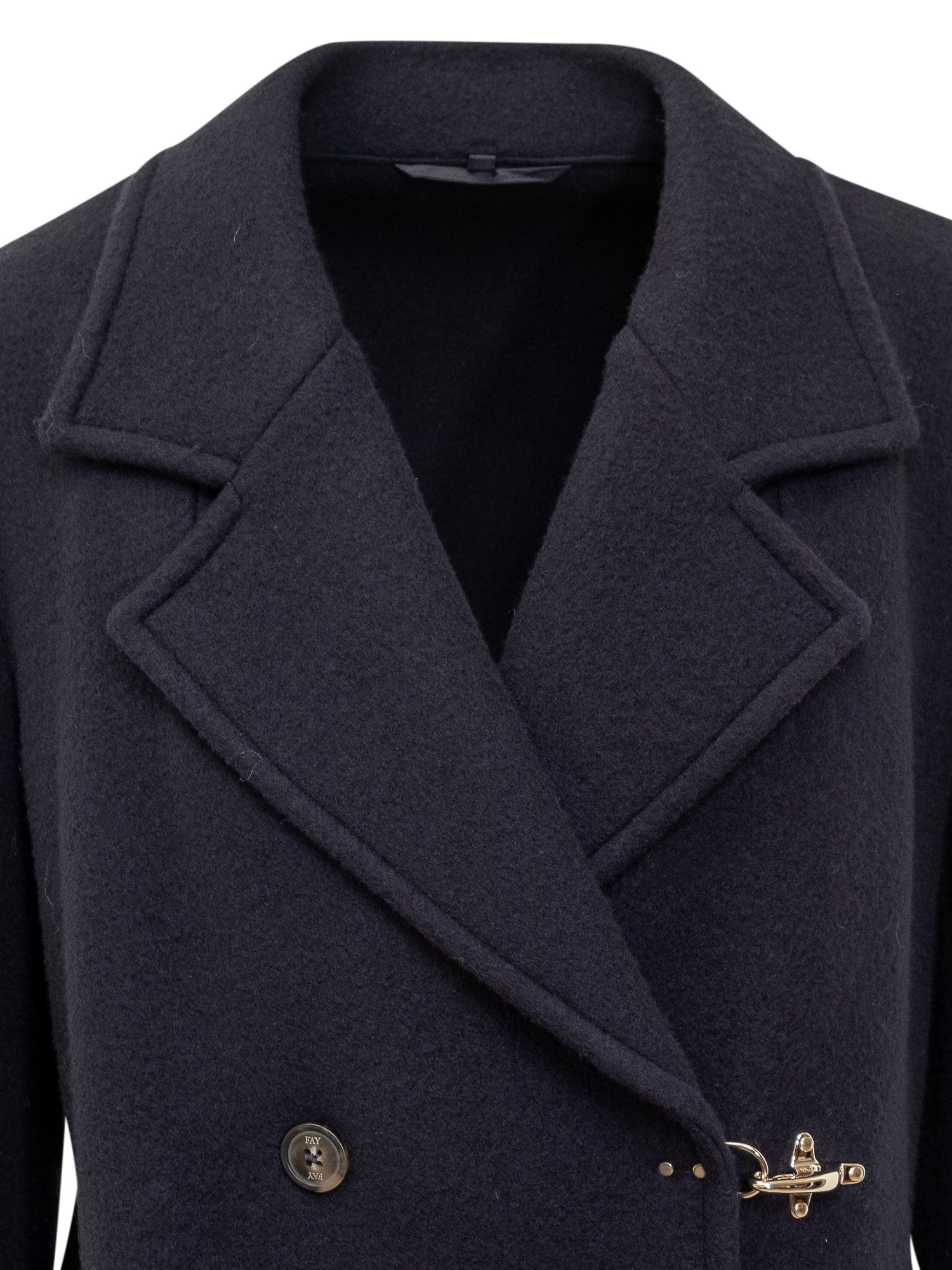 Cappotto blu in mista lana. Collo revers. Tasche con patta sul davanti. Chiusura con bottoni e gancio.