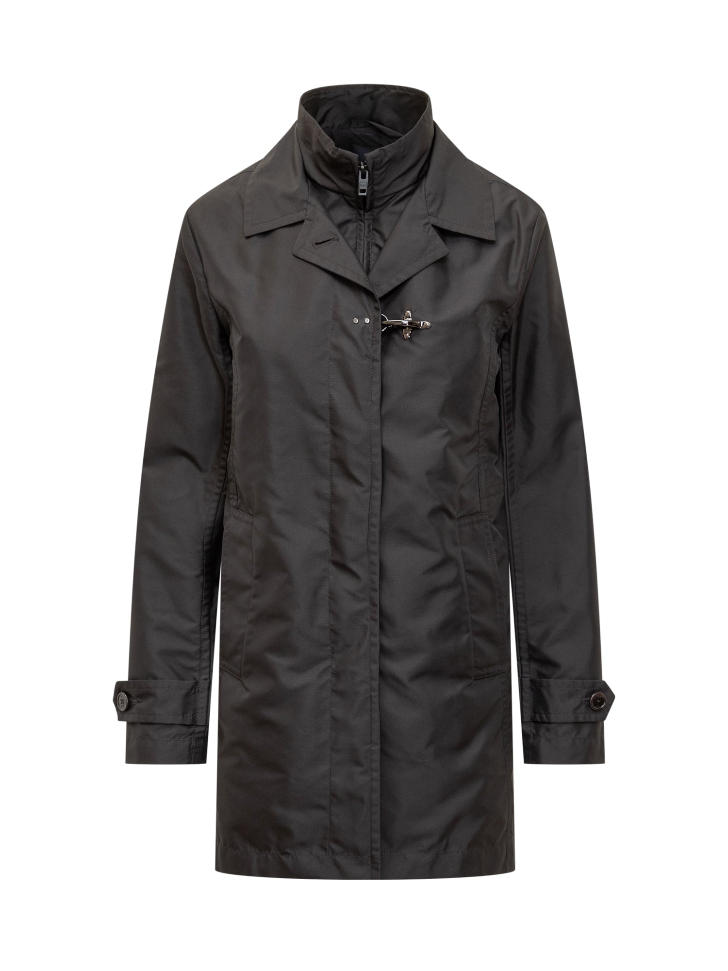 Chiusura con bottoni, zip e gancio. Tasche con patta cucita. Collo alto.