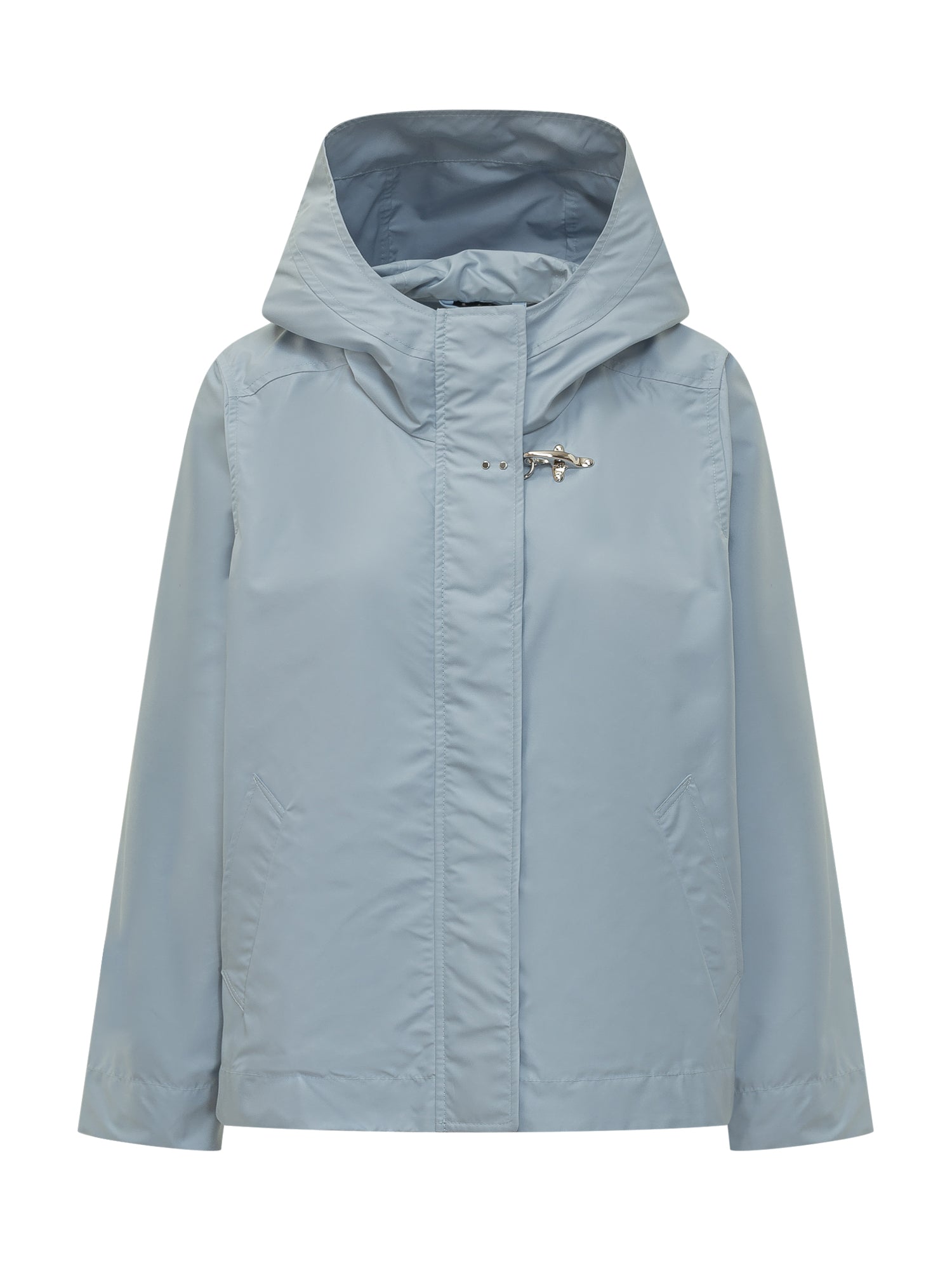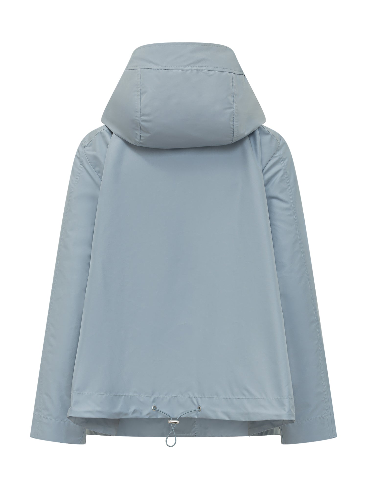 Parka con cappuccio strutturato e chiusura frontale nascosta. Tasche laterali oblique e dettaglio metallico applicato. Silhouette lineare adatta alla mezza stagione.