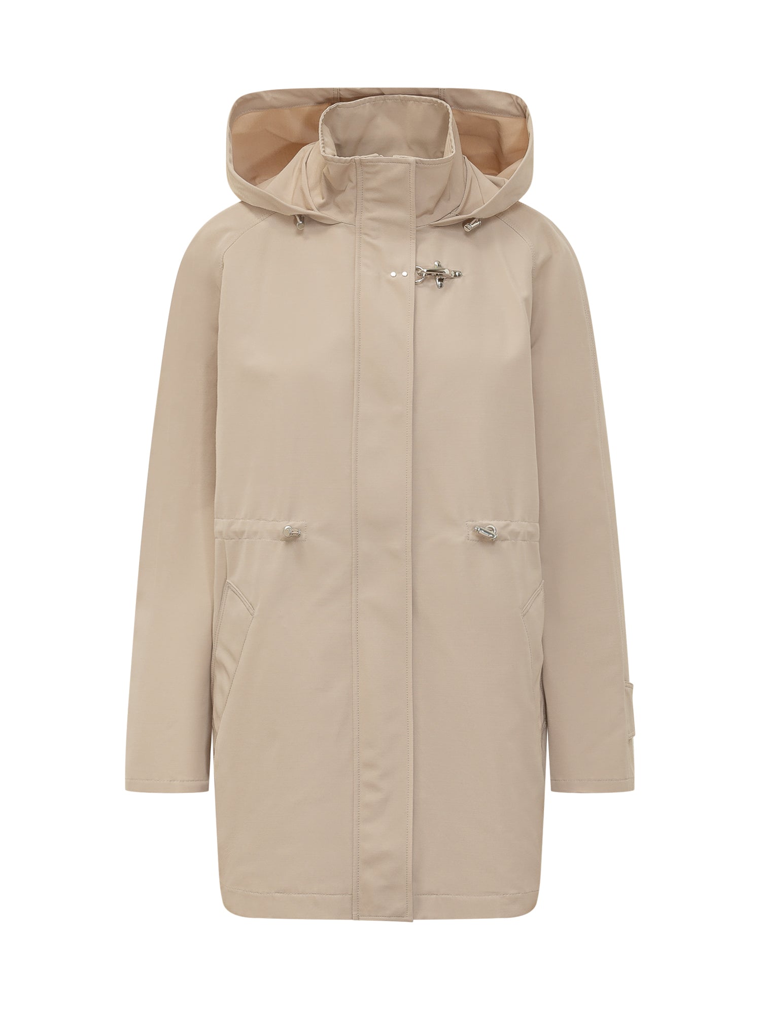 Parka con cappuccio e chiusura frontale con gancio metallico. Tasche laterali.