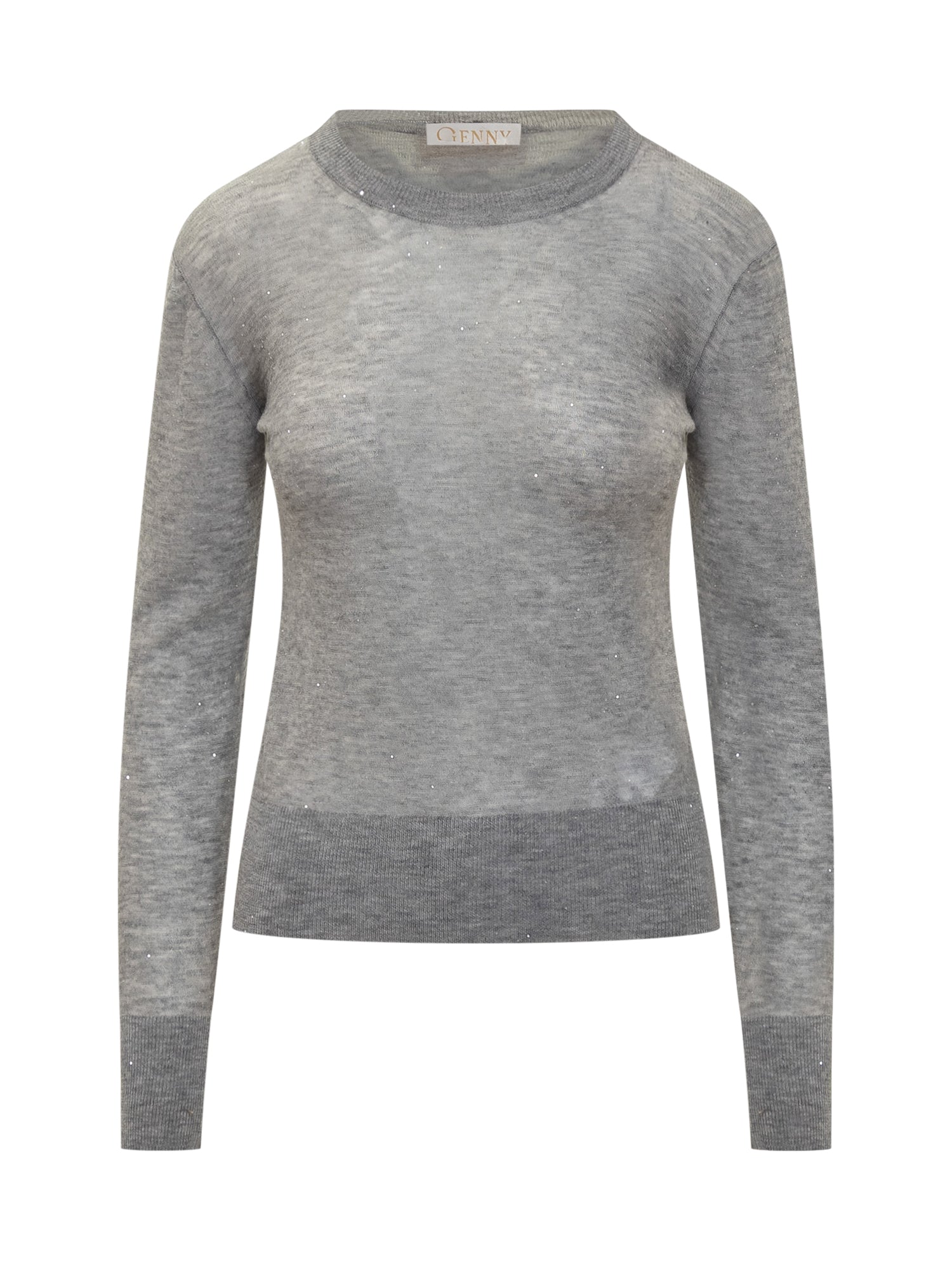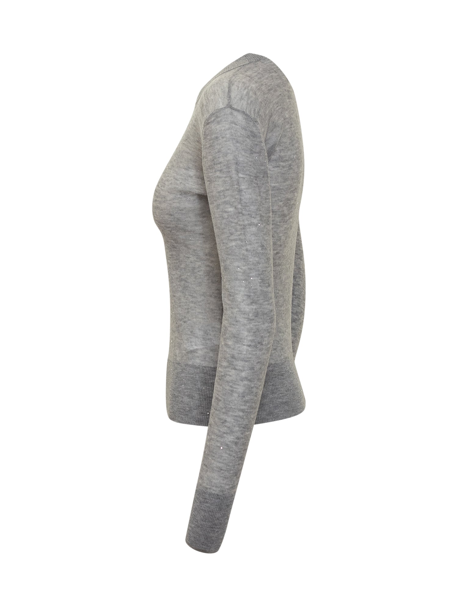 Maglia grigia in tessuto sottile con dettagli luminosi e scollo tondo.