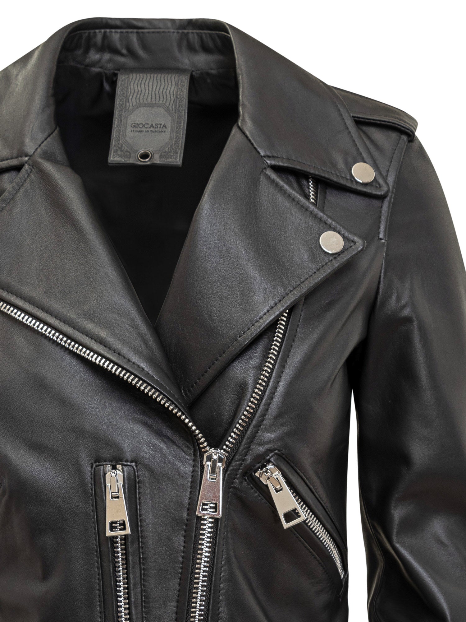 Giubbino in pelle nero. Chiusura con zip. Collo rever. Tasche con zip. Zip sui polsi. Cintura regolabile in vita. Mostrine sulle spalle.