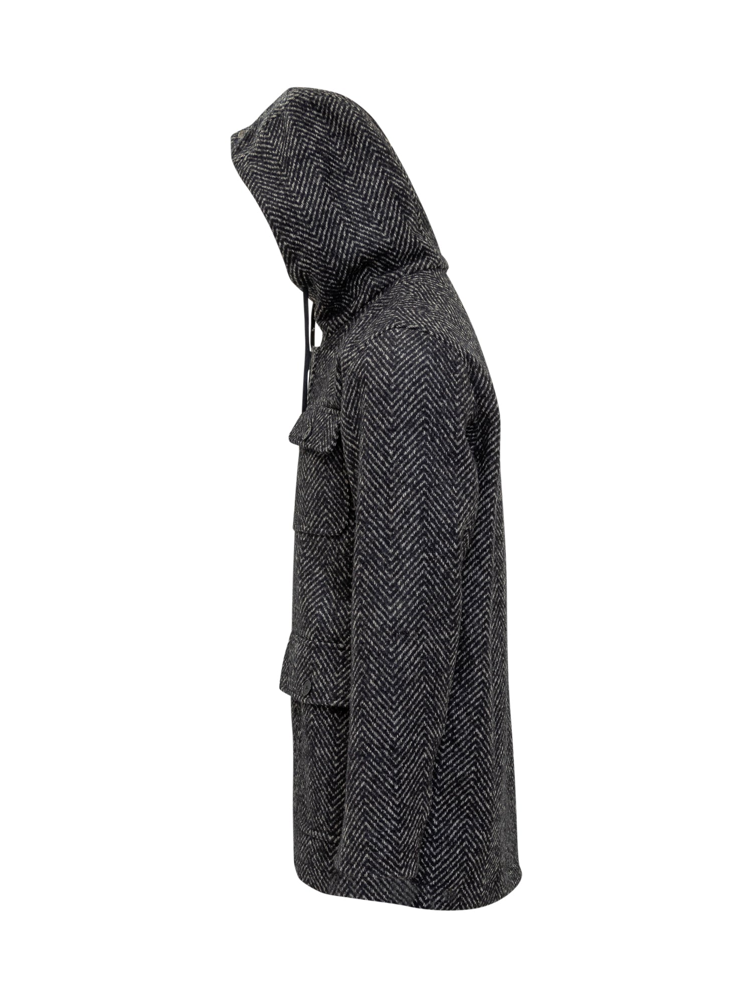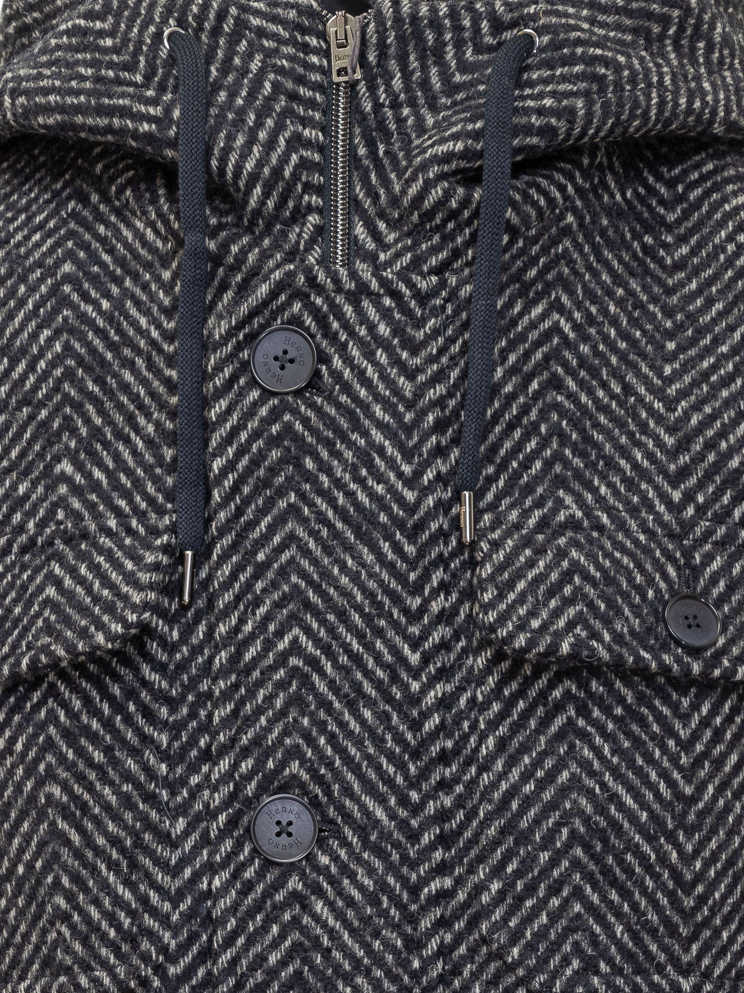 Cappotto Herno in lana con motivo chevron e cappuccio regolabile. Chiusura con bottoni e zip interna per maggiore comfort.