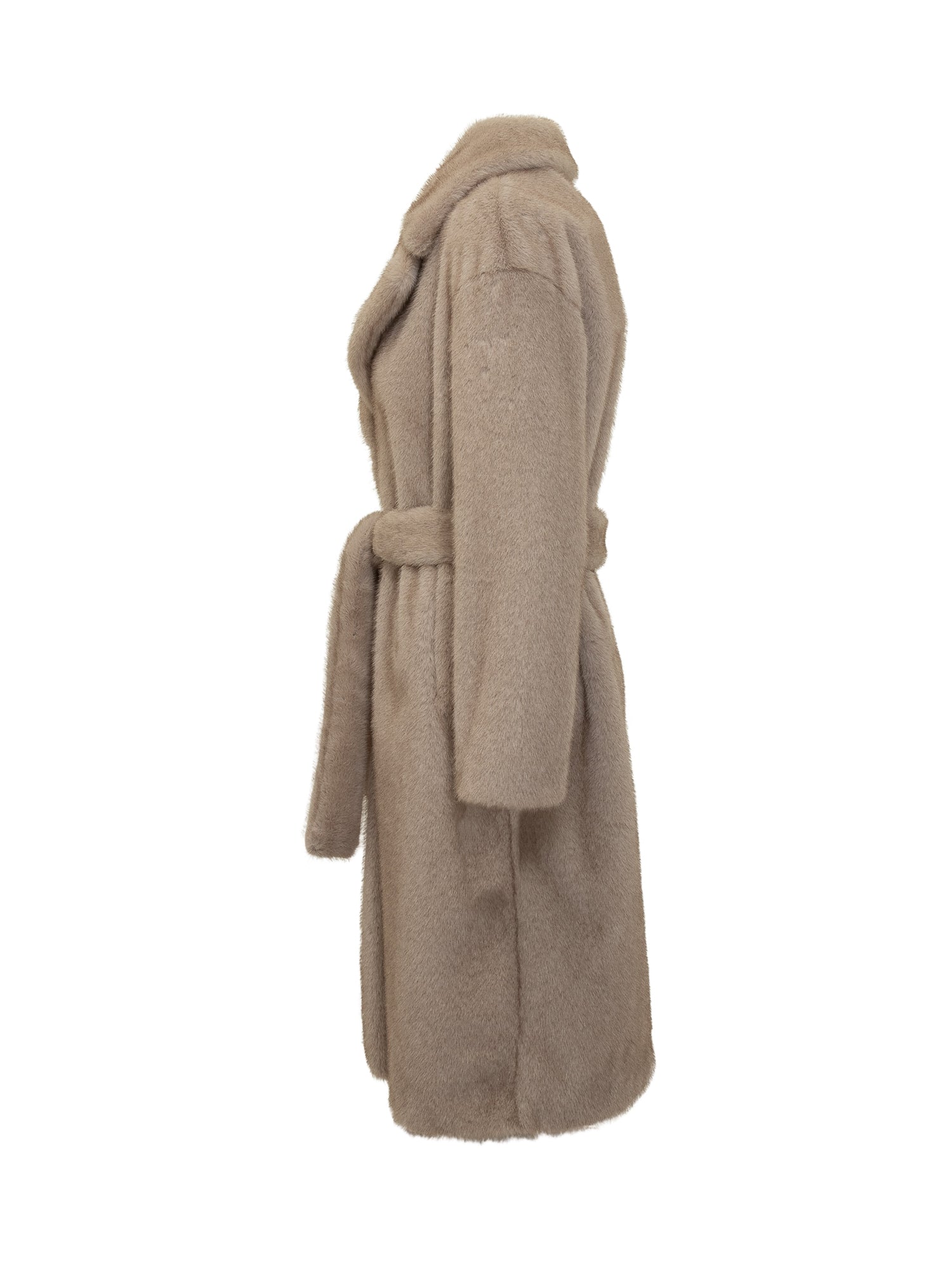 Cappotto Herno in morbida eco pelliccia color beige con cintura coordinata in vita. Linea avvolgente e colletto ampio.