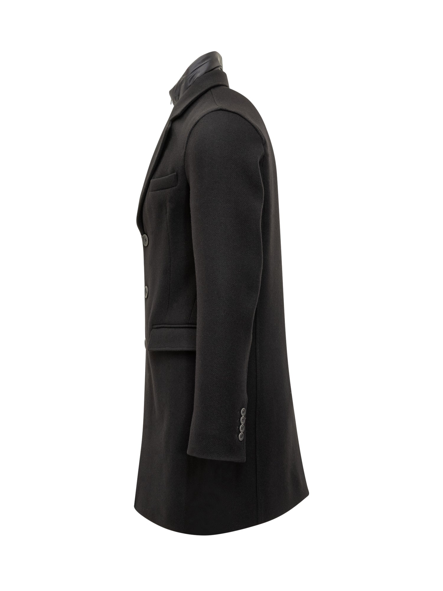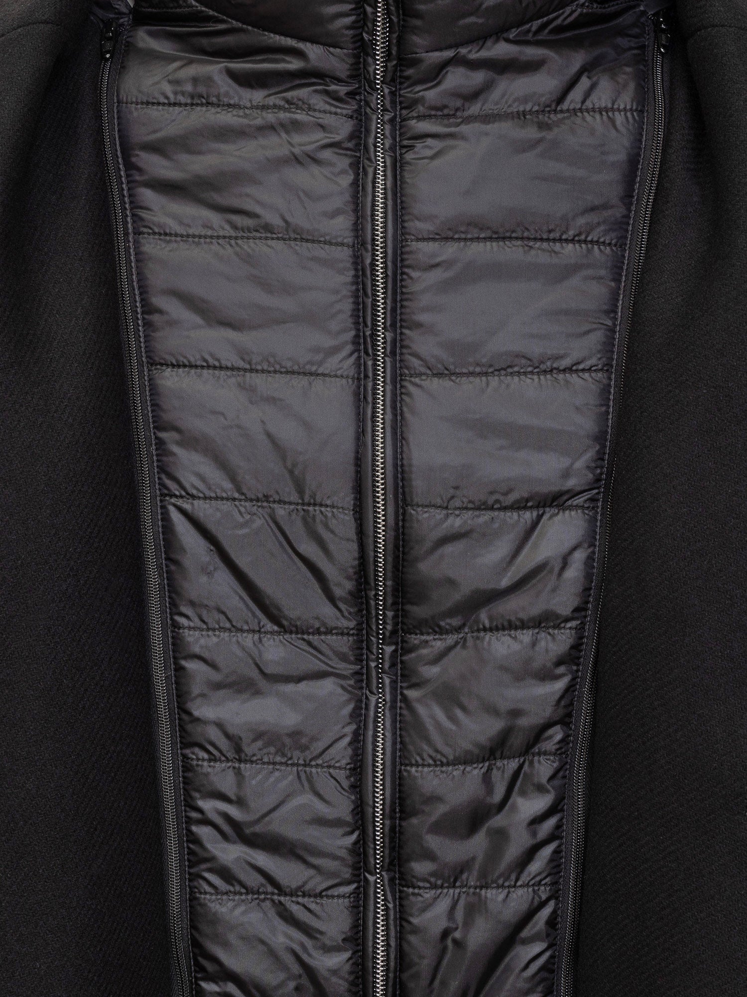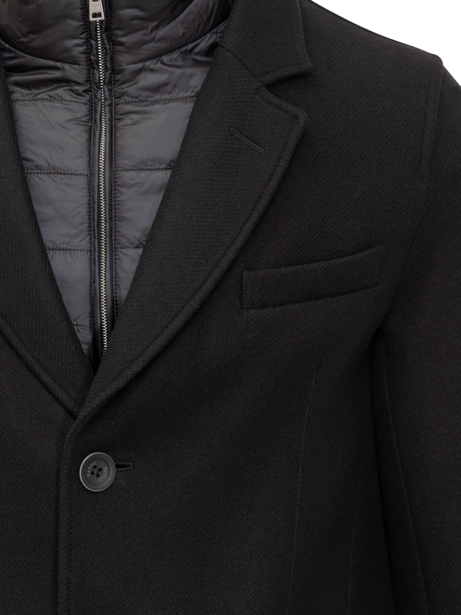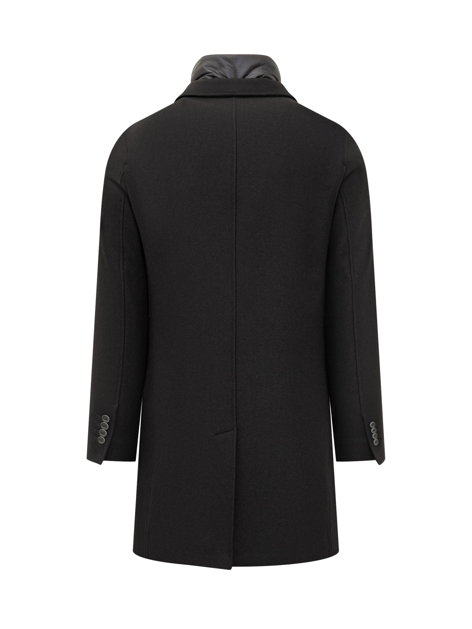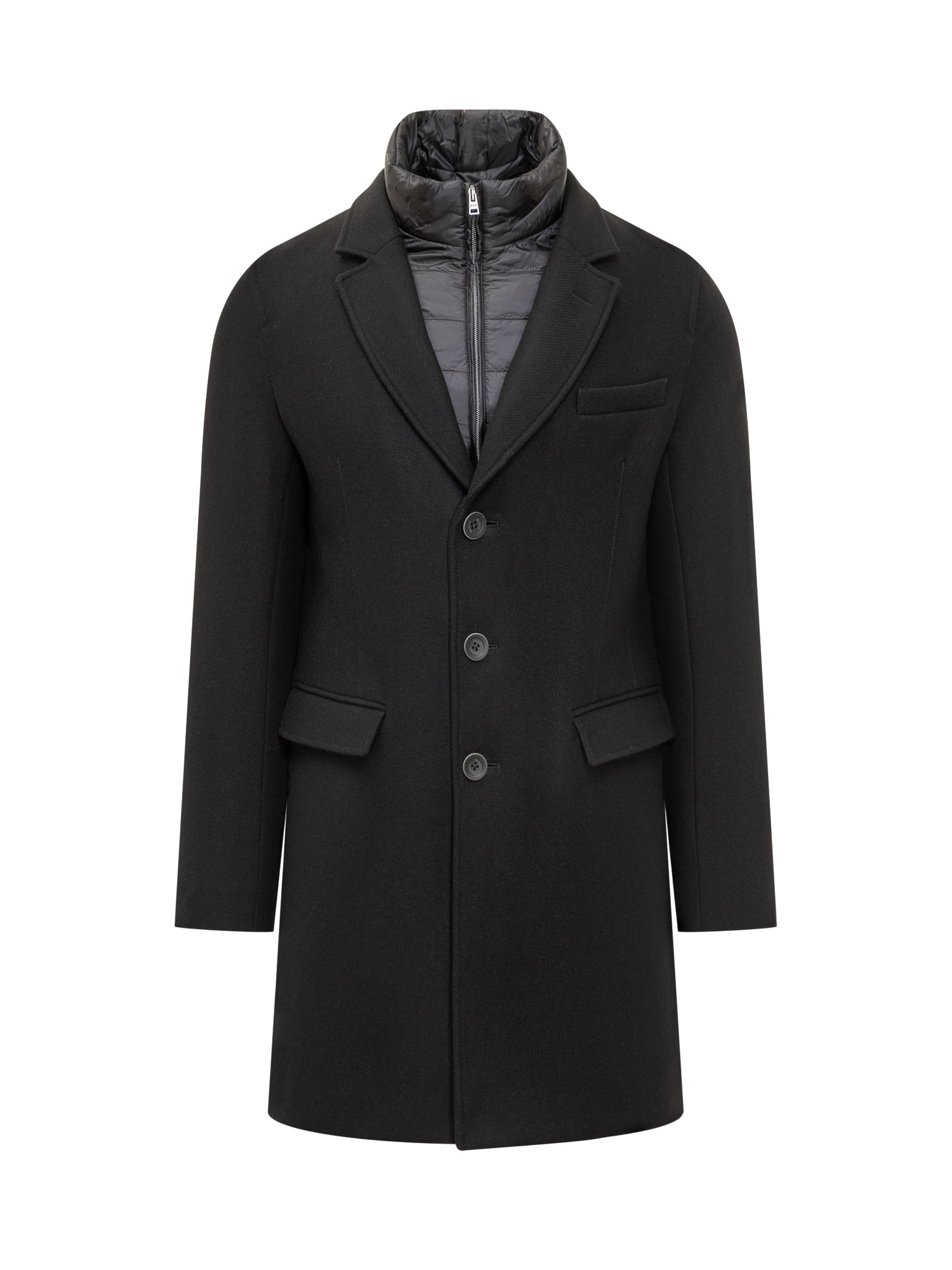 Cappotto in lana con inserto interno imbottito che aggiunge calore e stile. Linea pulita, chiusura a bottoni e tasche con patta.