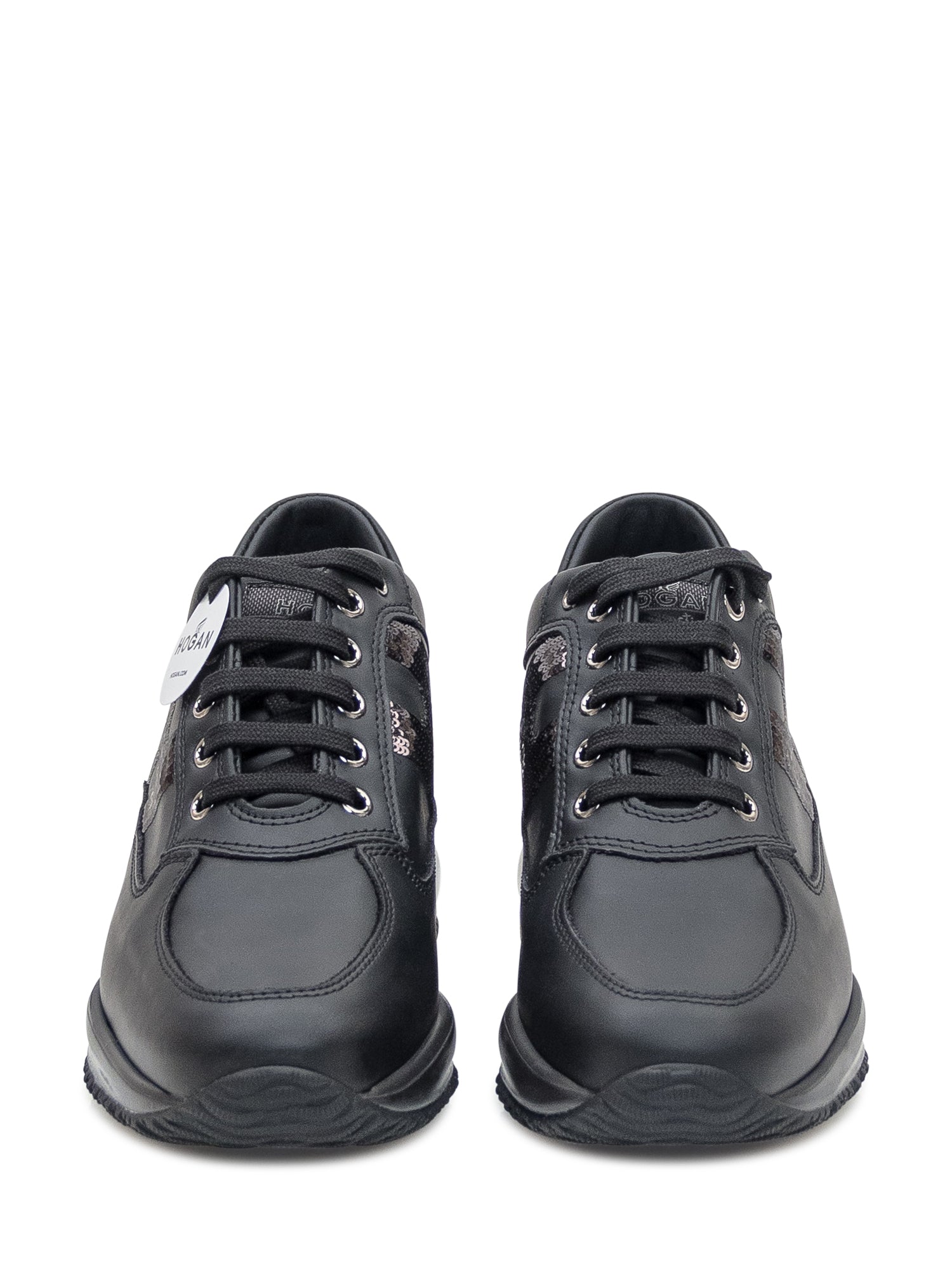 Sneakers Hogan Interactive in pelle nera con dettagli tono su tono. Un design iconico che unisce comfort ed eleganza. Sono disponibili i lacci di ricambio.