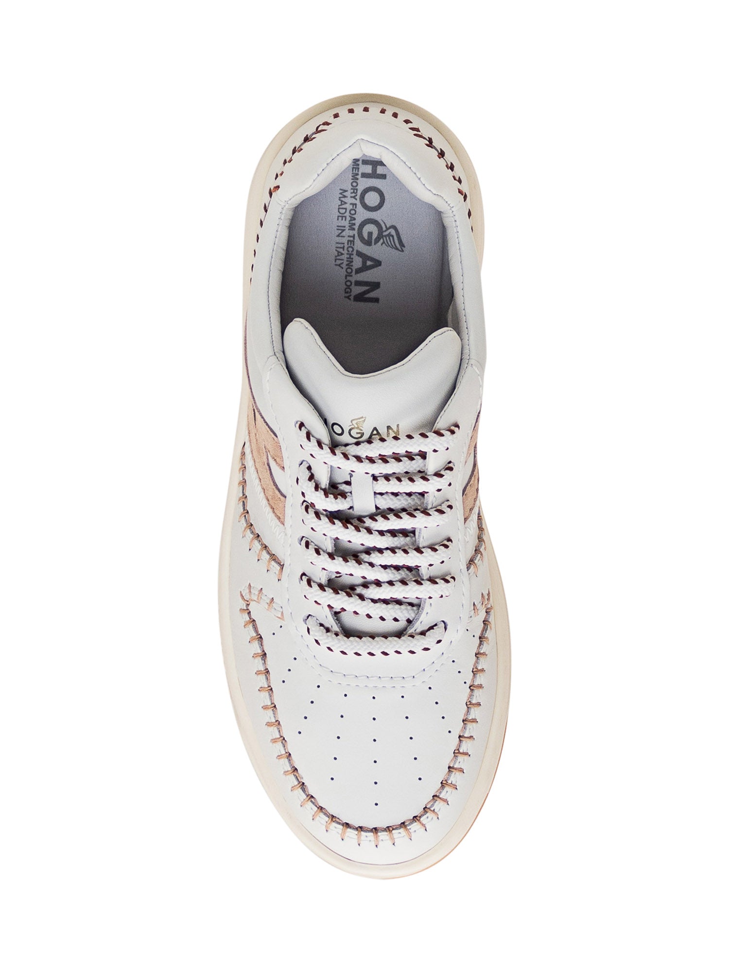 Sneaker bianca in pelle con punta traforata. Chiusura con lacci. Dettaglio infilature all over. Logo stampato sulla linguetta. Logo in pelle scamosciata su entrambi i lati.
