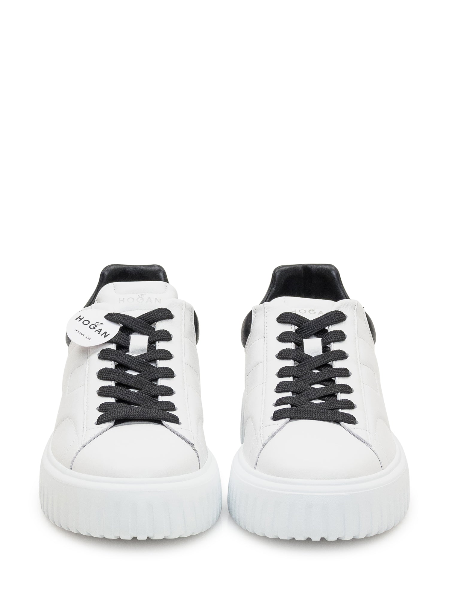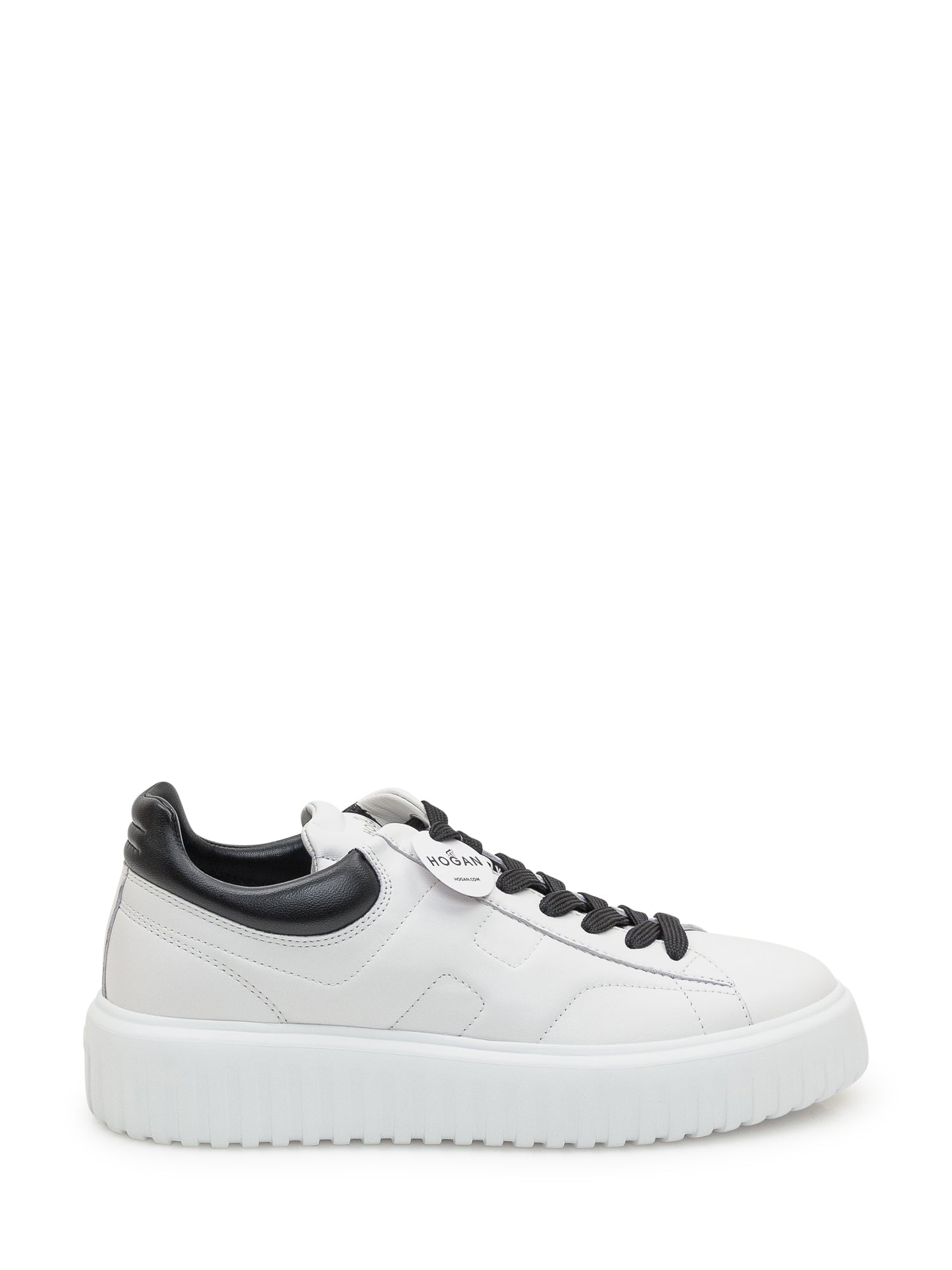 Scarpa bianca con dettagli neri realizzate in pelle di vitello. Logo ricamato. Linguetta con stampa del logo. Allacciatura frontale. Punta tonda. Soletta di marca. Suola platform. Lacci ricambio bianchi.