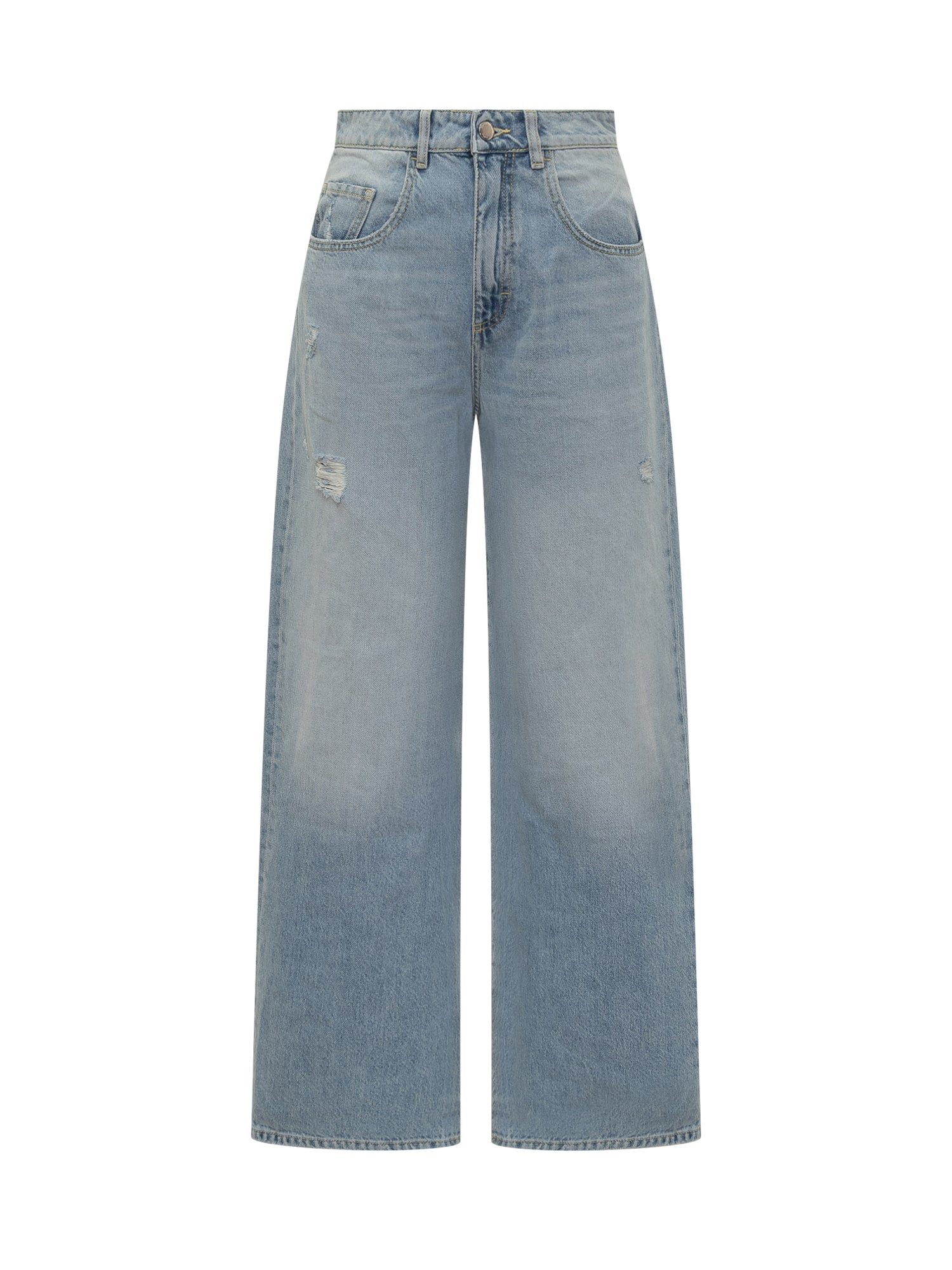 Jeans Icon Denim in lavaggio chiaro con dettagli destroyed e linea ampia a vita alta.
