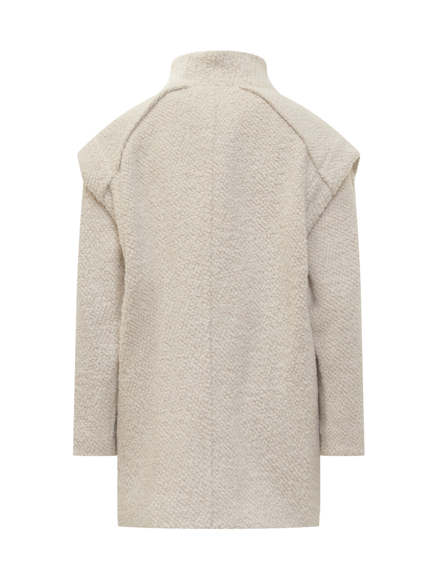 Cappotto modello Pavina, con taglio moderno e strutturato. Realizzato in tessuto bouclé color panna, presenta un collo alto con chiusura asimmetrica a bottone e spalle accentuate.