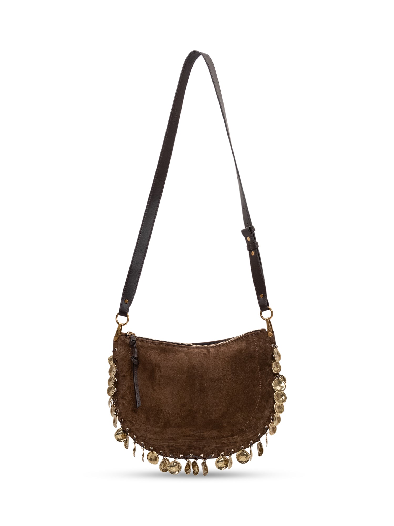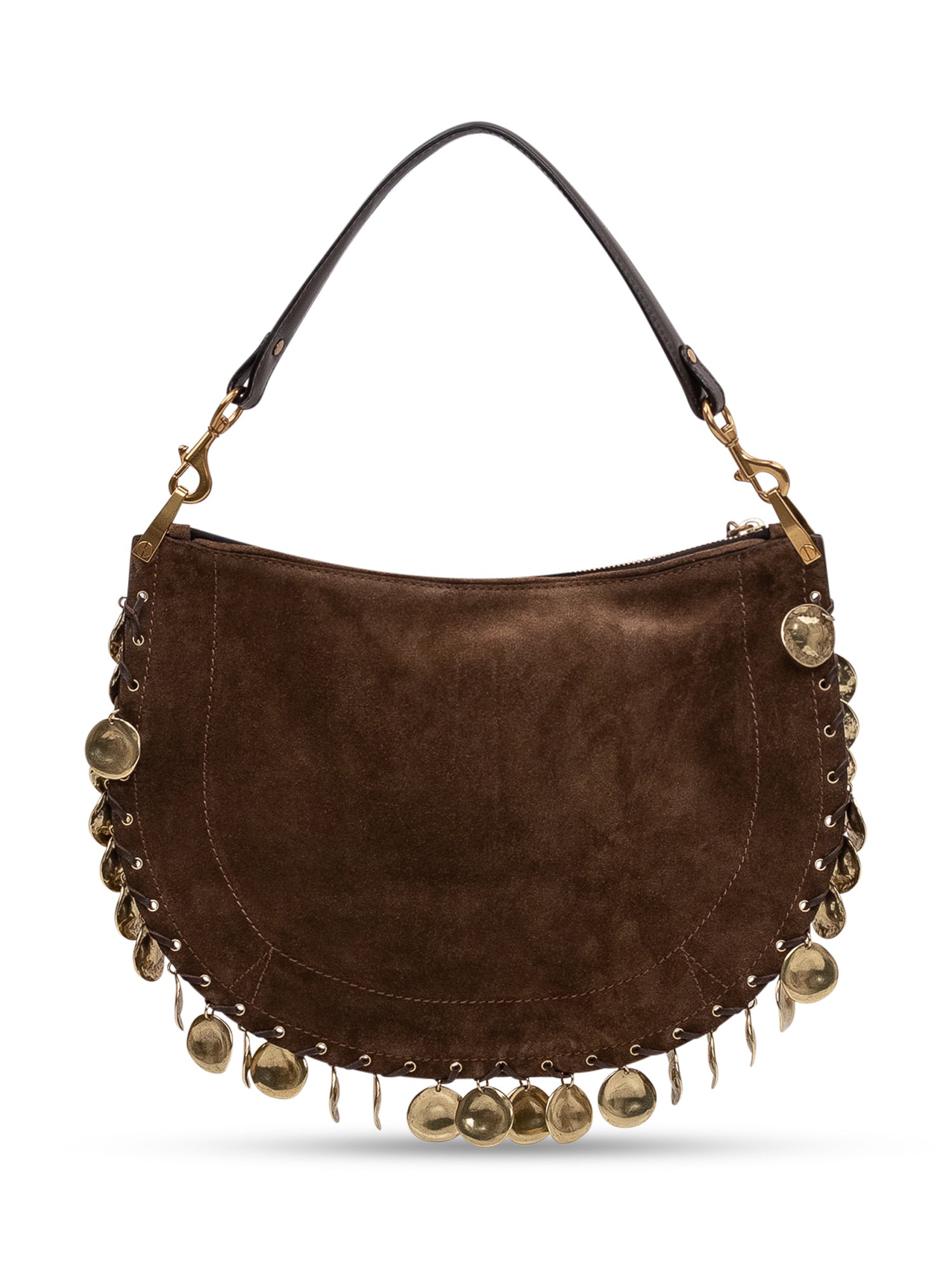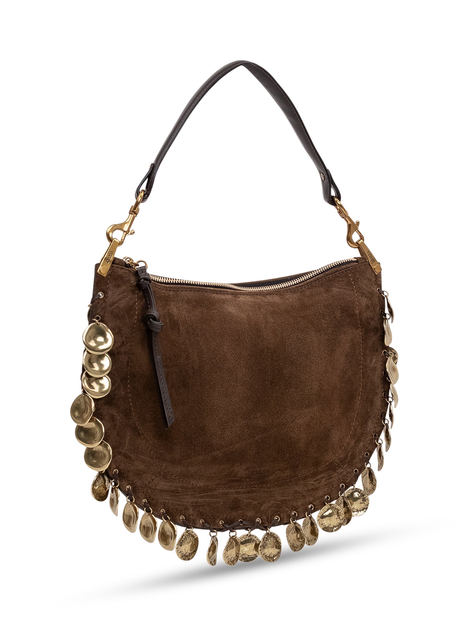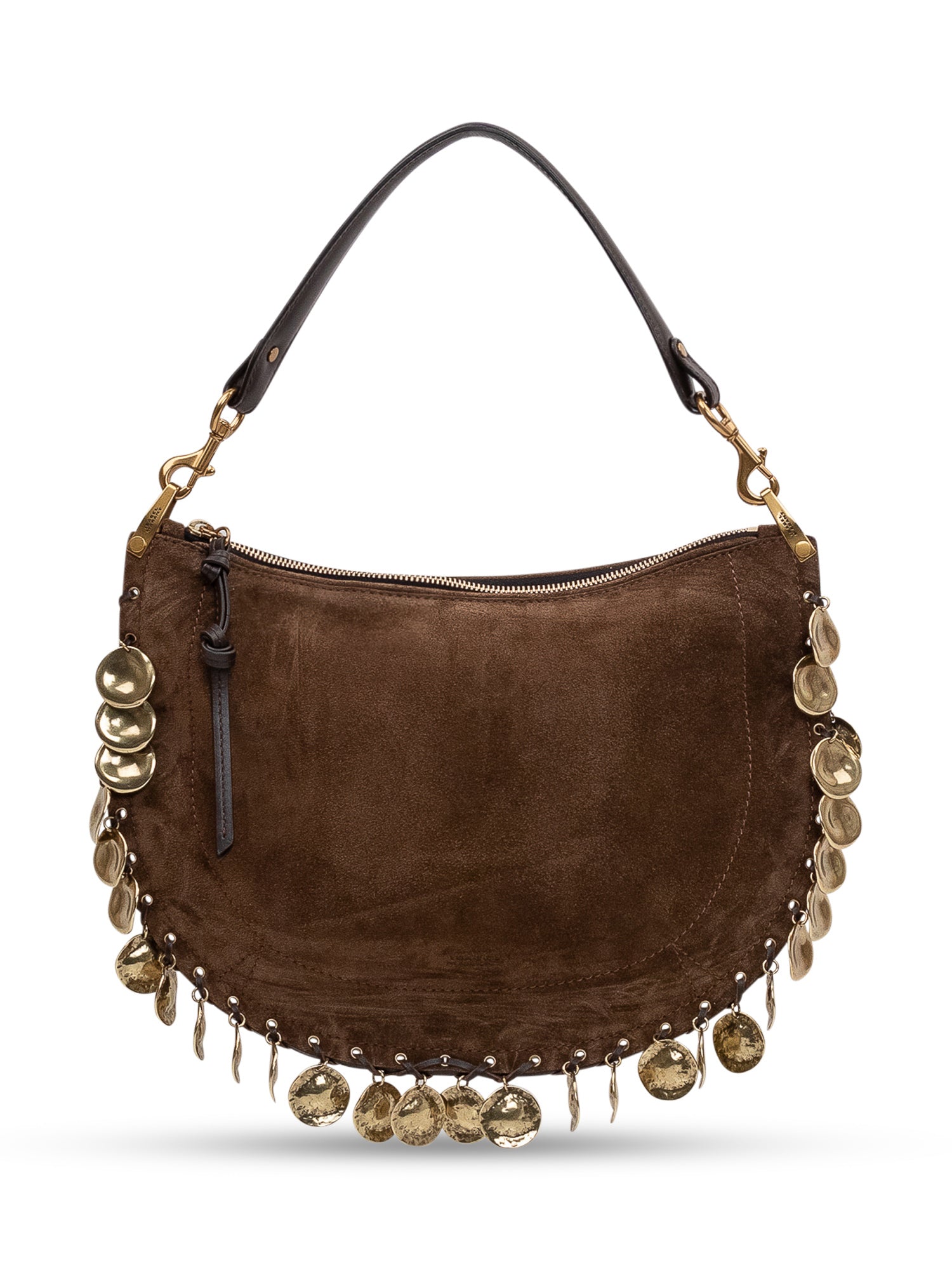Borsa a spalla con zip superiore e manico singolo. Dettagli metallici pendenti applicati sui profili e silhouette curva compatta.