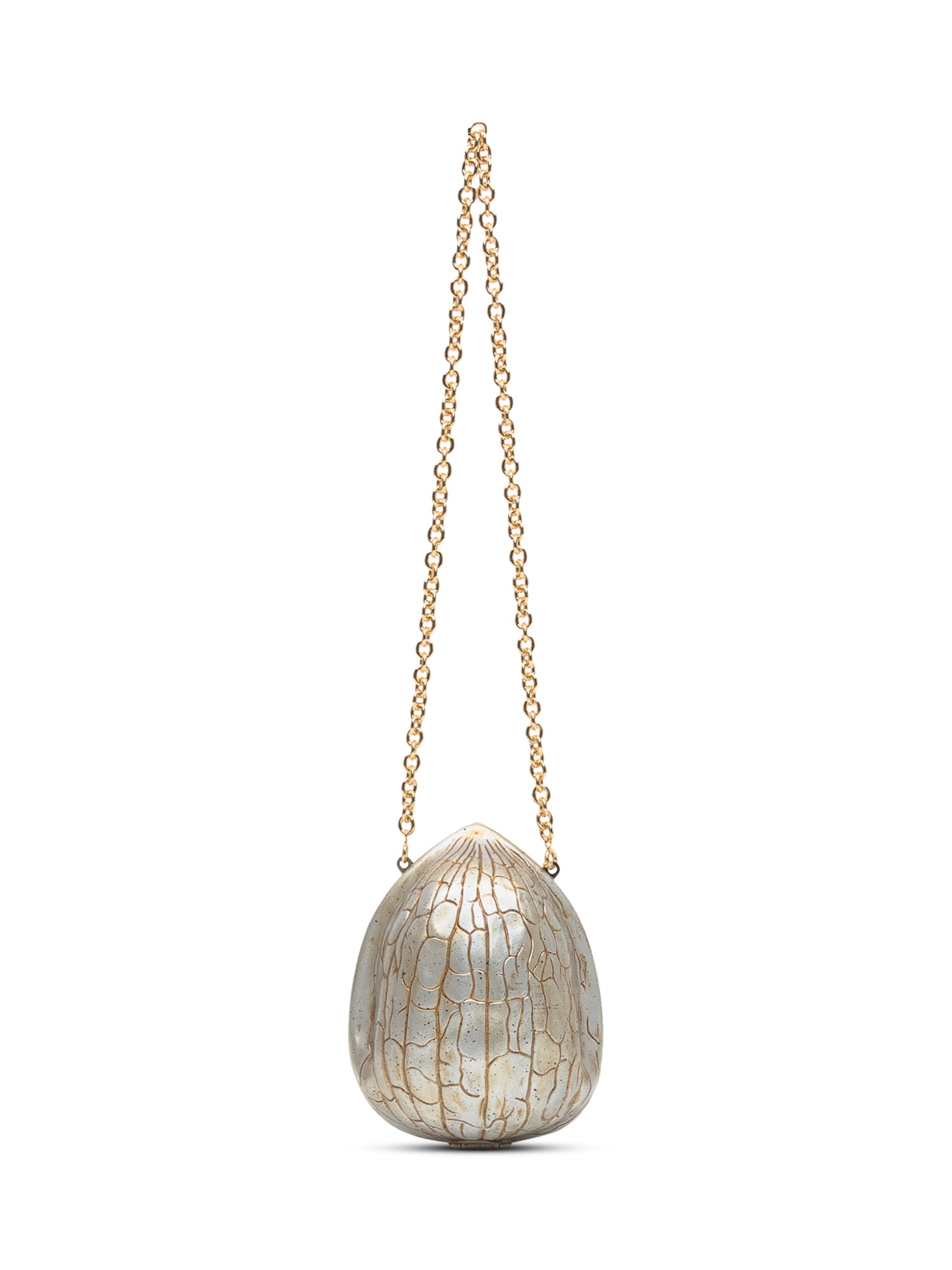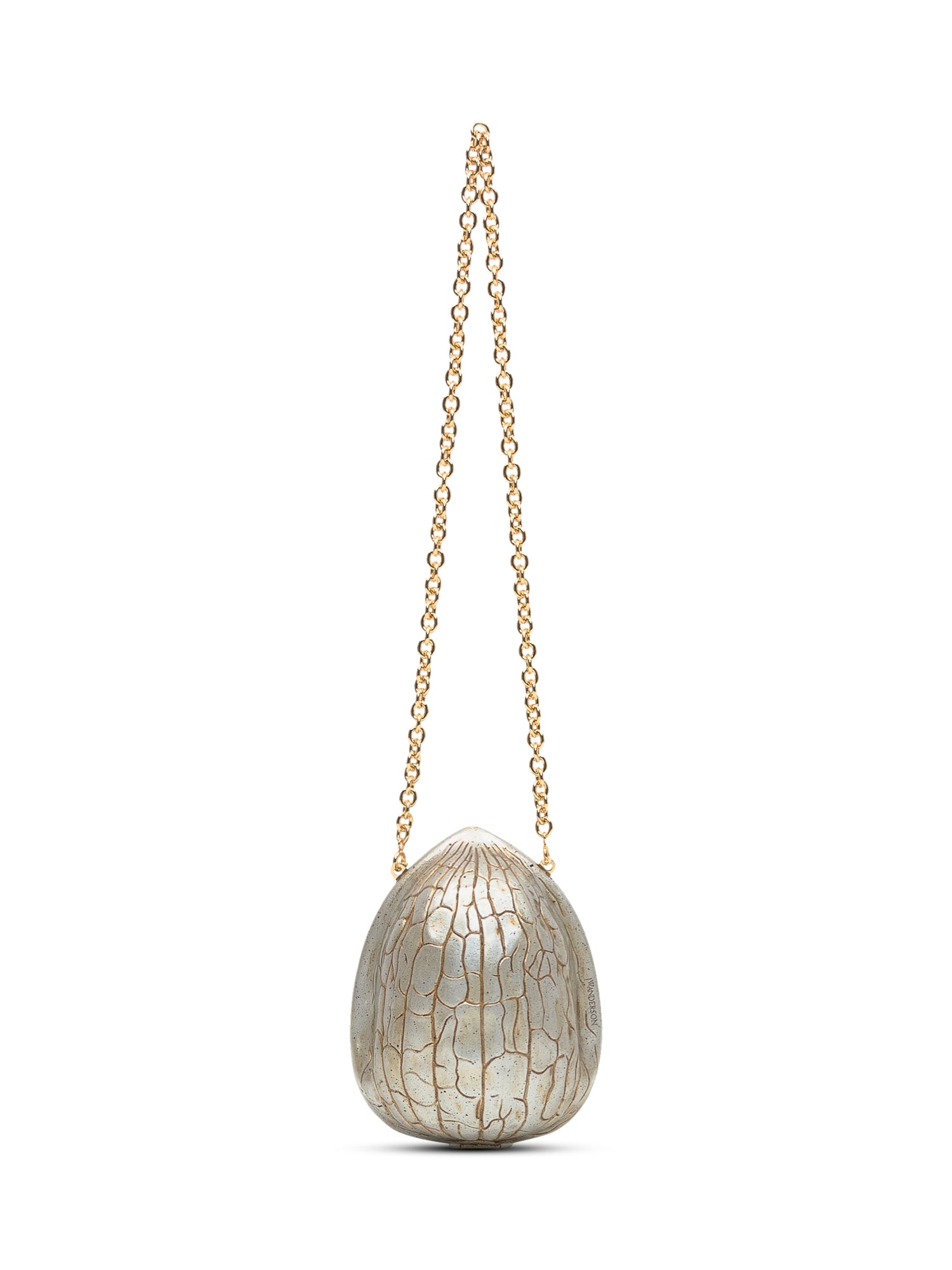 Clutch in metallo dorato di JW Anderson con iconica forma di noce e tracolla a catena.