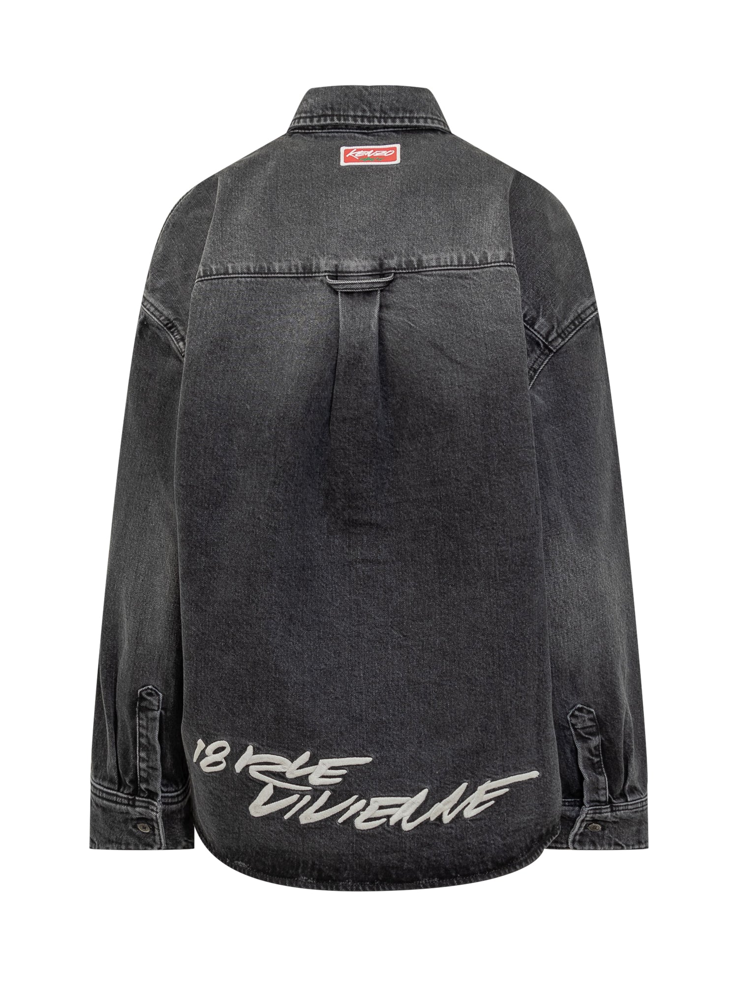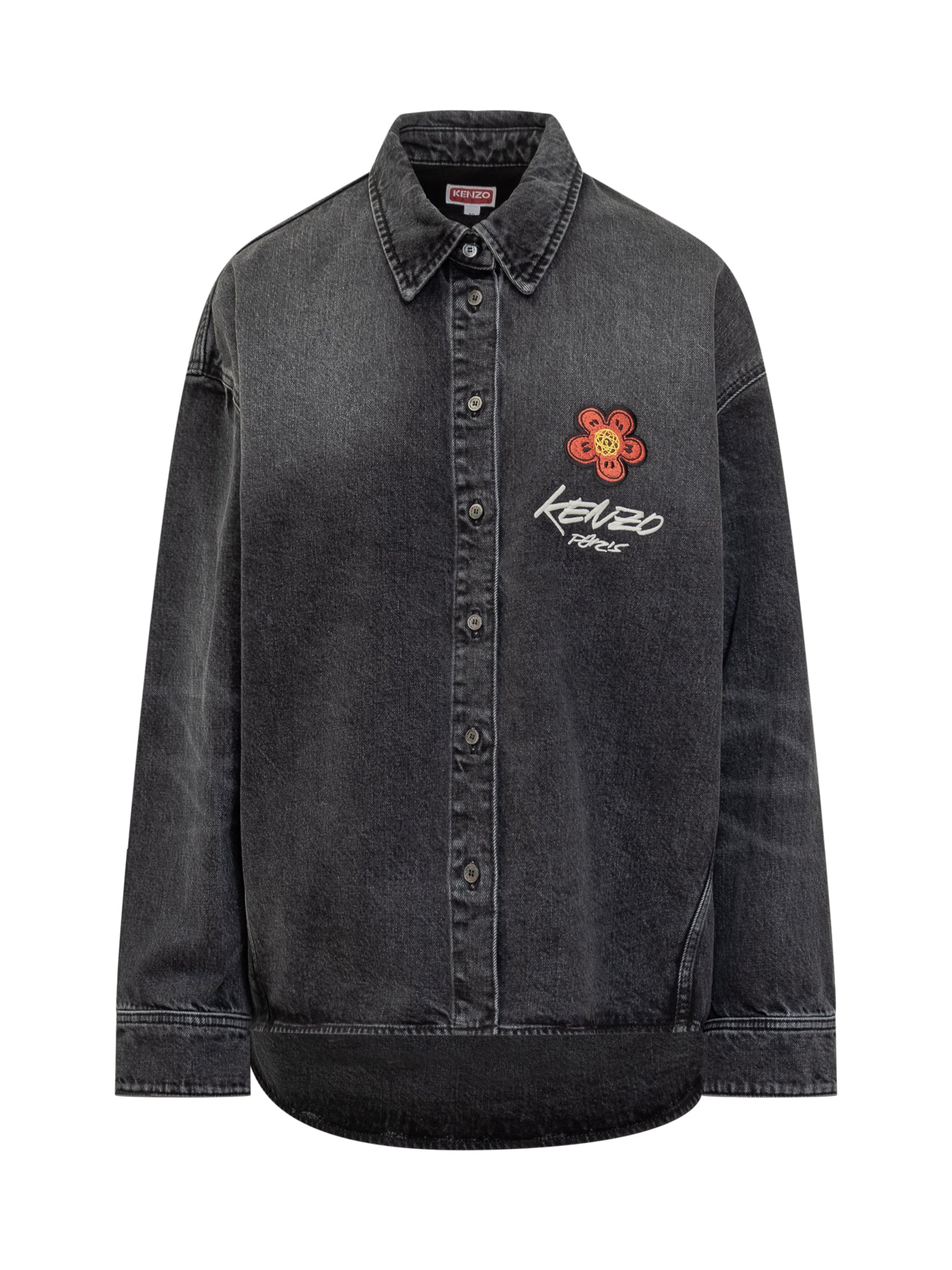 Camicia in denim nero Kenzo con ricamo floreale e logo sul petto. Taglio rilassato e dettagli délavé.