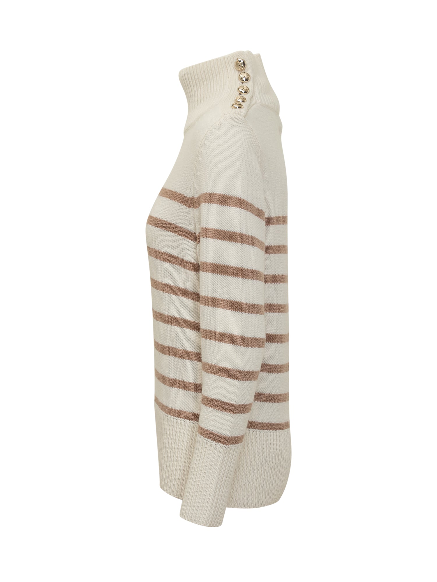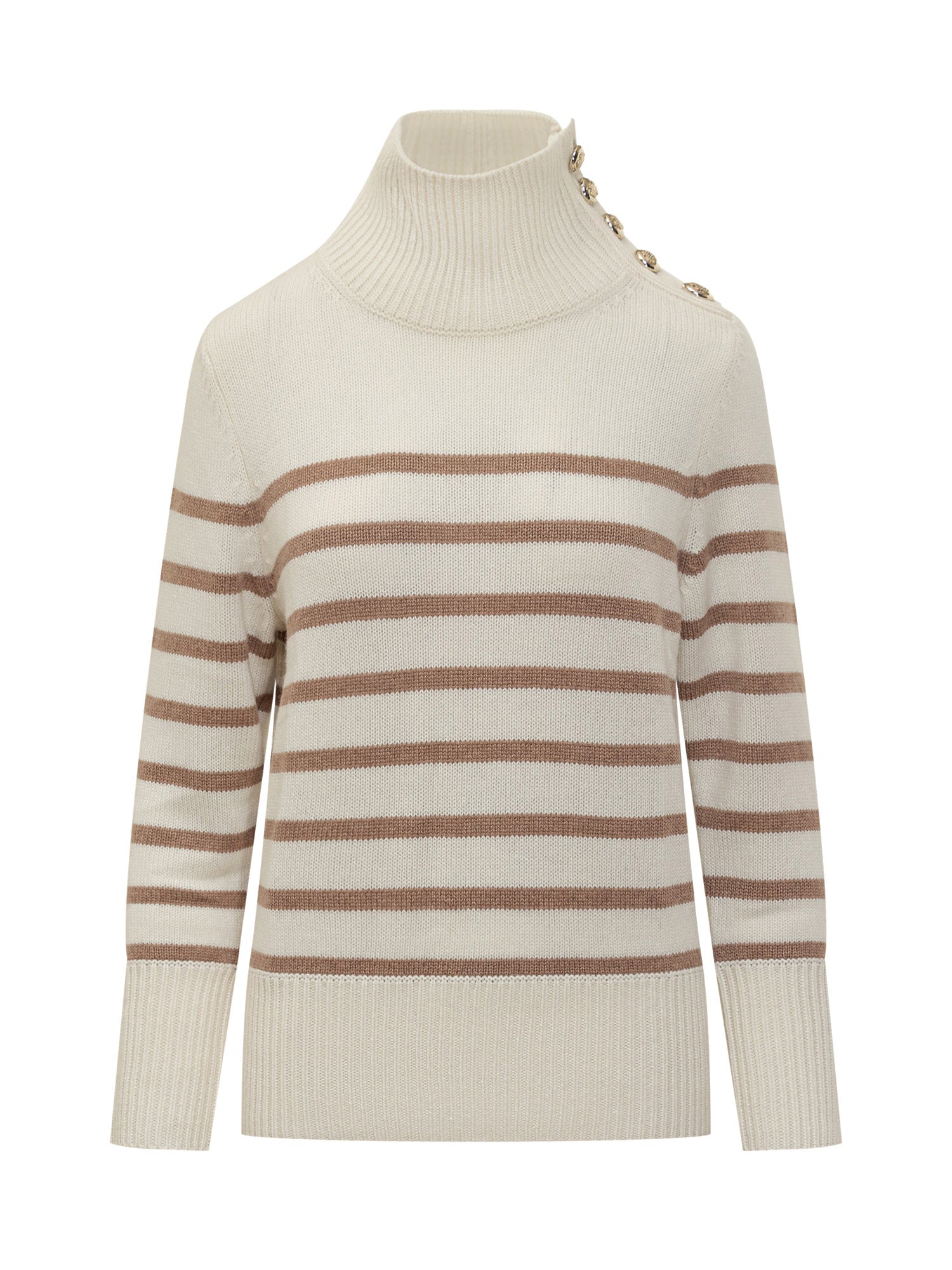 Maglione Kujten in morbido cashmere color panna con righe beige e bottoni dorati sulla spalla.