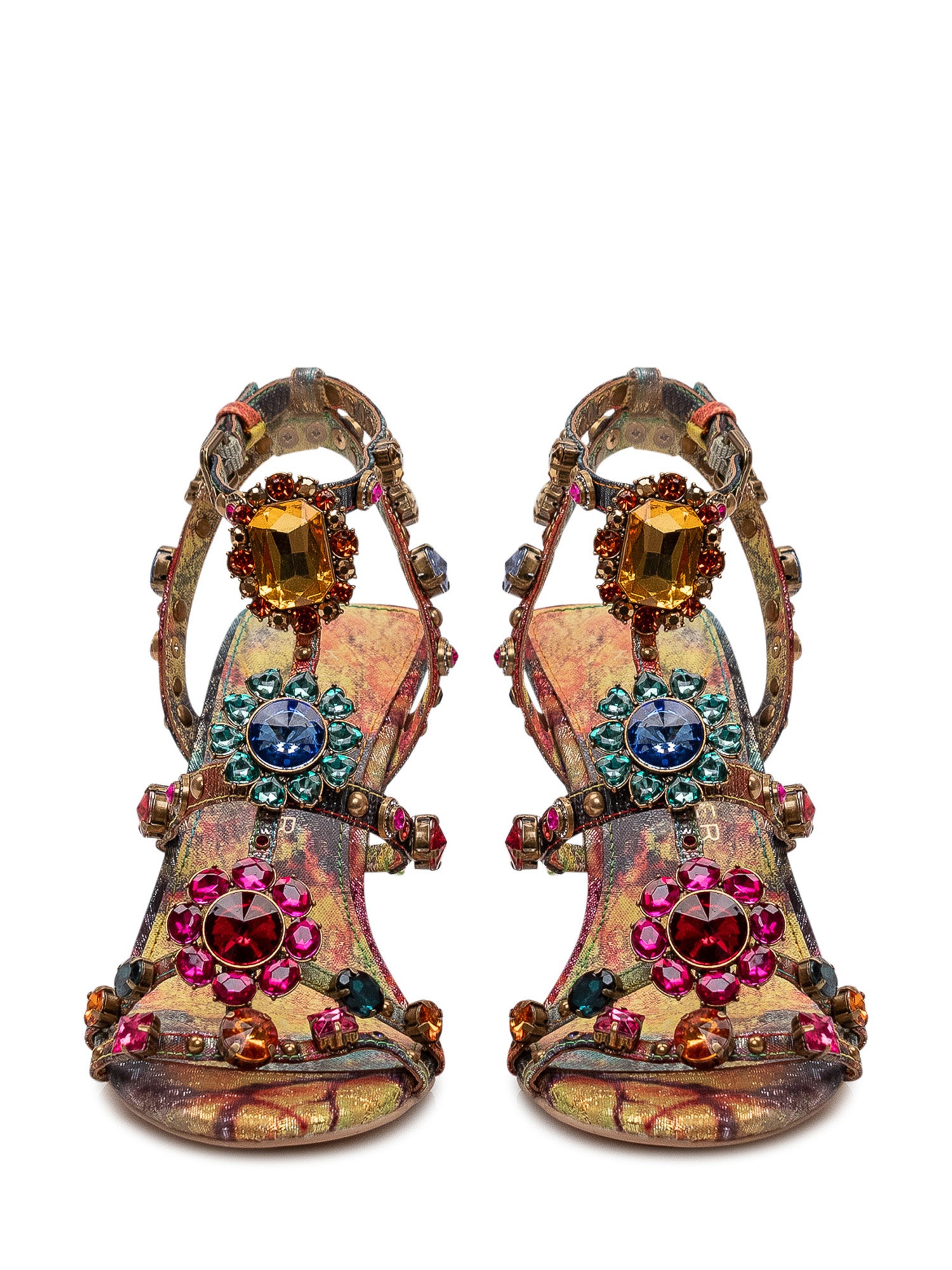 Sandali gladiatore con tacco e punta aperta, caratterizzati da cinturini multipli con applicazioni gioiello e borchie decorative.Altezza tacco: 10