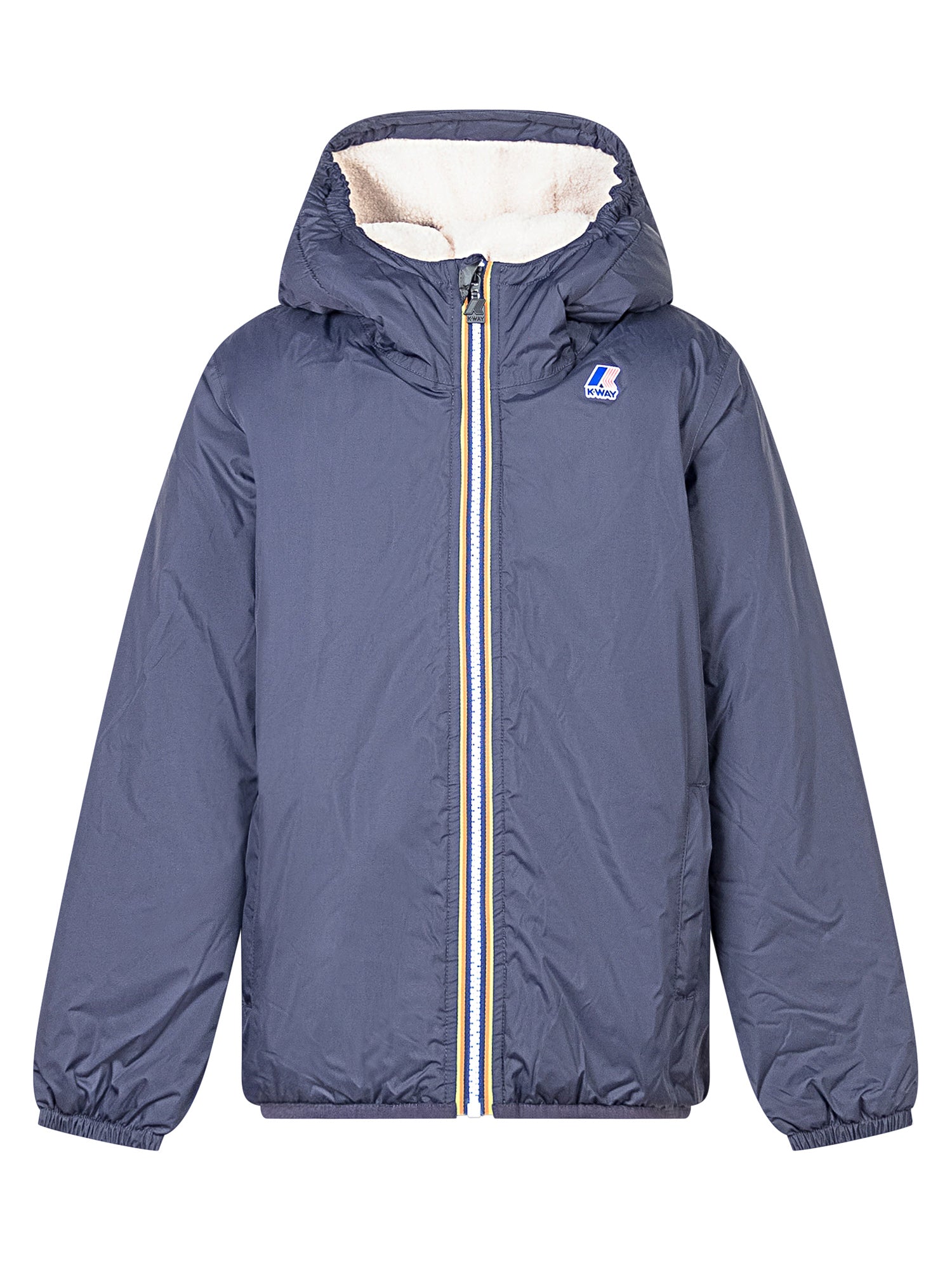 Giacca K-Way blu con cappuccio, zip frontale multicolor e interno in morbido pile.