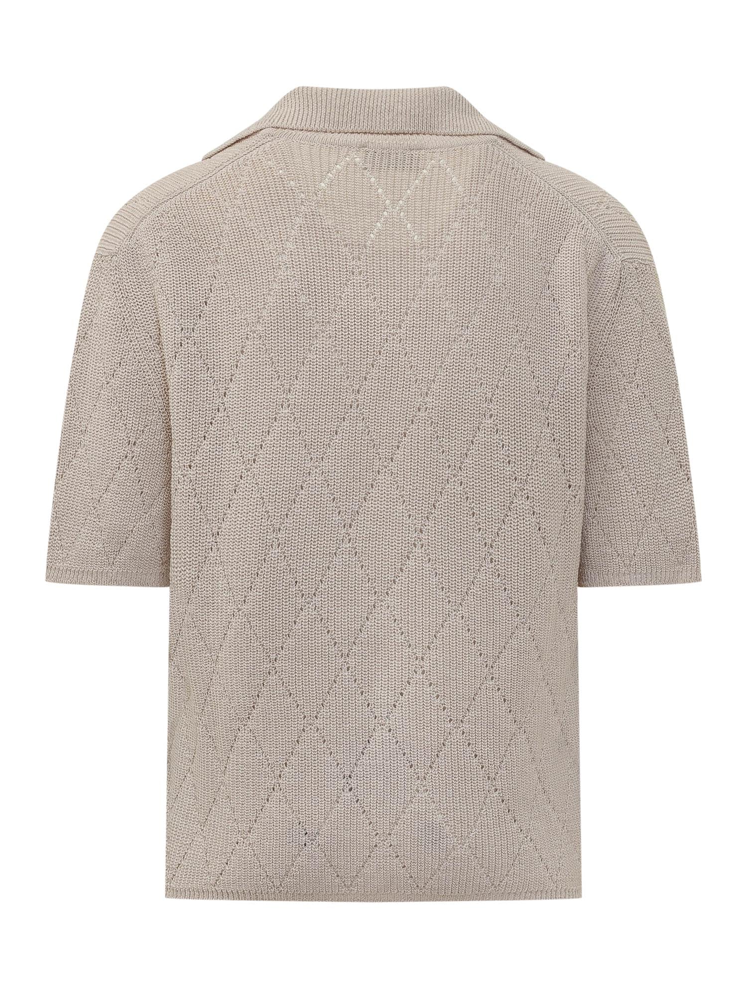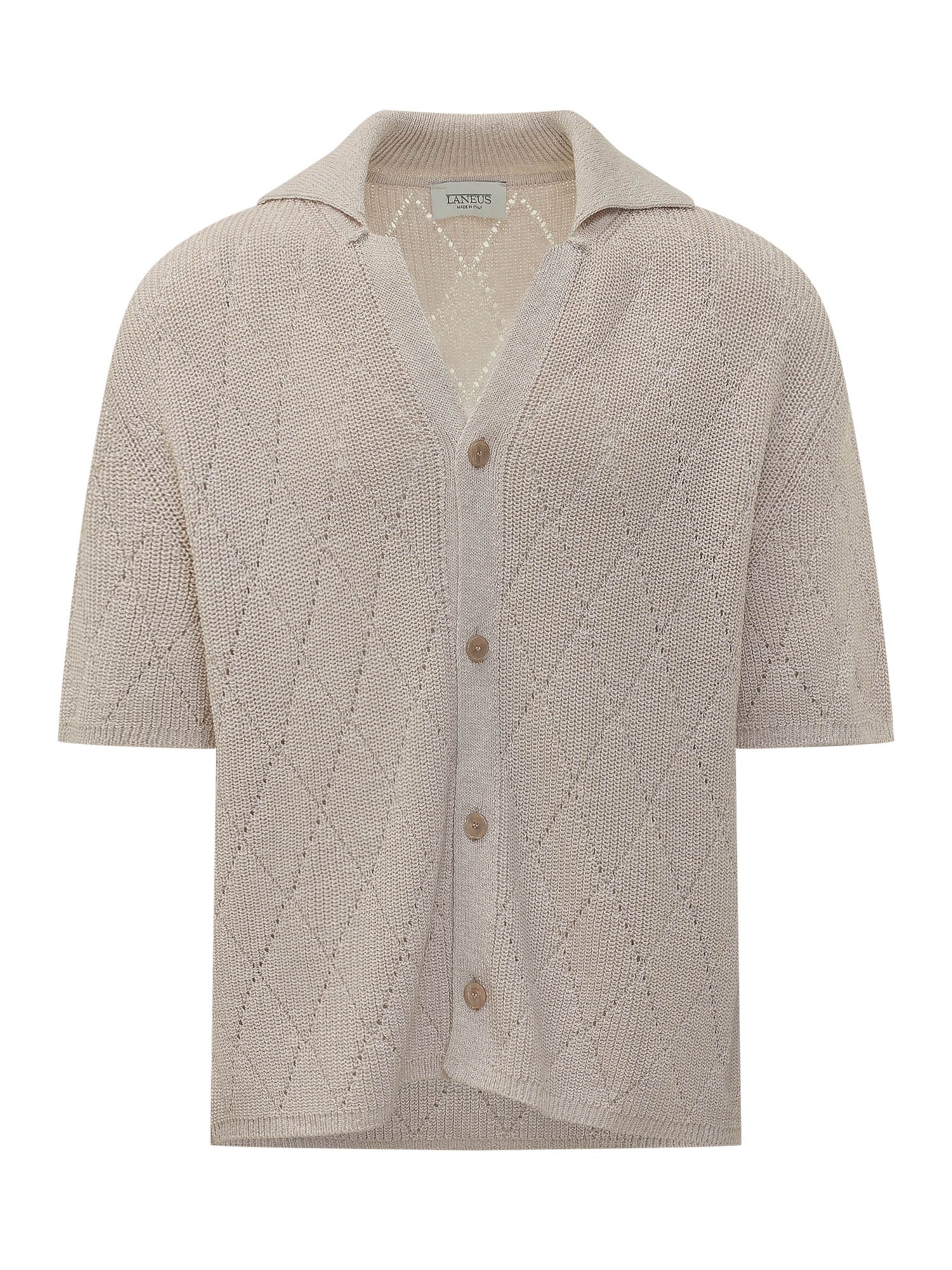 Camicia in maglia a maniche corte in tonalità beige, caratterizzata da una raffinata lavorazione traforata con motivo geometrico tono su tono. Realizzata in filato leggero, presenta colletto classico, chiusura frontale con bottoni e finiture a costine. Il design essenziale e la texture delicata la rendono perfetta per look estivi eleganti e contemporanei.