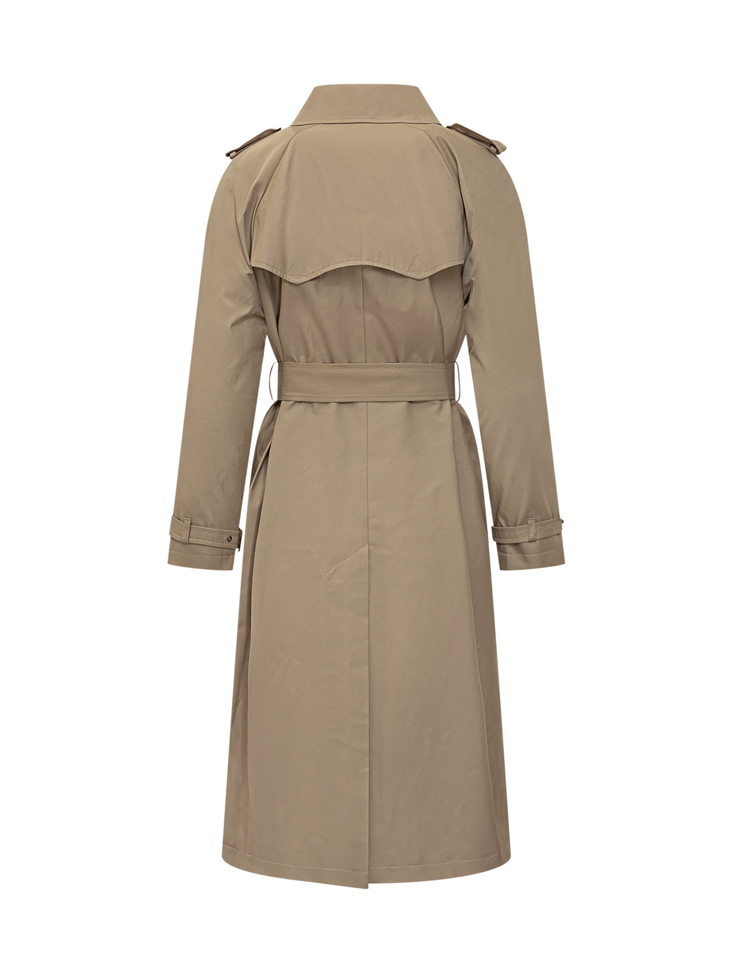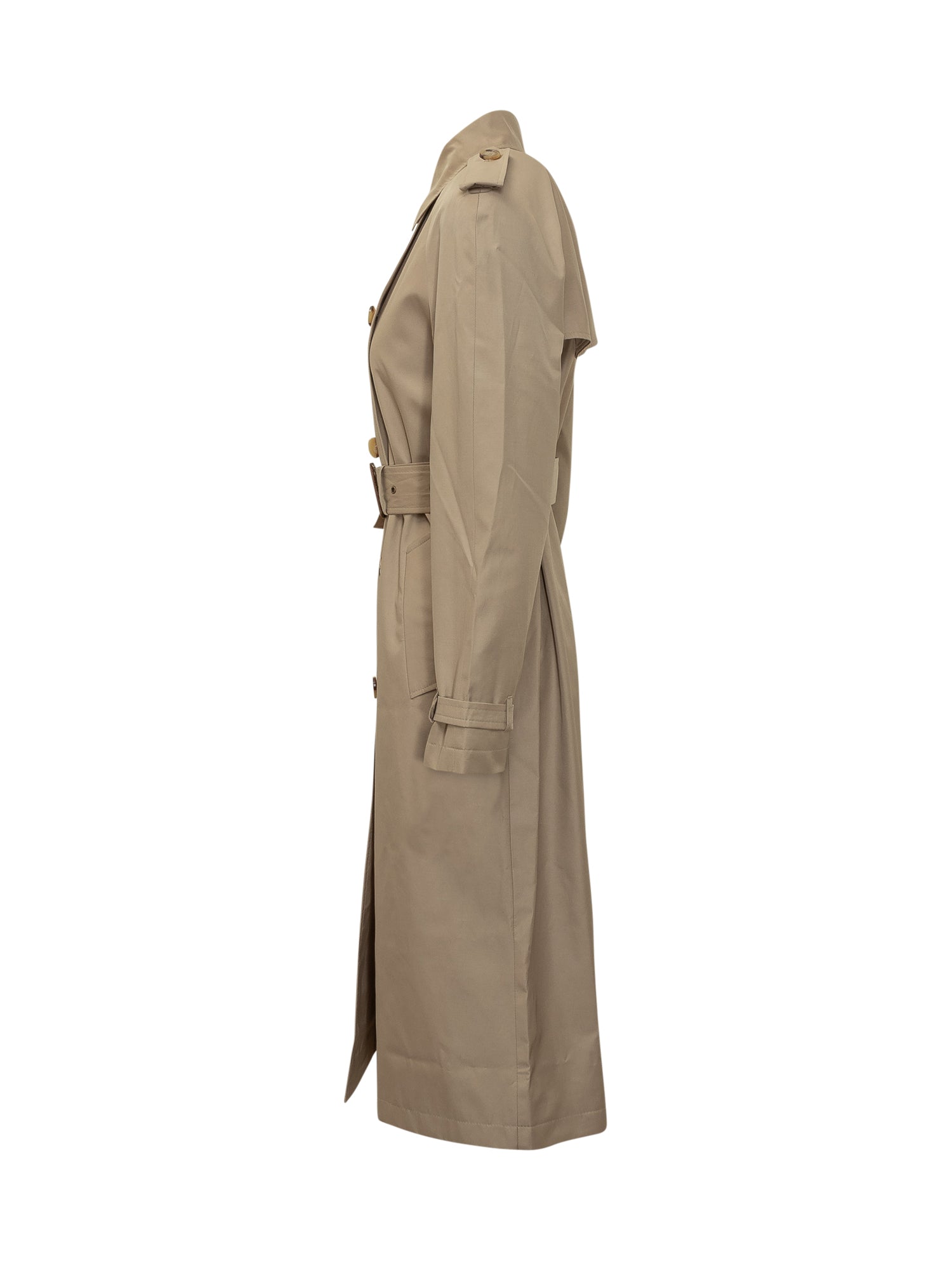 Trench Lauren Ralph Lauren da donna in cotone beige, doppiopetto con cintura in vita e dettagli regolabili ai polsini.