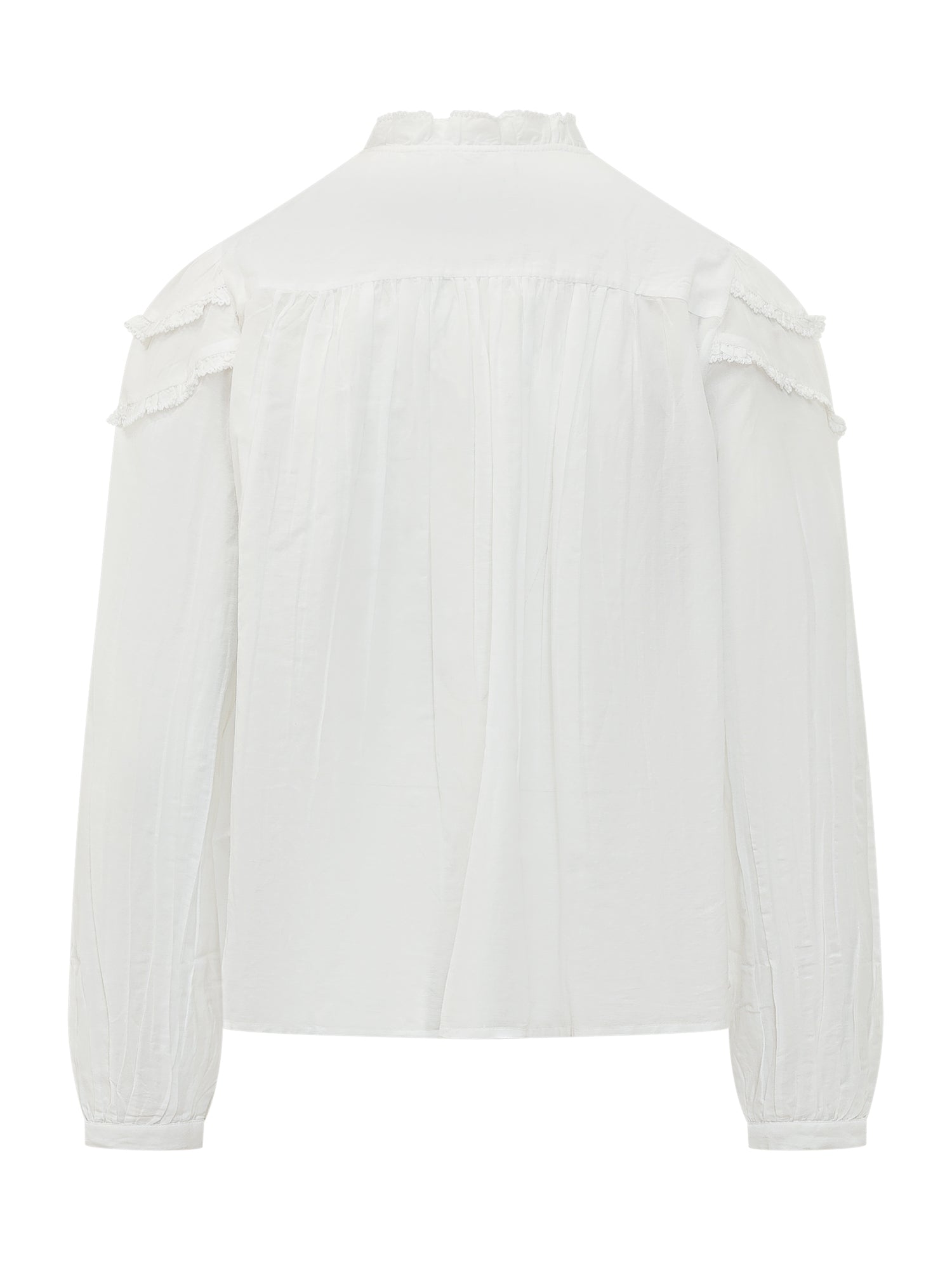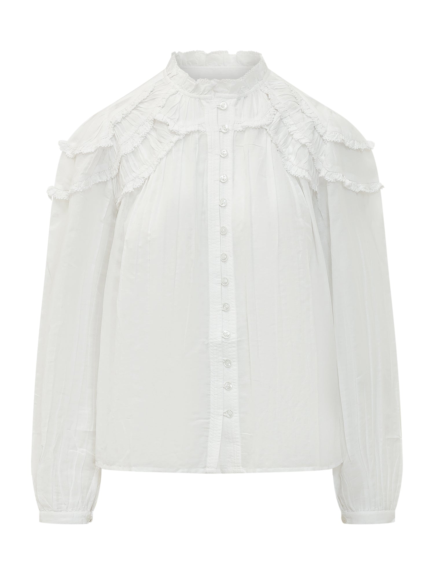 Camicia a maniche lunghe con collo alto arricciato e chiusura frontale con bottoni. Le ruches aggiungono movimento al capo.