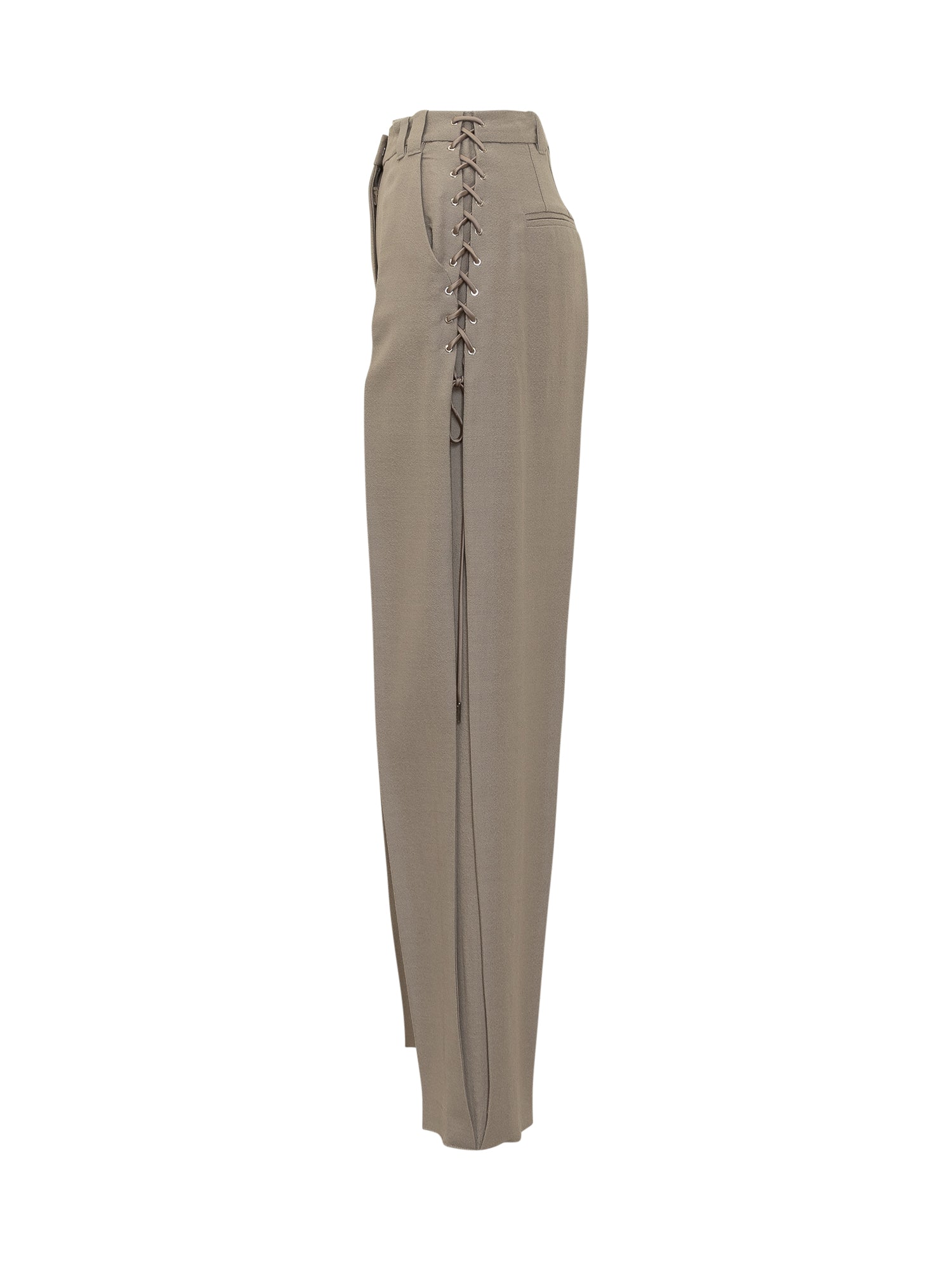 Pantaloni Marella Co-Design in tessuto taupe dalla linea dritta. Vita alta con passanti e chiusura frontale.