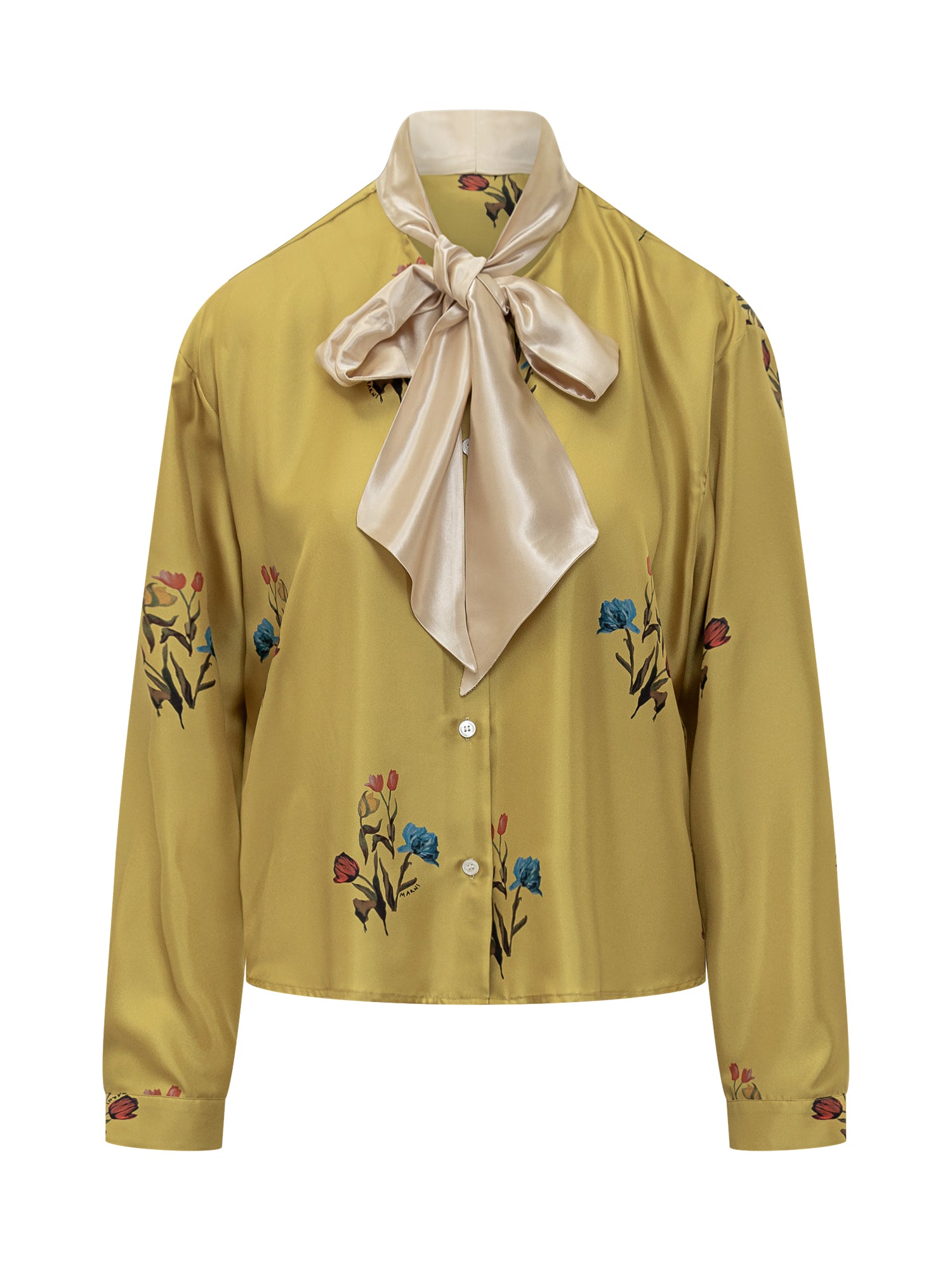 Camicia Marni in seta gialla con stampa floreale multicolore e maxi fiocco al collo in contrasto.