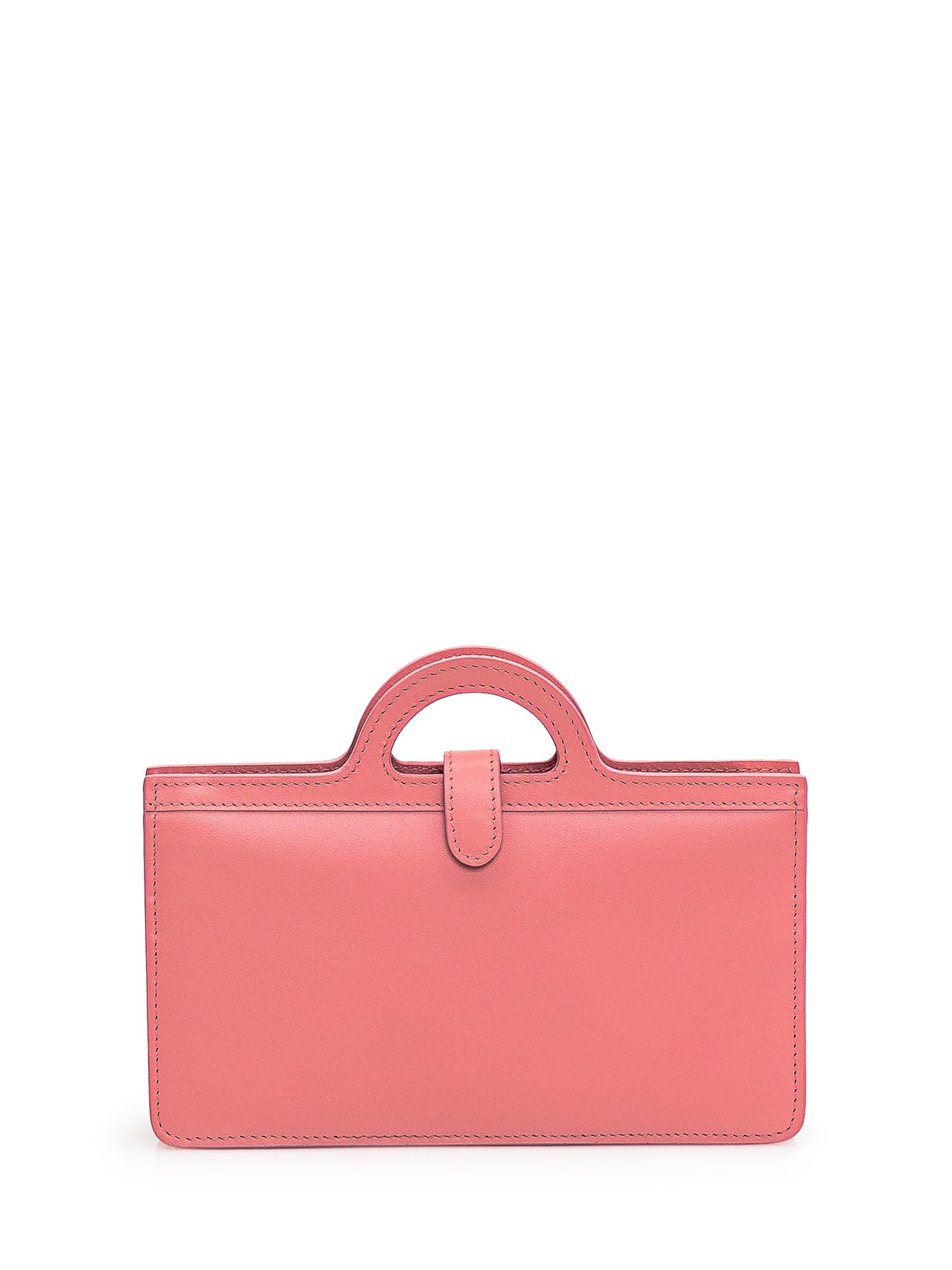 Portafoglio rosa in pelle. Due manici. Tracolla a catena. Scomparti interni per carte di credito. Tasca interna con zip. Chiusura con bottone. Logo sul davanti.