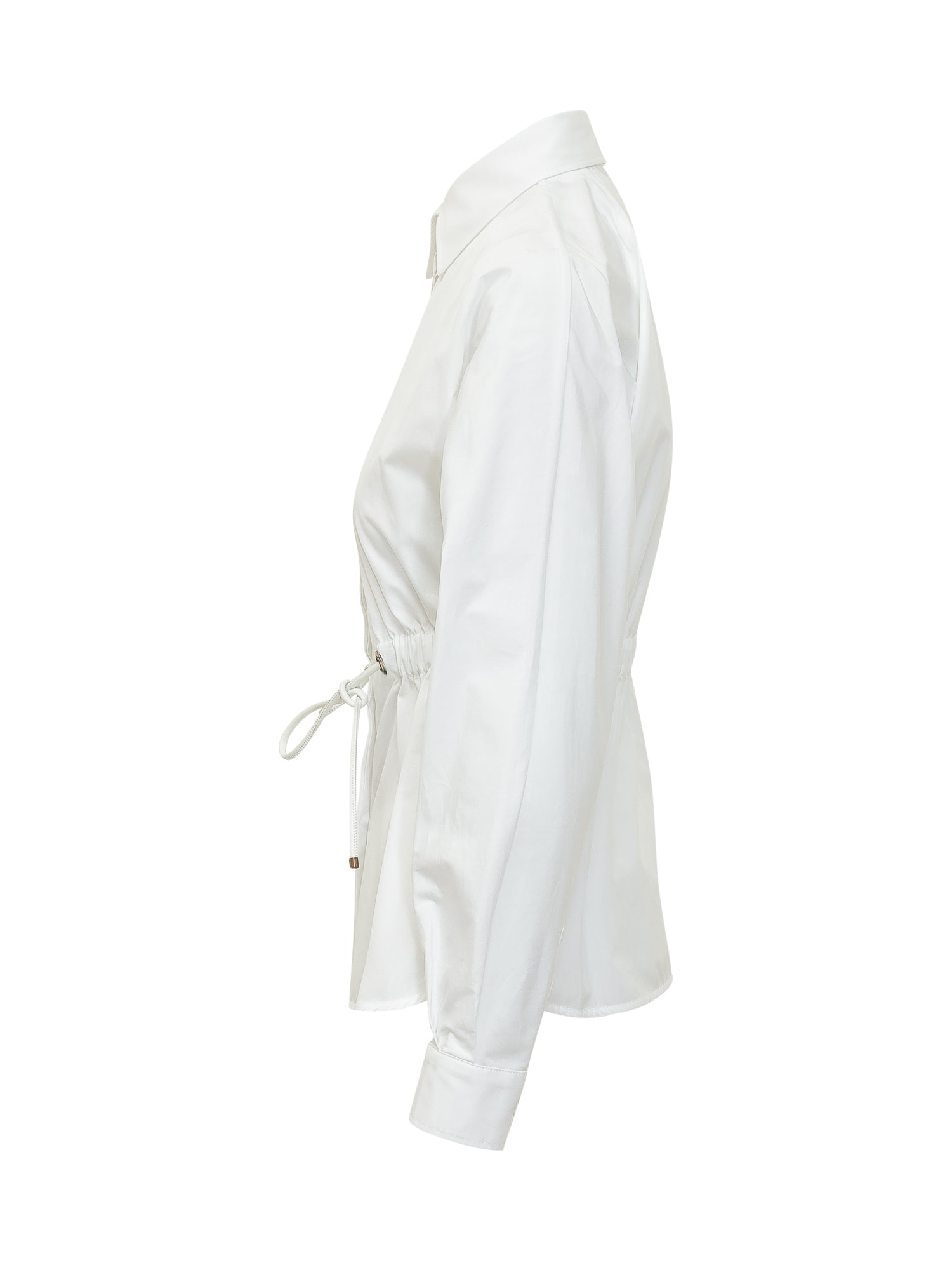 Camicia a maniche lunghe con colletto classico e chiusura frontale nascosta. Coulisse in vita con occhielli metallici e lacci regolabili. Linea sagomata e struttura leggera.