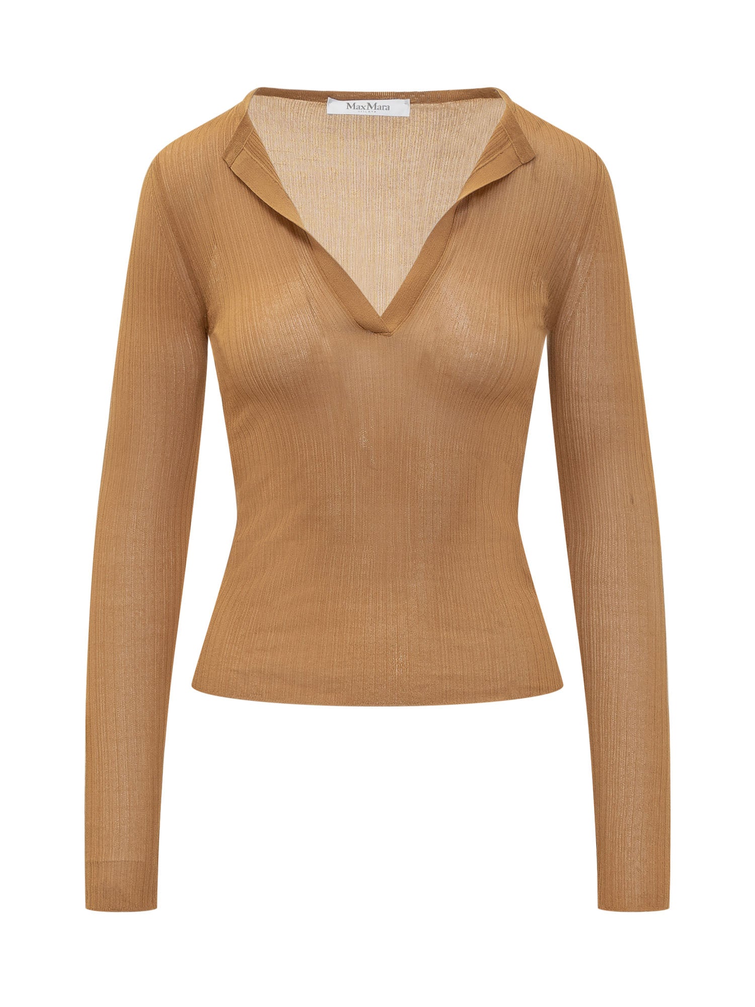 Maglia maniche lunghe in seta. Lavorazione a costine piatte. Scollo a-V.