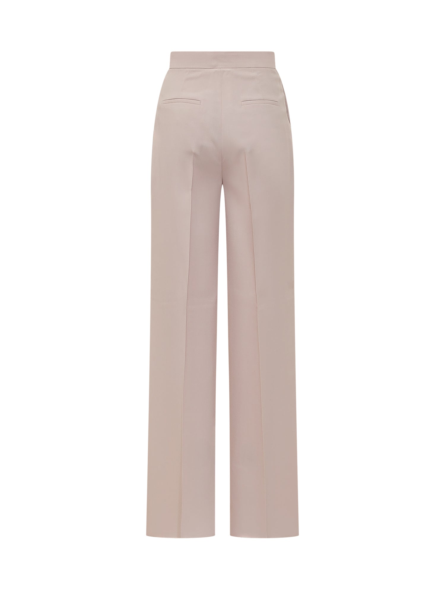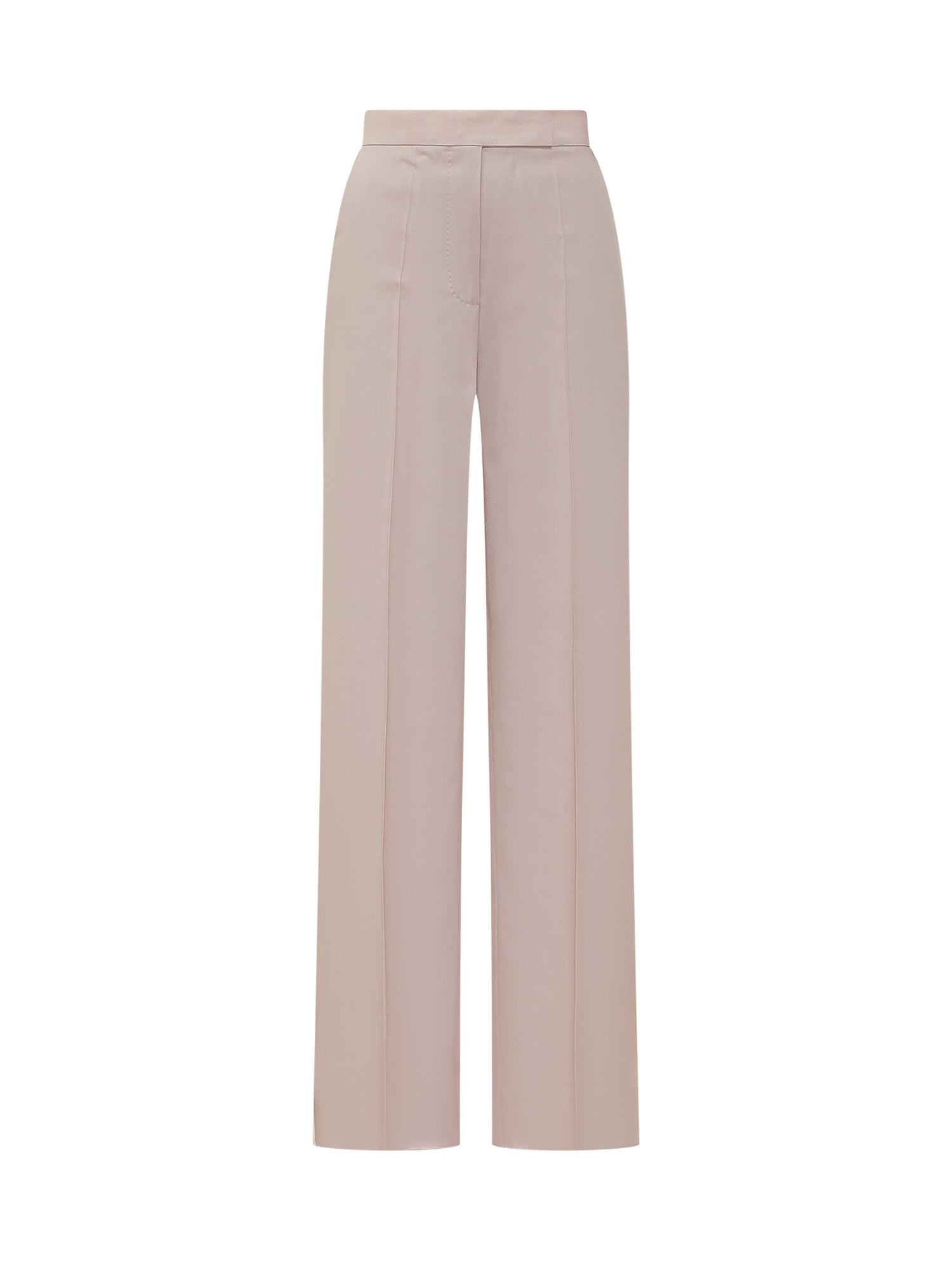 Pantalone sartoriale a vita alta con piega frontale, gamba dritta e linea pulita. Chiusura con bottone, gancio e zip.